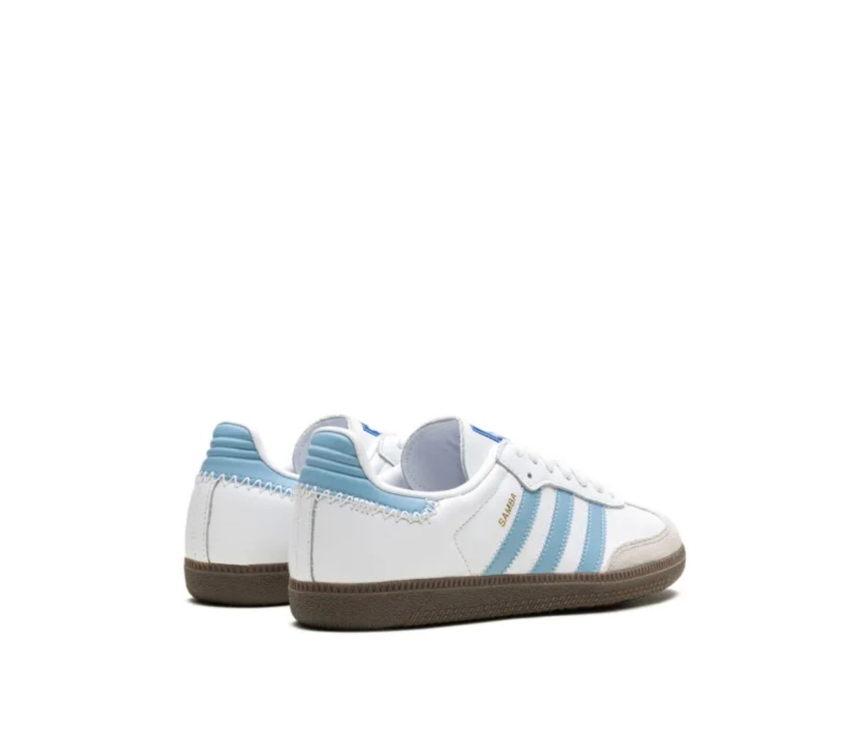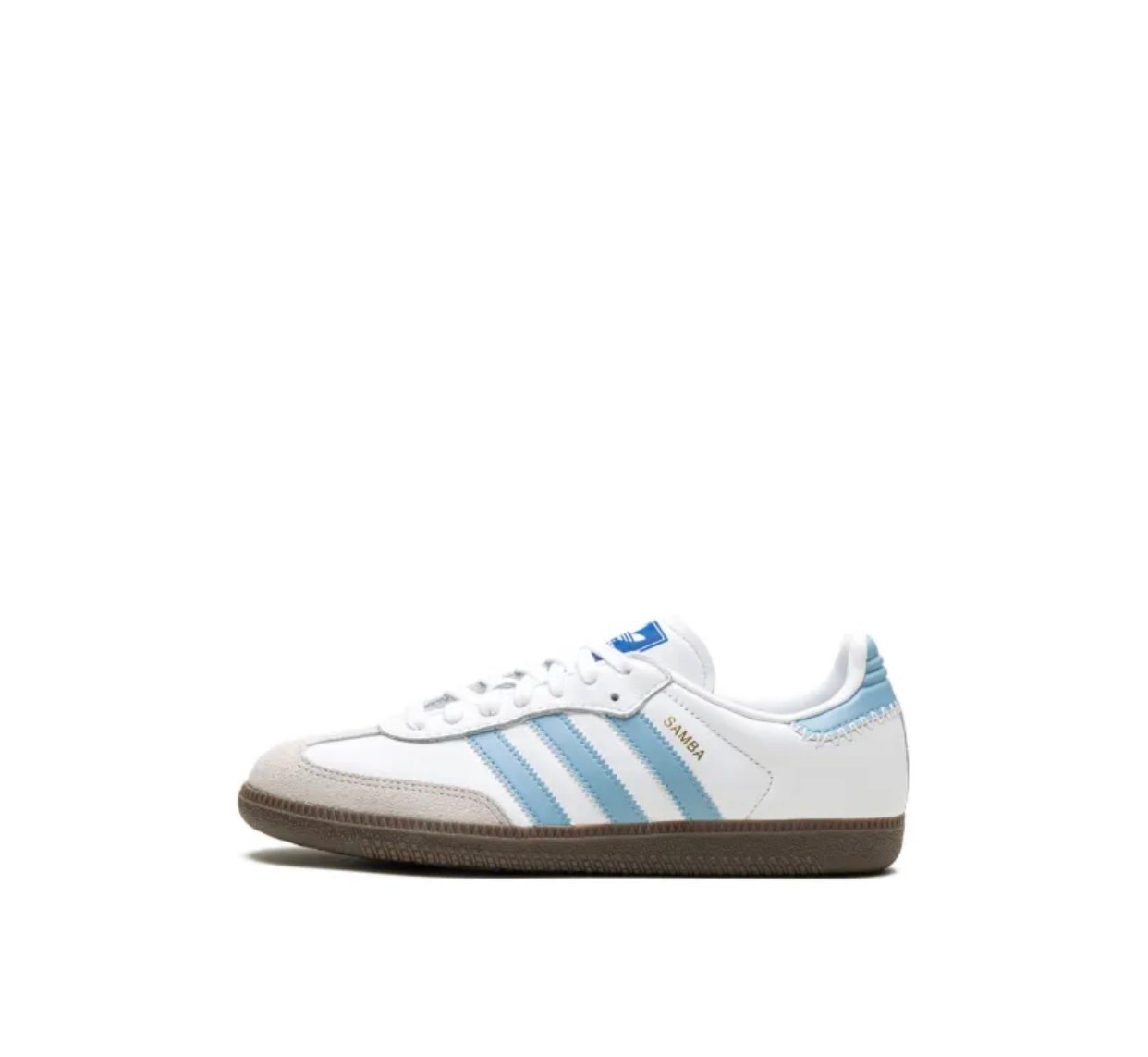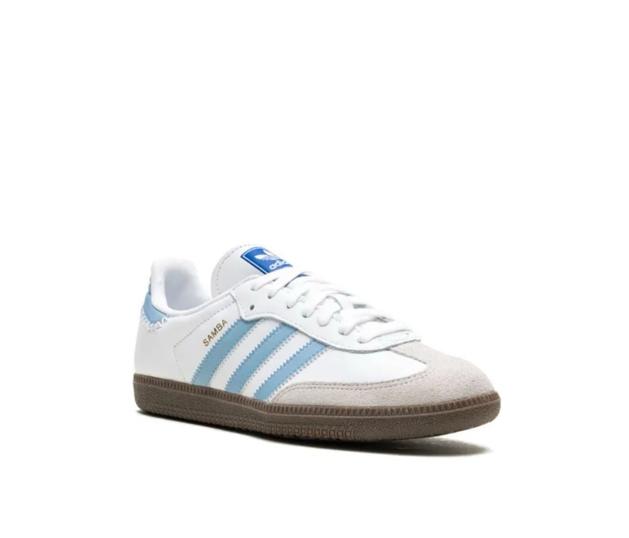 Loa adidas samba OG son un clásico atemporal de corte bajo, reconocible por su puntera en T de gamuza, están confeccionados en piel suave con refuerzos de gamuza y suela de goma natural para un gran agarre, es en color blanco con detalles azul claro en las tres franjas y el talón, e incorpora el logotipo y nombre del modelo en dorado en el lateral, size 25, Preloved.
