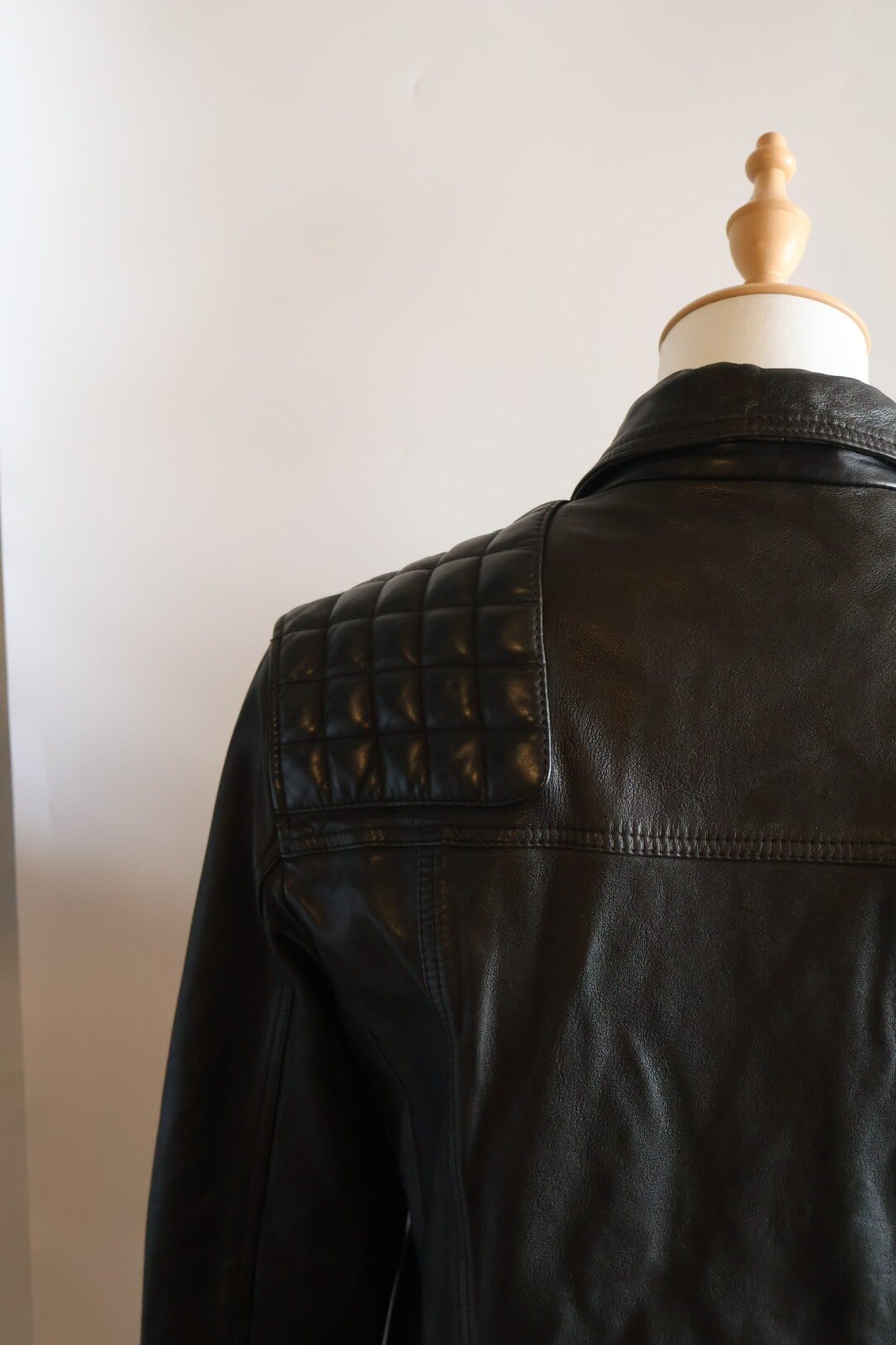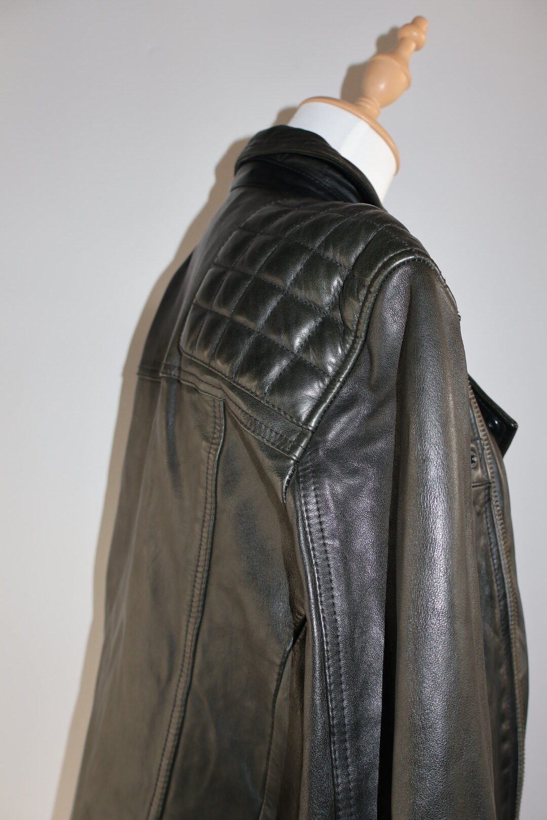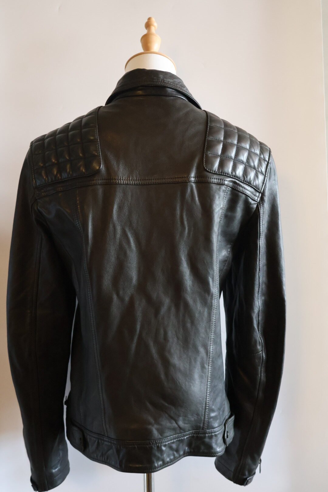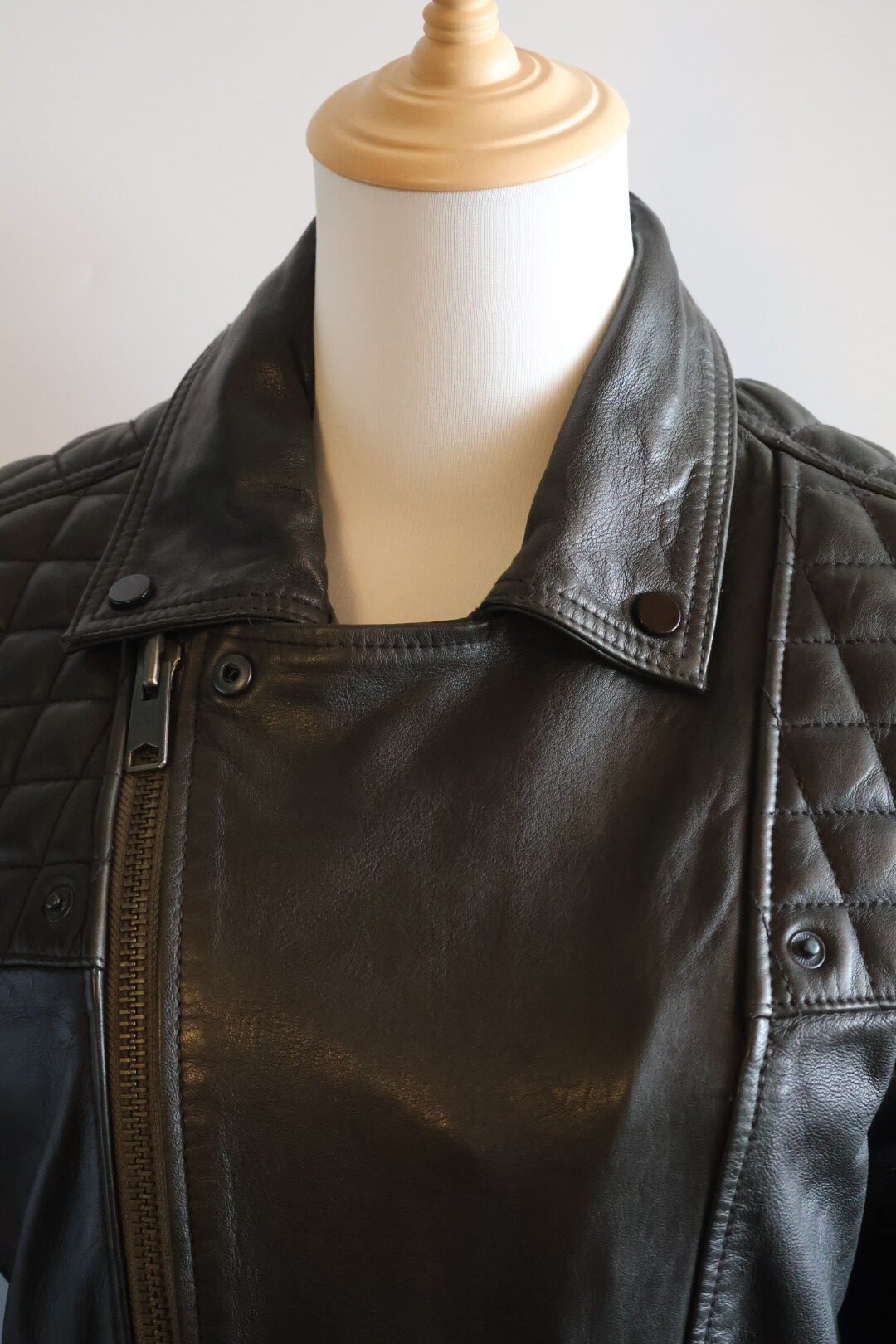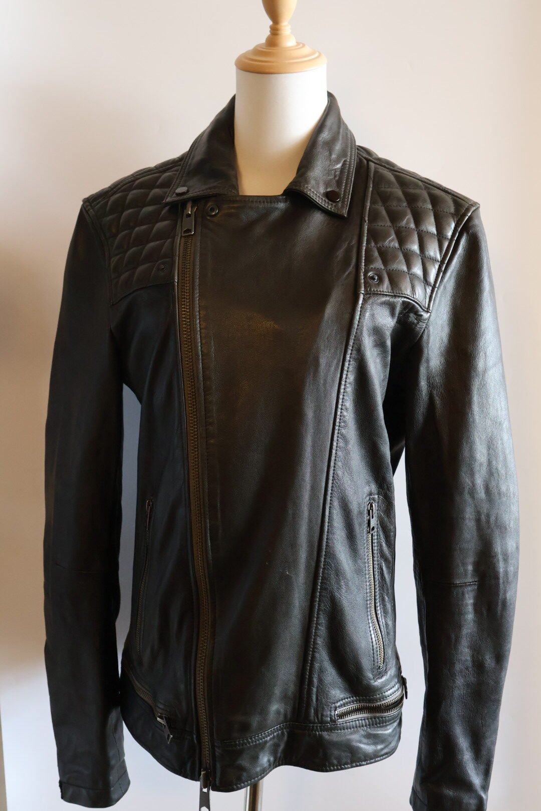 Esta es una chaqueta de cuero, en color negro con un acabado ligeramente desgastado , del estilo motociclista , presenta un cierre asimétrico , acolchonado en rombos en hombros y mangas , y un cuello con solapas y botones a presión , incluye varias cremalleras metálicas plateadas en el cierre principal , bolsillos y puños, y tiene un ajuste entallado y moderno, Preloved, size chica.