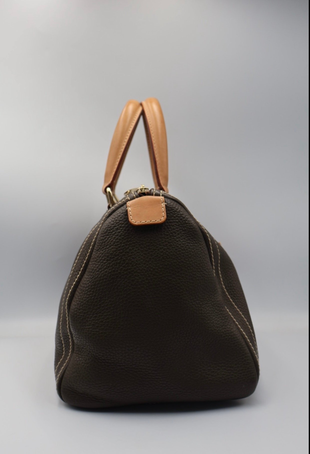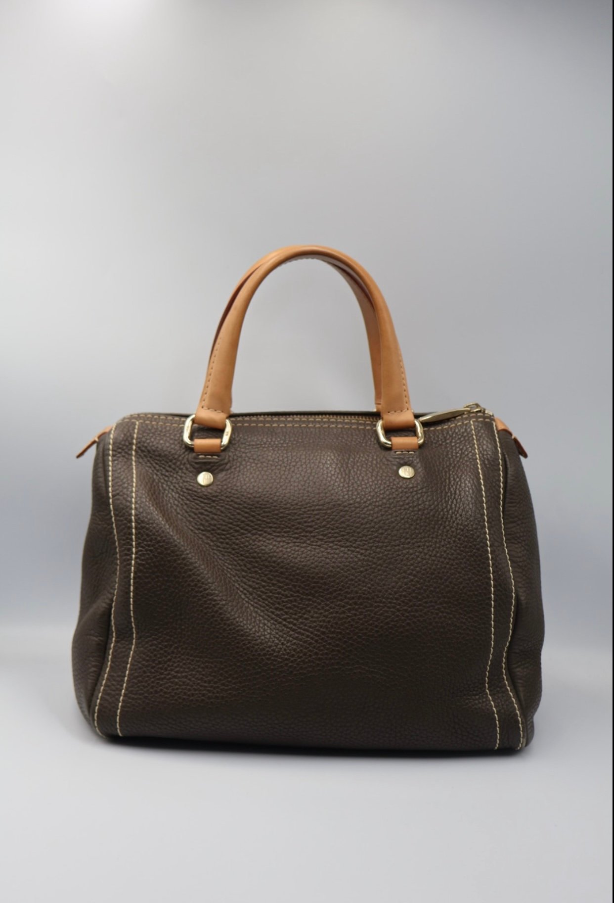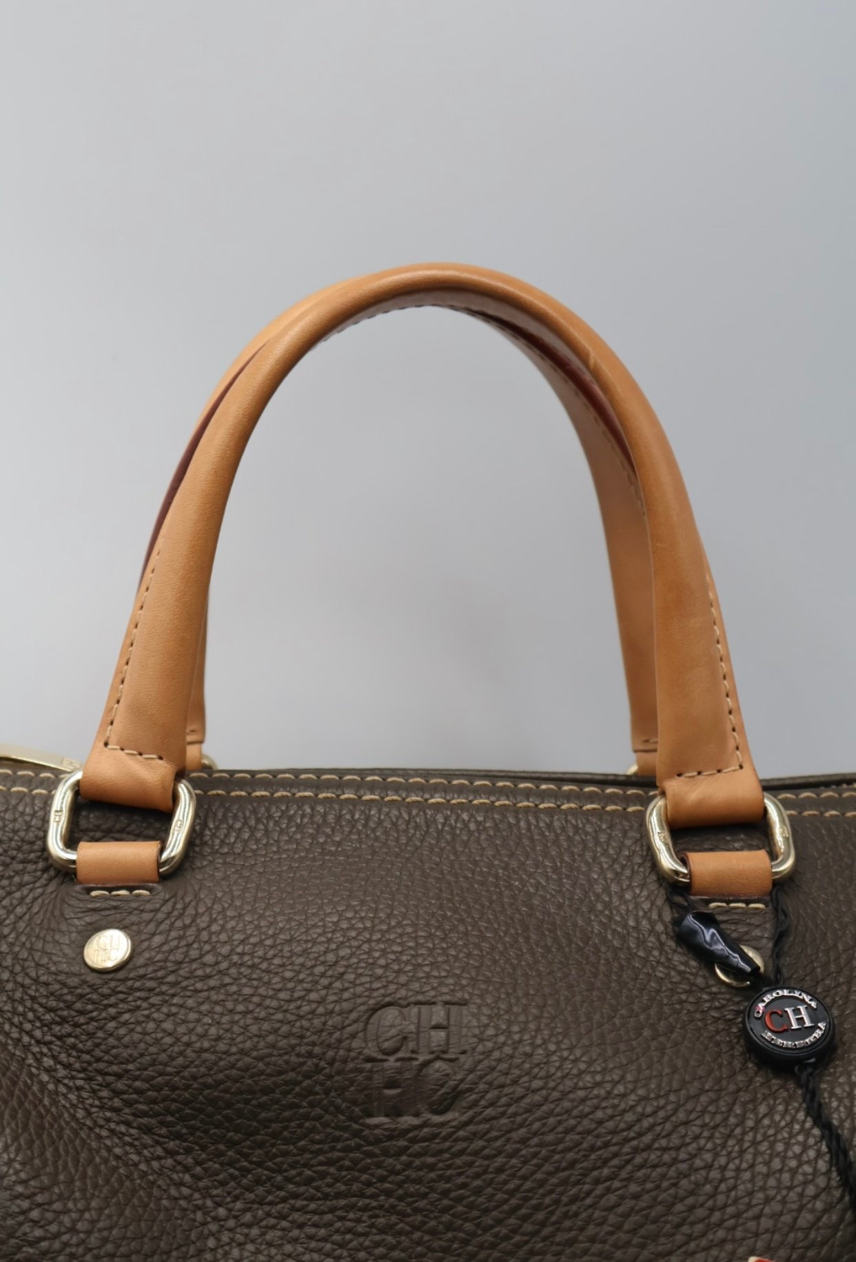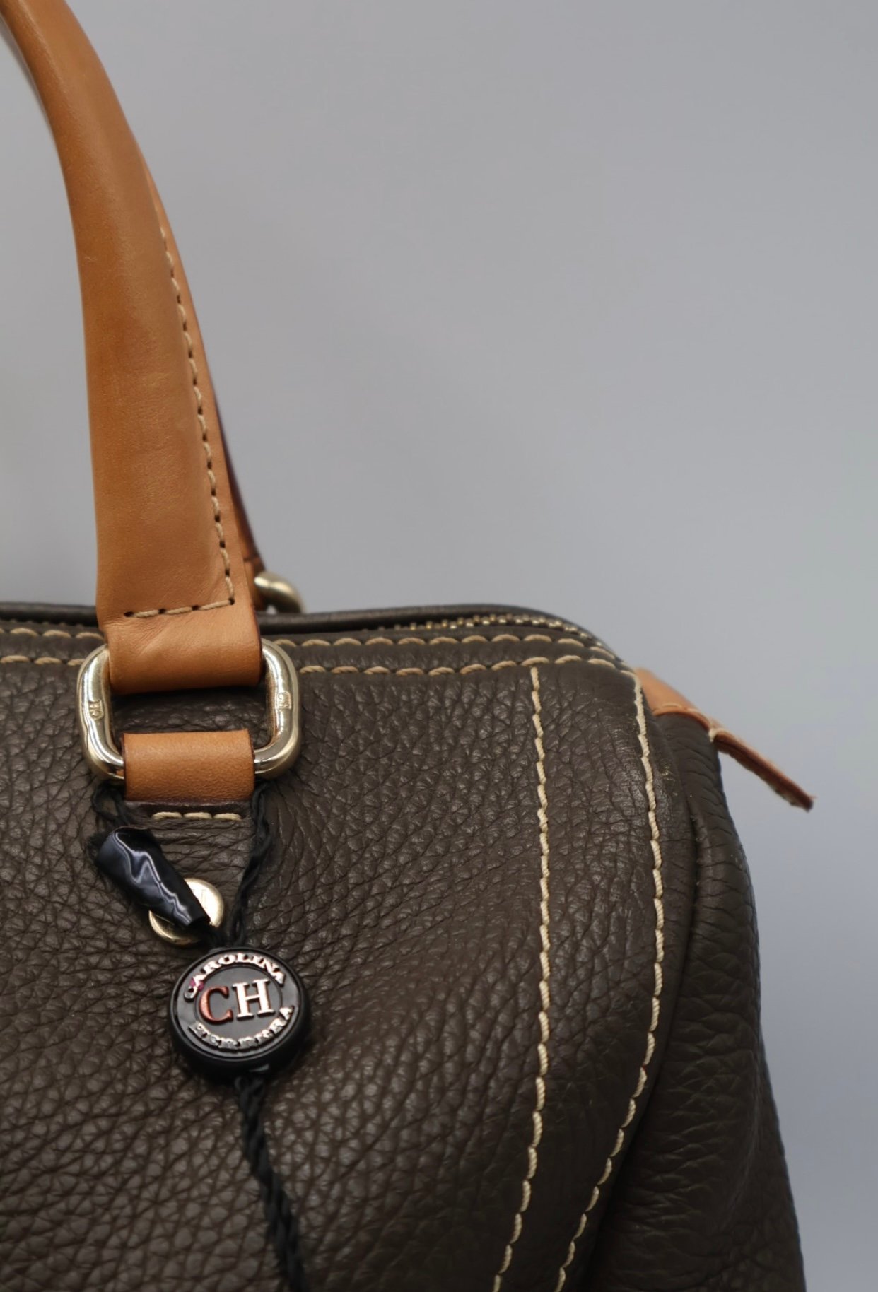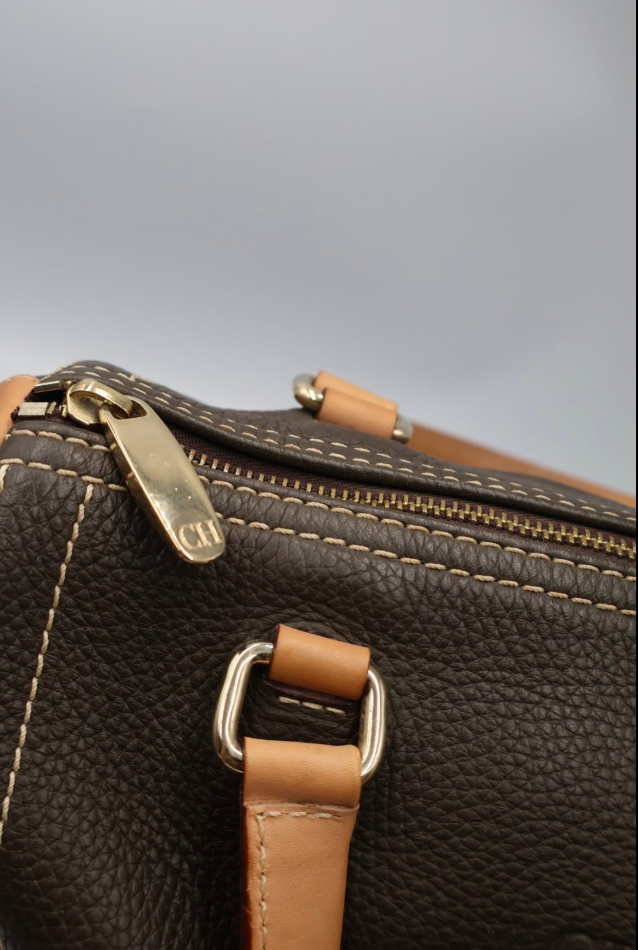 Es un bolso de mano de cuero marrón estilo bowling , elaborado de cuero marrón texturizado con costuras blancas en contraste que realzan su diseño, las iniciales de la marca CH están grabadas en el frente del bolso, cuenta con asas superiores de cuero color canela y herrajes metálicos dorados , el cierre principal es de cremallera con tirador metálico, viene fullset, con caja y cubrepolvo.
