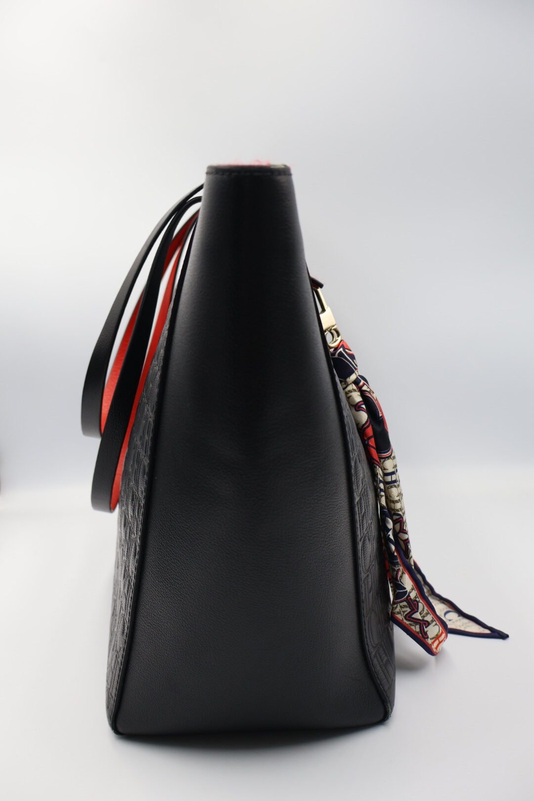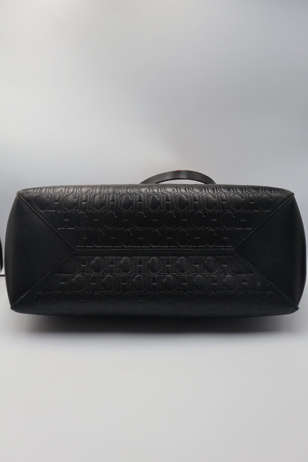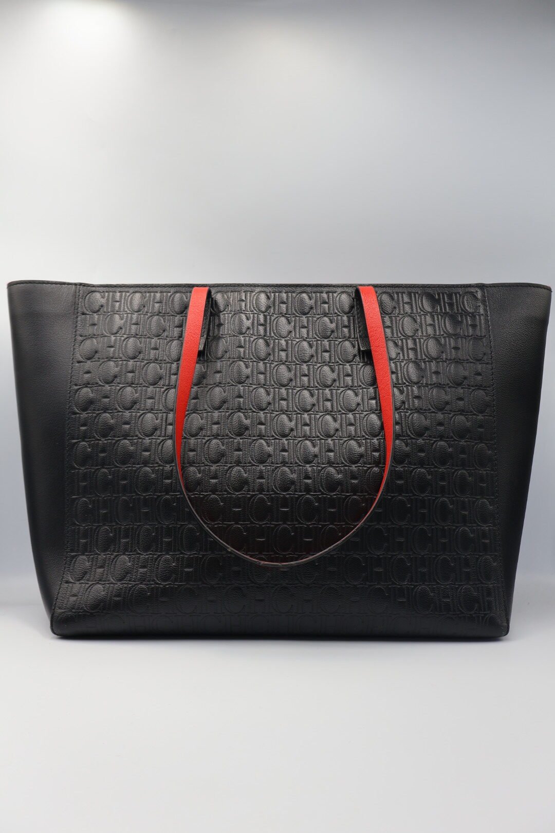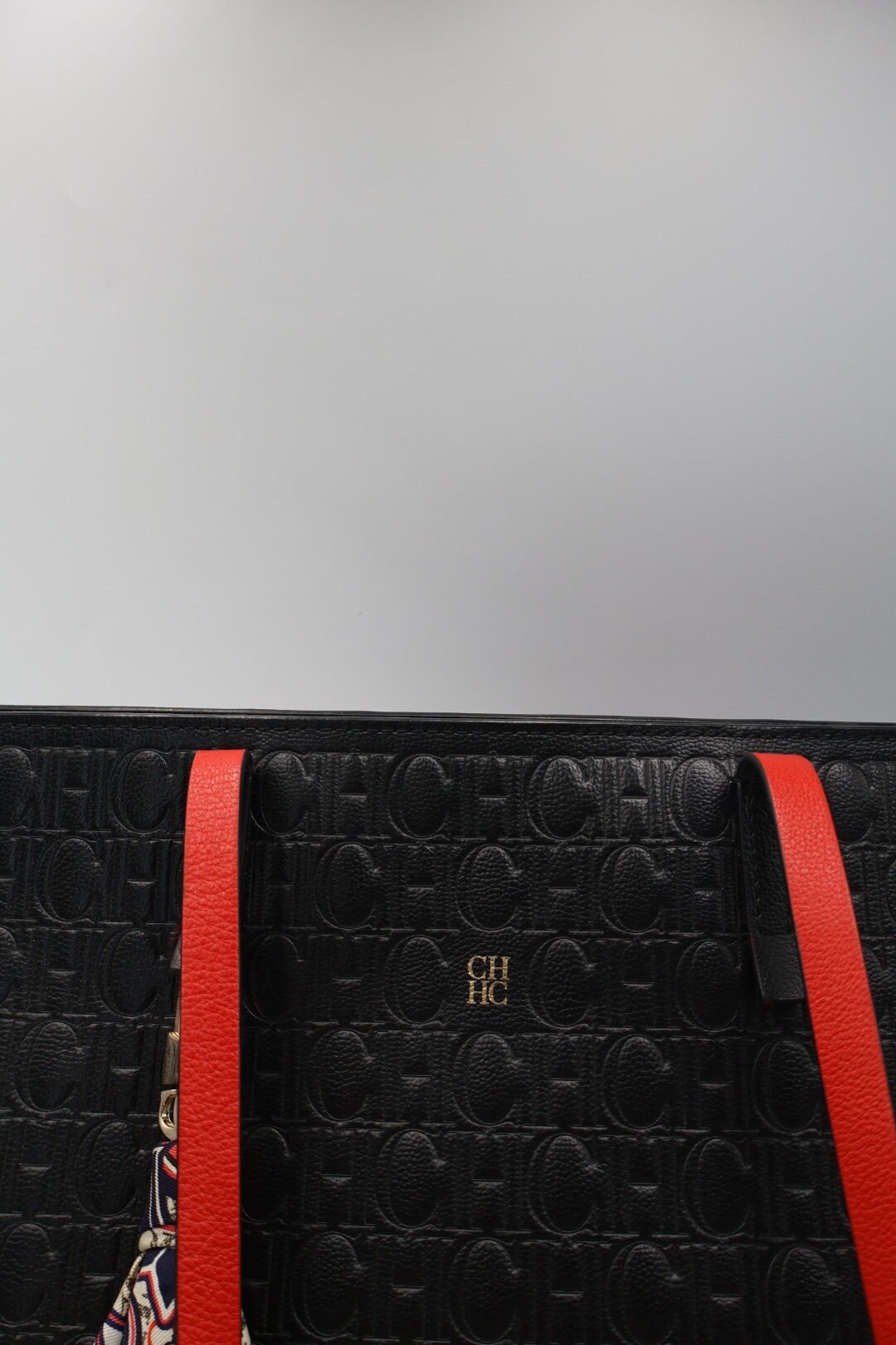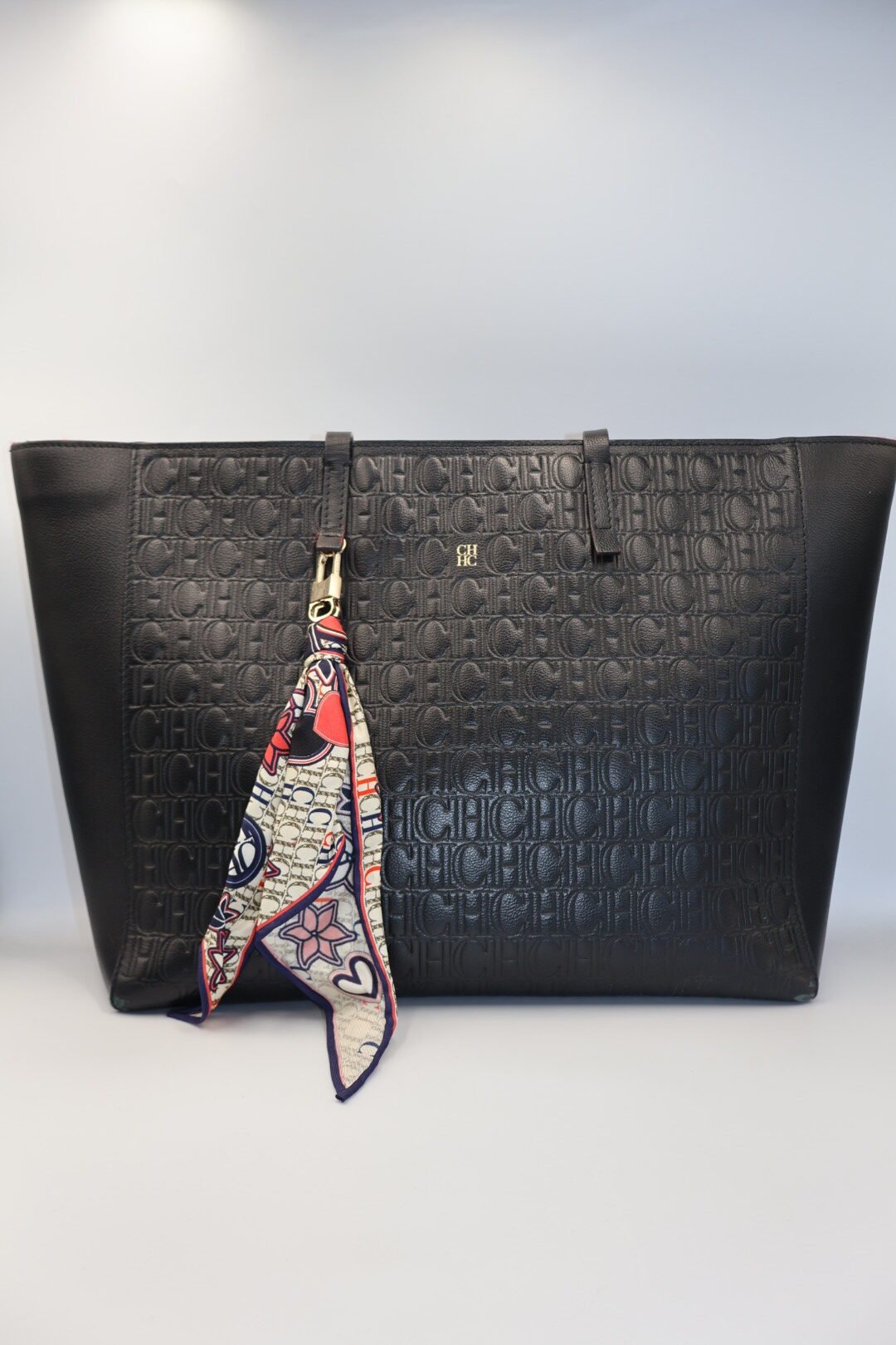 Bolso Tote con el logotipo de CH en todo el relieve de la superficie , en color negro y su interior de color rojo de piel, incluye un pañuelo multicolor con estampados de corazones florares y el logotipo de la marca esta atado a una de las asas, es un accesorio de moda elegante y versátil, Preloved, solo incluye cubrepolvo.