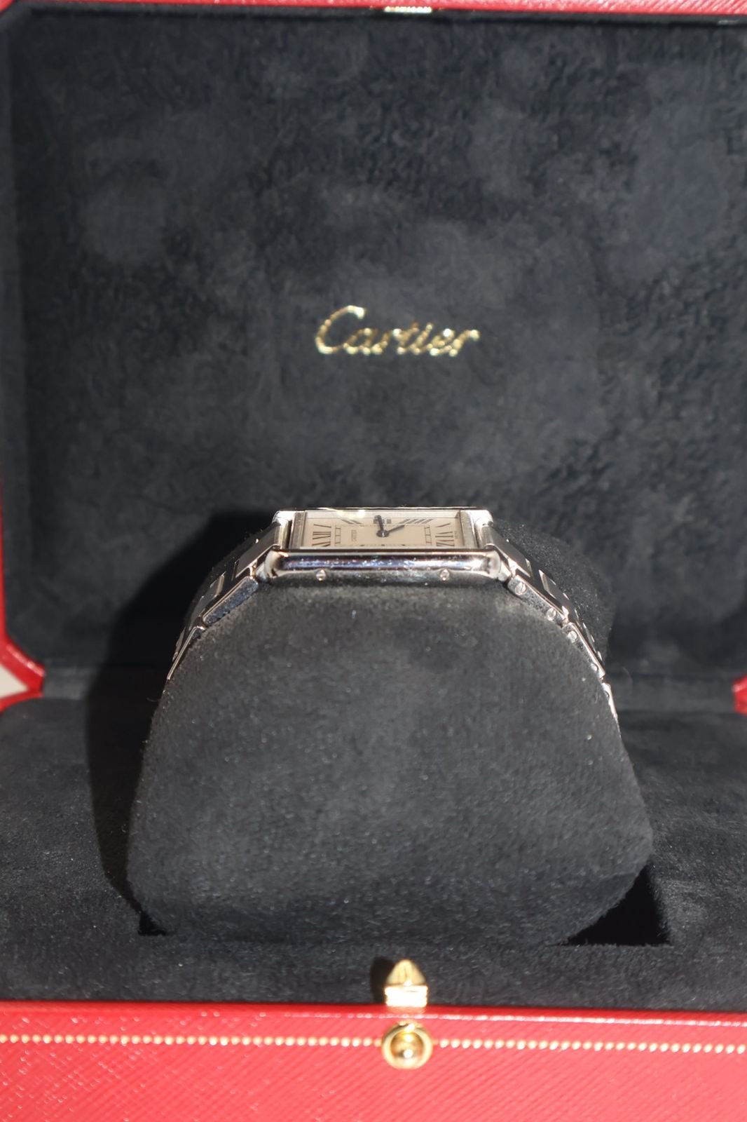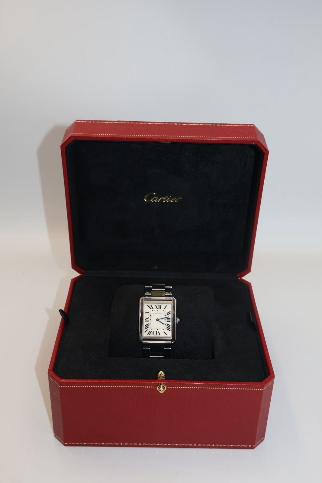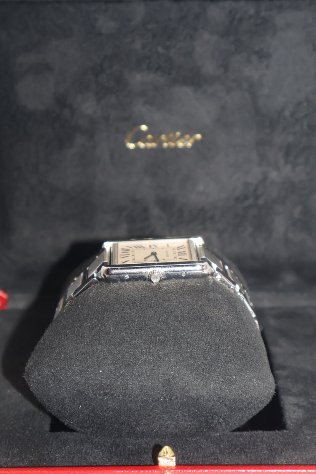 El reloj Cartier Talk Must Solarbeat es un aversion moderna de un reloj icónico creado por Louis Cartier en 1917, inspirados en los tanques de la Primera Guerra Mundial, mantiene su diseño clásico de caja rectangular con lineas limpias y elegantes , esfera plateada con agujas azuladas y corona con cabujón, , este modelo incorpora un movimiento fotovoltaico Solarbeat , que funciona con luz y evita cambios frecuentes de batería , esta fabricado en acero, con brazalete del mismo material mide 33,7 x 25,5 mm con 6,6 mm de grosor y es resistente al agua hasta 30 metros, Preloved.