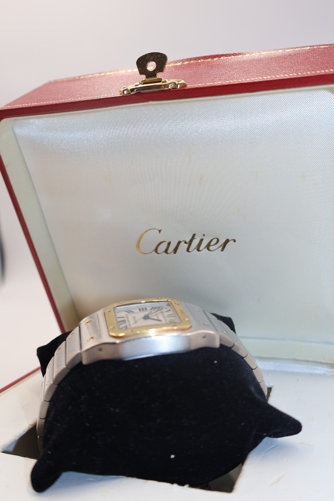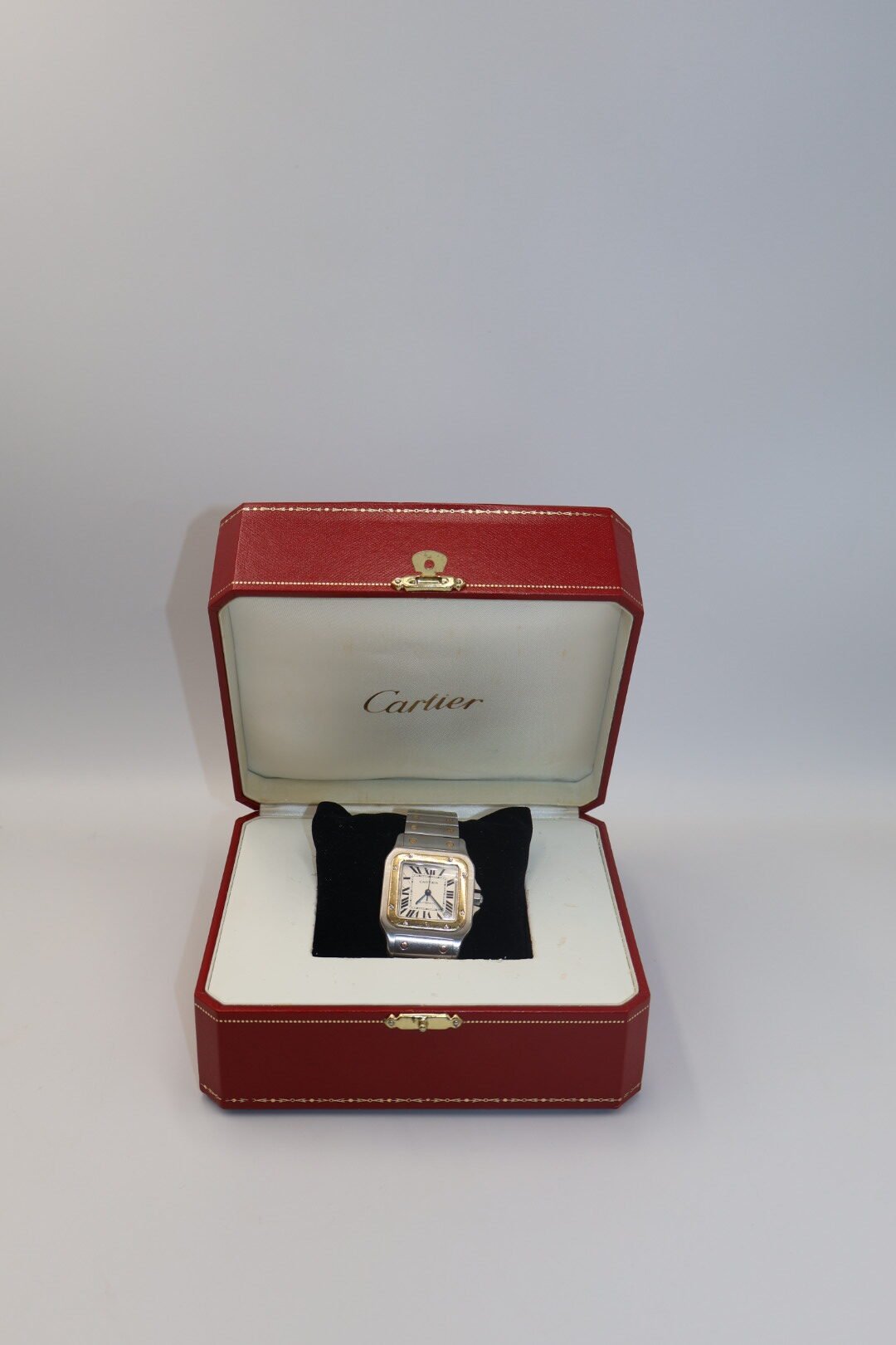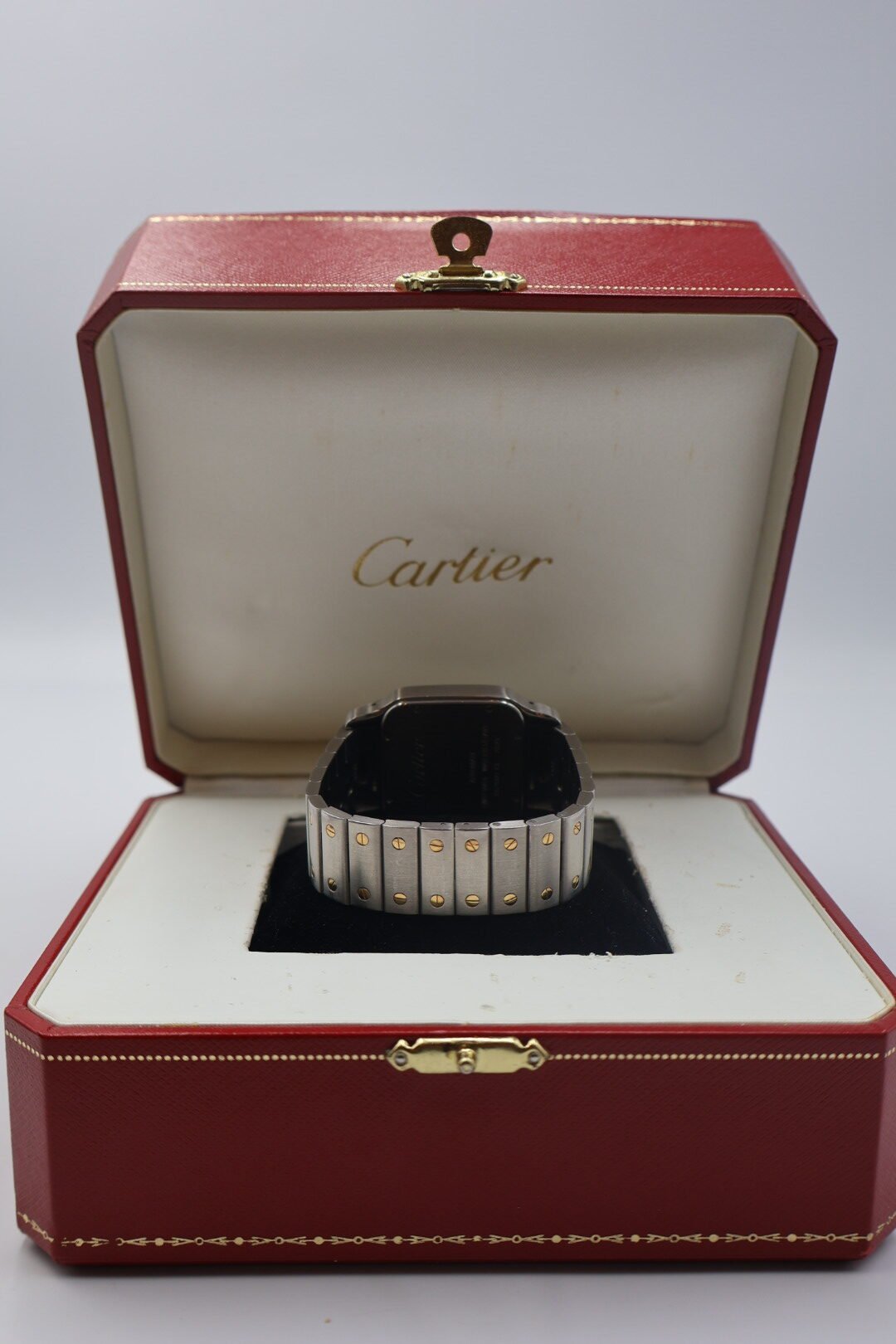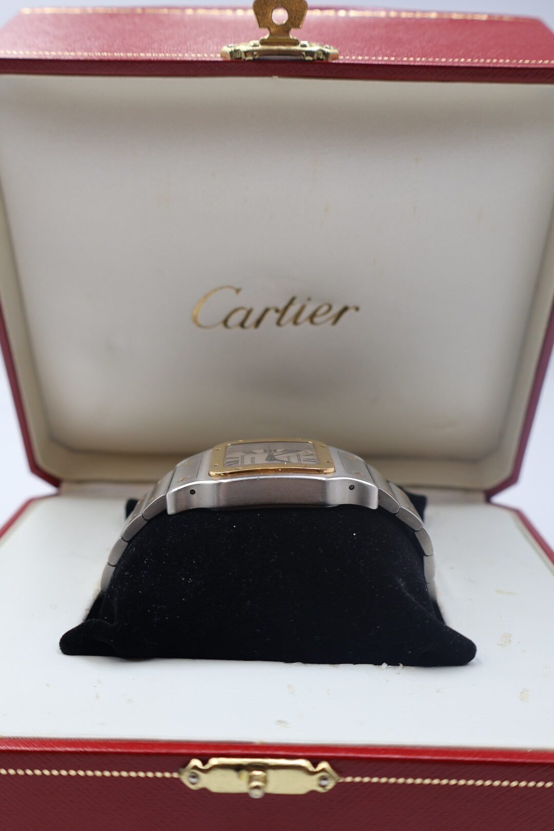 Cartier Santos Galbée, un diseño icónico que combina acero inoxidable con detalles en oro de 18 quilates. Este modelo es una evolución del Santos original de 1904, caracterizado por su caja cuadrada de ángulos redondeados y sus distintivos tornillos expuestos tanto en el bisel como en el brazalete referencia: Comúnmente identificado como ref. 2823 para la versión XL ,materiales: caja y brazalete de acero con oro amarillo (dos tonos).Esfera: Blanca u opalina con números romanos, agujas de acero azulado en forma de espada y cristal de zafiro, movimiento: Esta versión suele ser automática, aunque existen variantes de cuarzo. (preloved)
