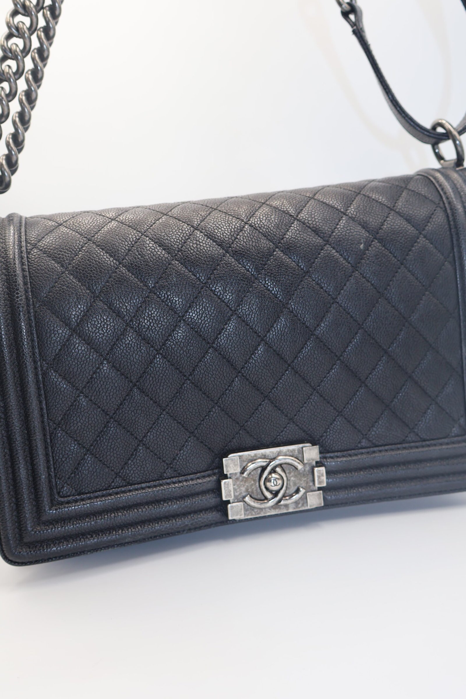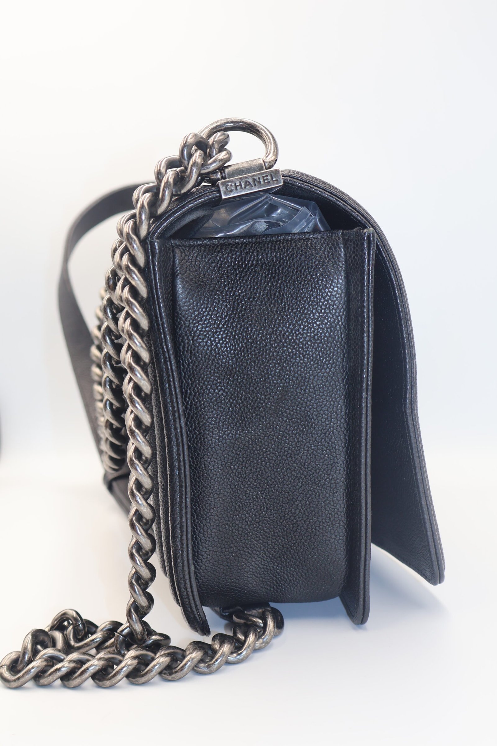 Bolso Chanel Boy, inspirada en el gran amor de coco Chanel, redefine la sofisticación con un toque andrógino y moderno, esta pieza icónica confeccionada en piel negra premium, destaca por su inconfundible acolchado de diamantes enmarcado por lineas estructuradas, con el distintivo cierre de presión CC y una robusta cadena en acabado rutenio, fusionado el lujo artesanal con una estética urbana, Preloved, solo incluye cubrepolvo.