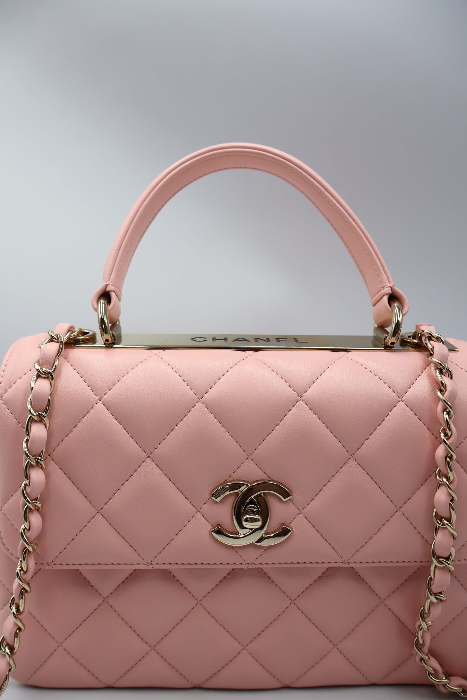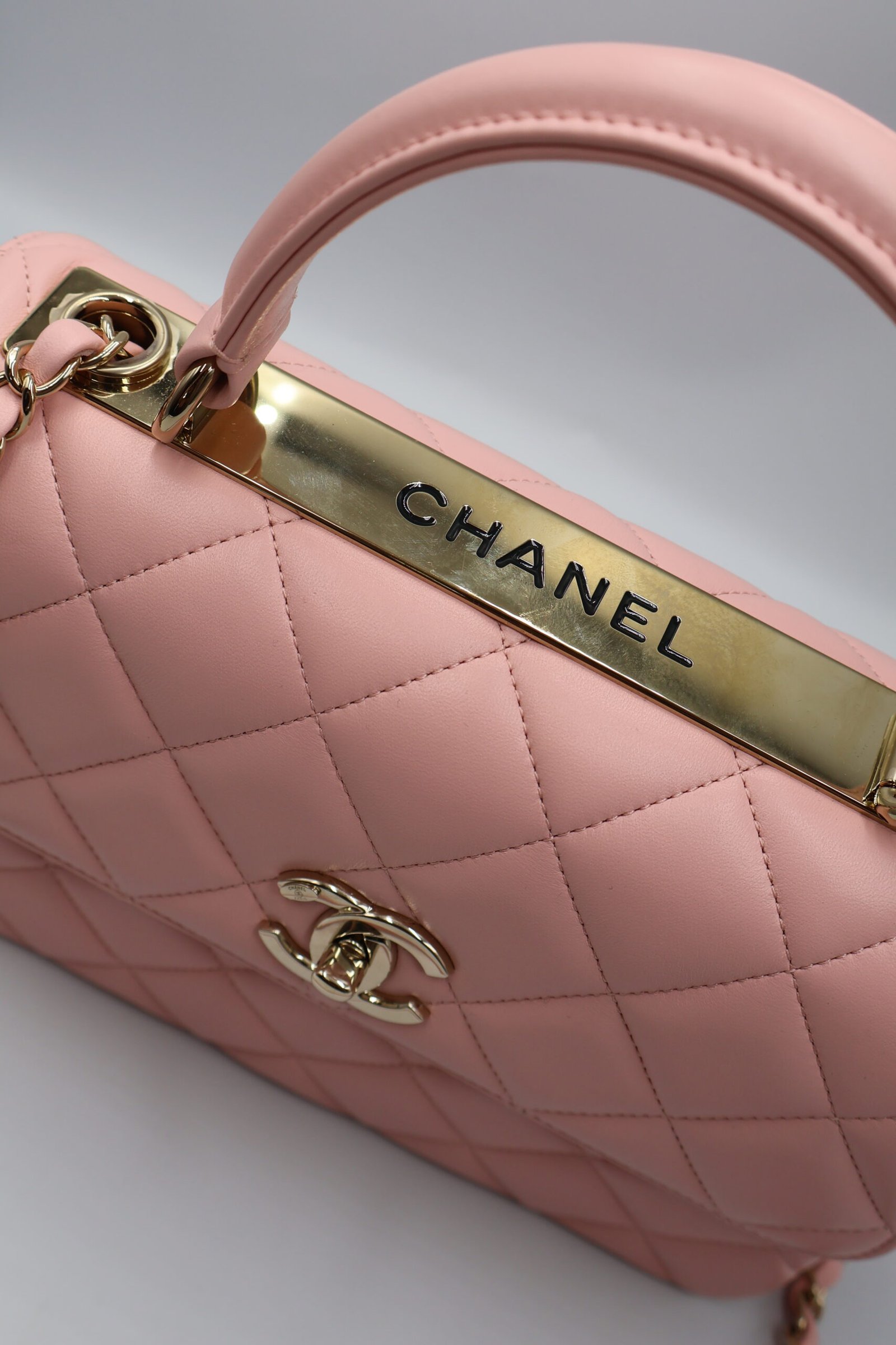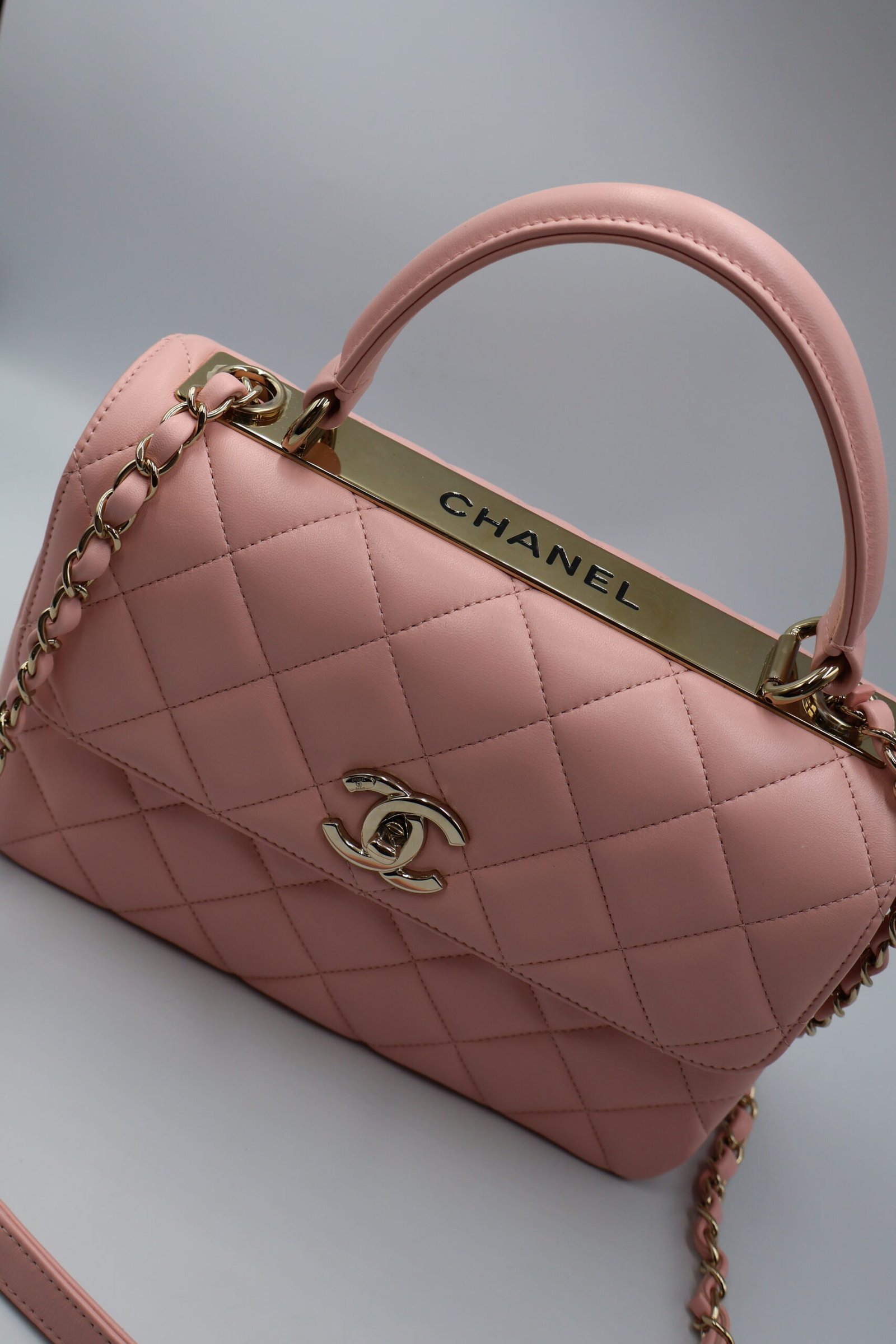El bolso es un Chanel Trendy CC Top Handle, un modelo elegante y verstail con diseño estructurado y acolchonado en color rosa, destaca por su asa por su asa superior rígida , correa de cadena con cuero , el logotipo CC en la solapa y detalles como la placa metálica interna de Chanel, Fullset, incluye cubrepolvo, caja y certificado.