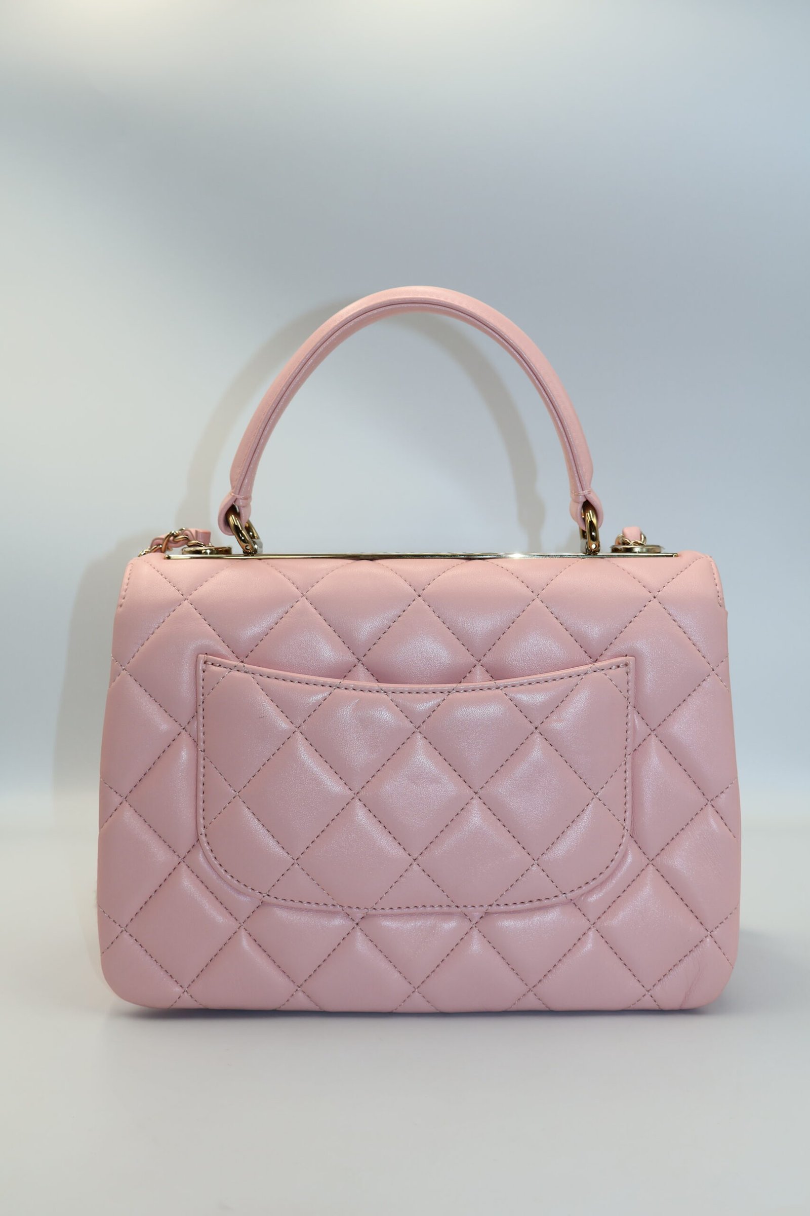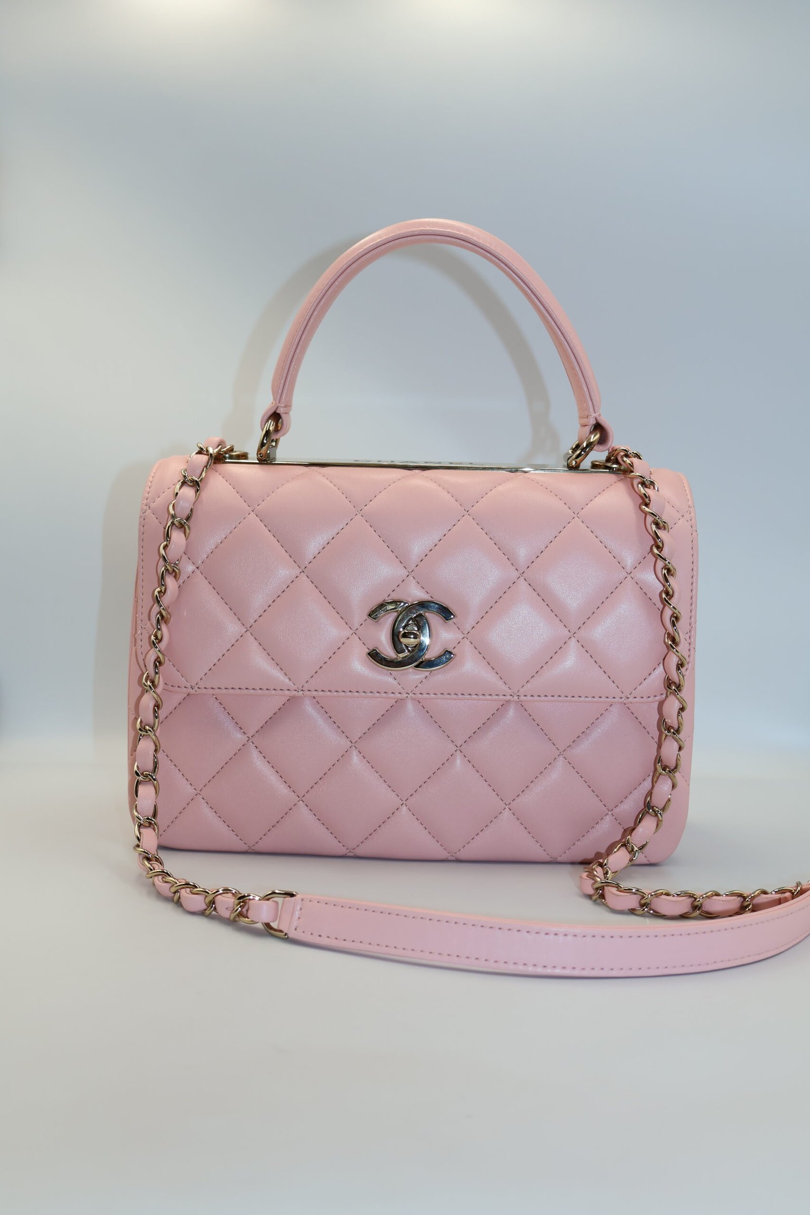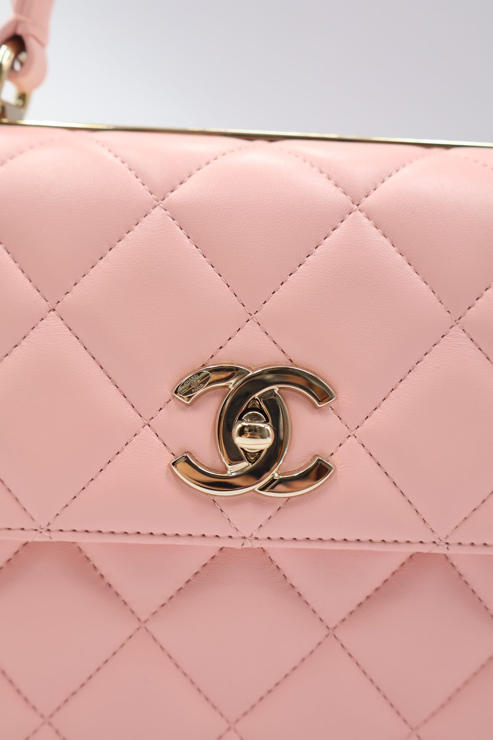 El bolso es un Chanel Trendy CC Top Handle, un modelo elegante y verstail con diseño estructurado y acolchonado en color rosa, destaca por su asa por su asa superior rígida , correa de cadena con cuero , el logotipo CC en la solapa y detalles como la placa metálica interna de Chanel, Fullset, incluye cubrepolvo, caja y certificado.