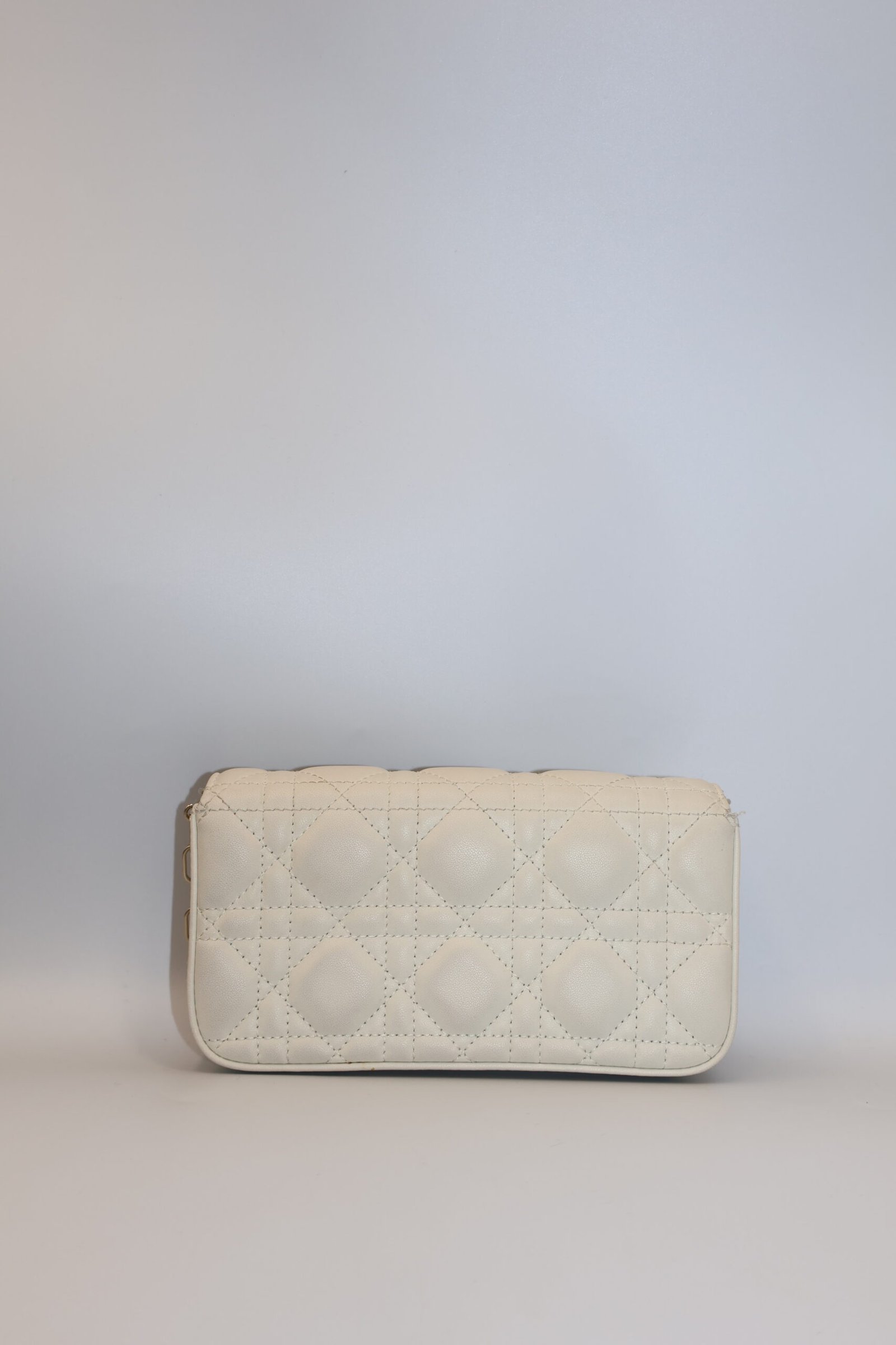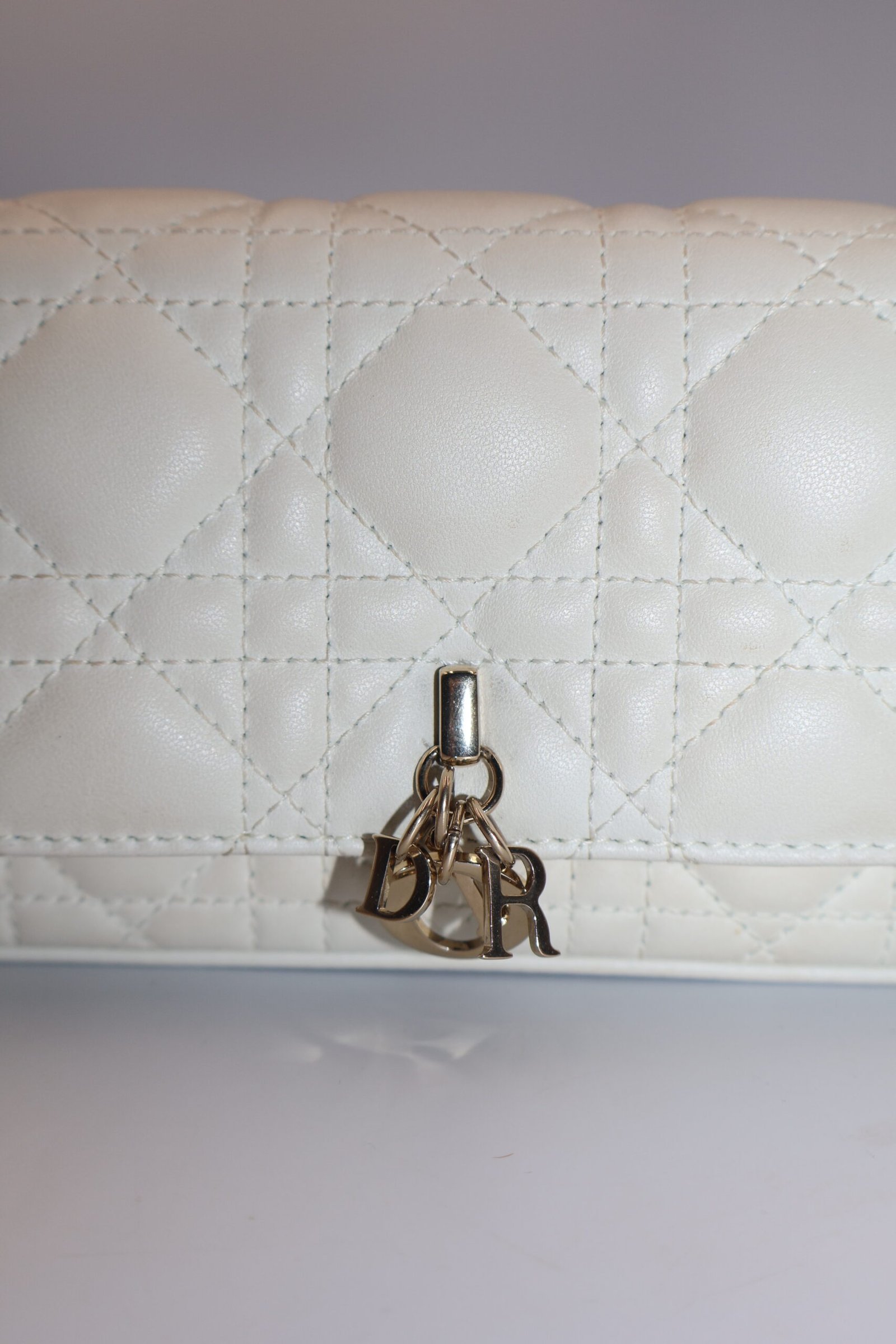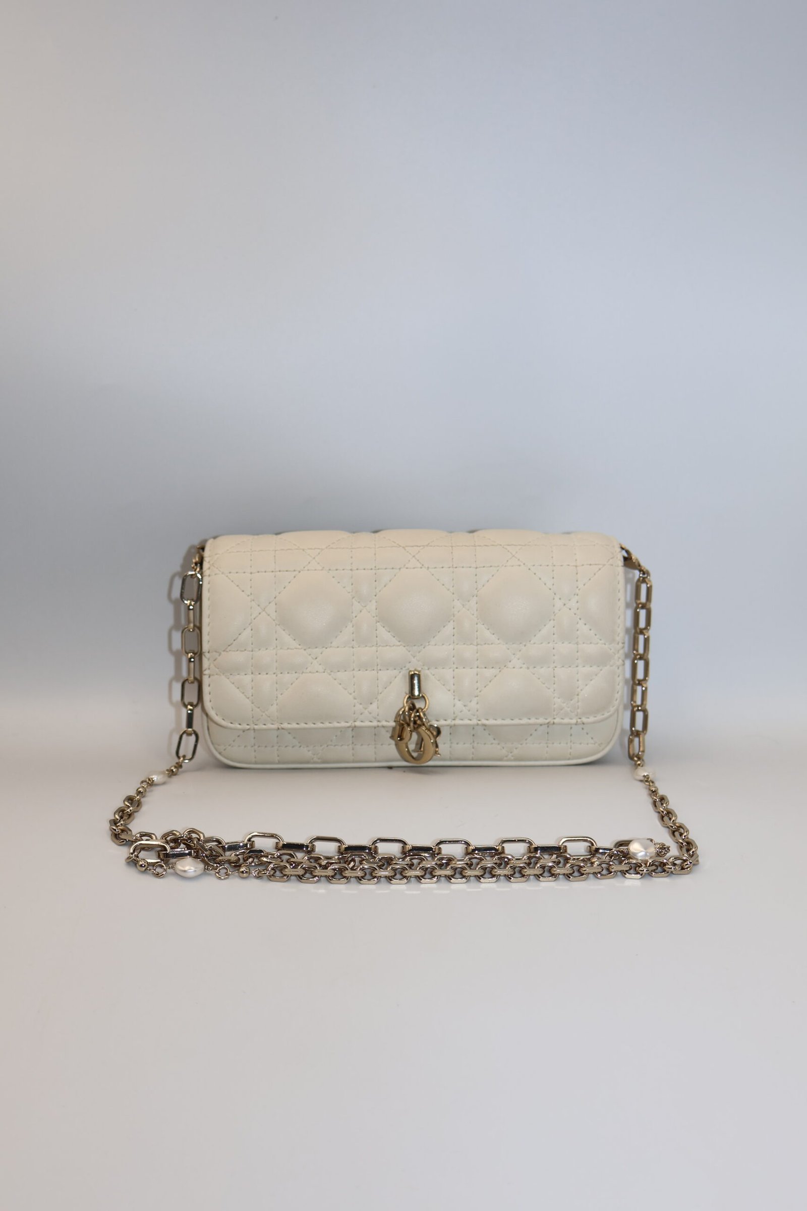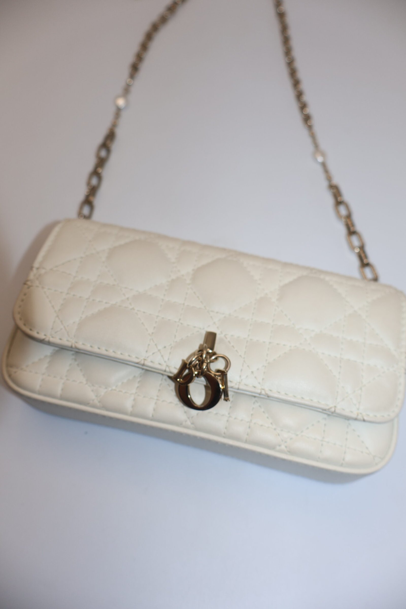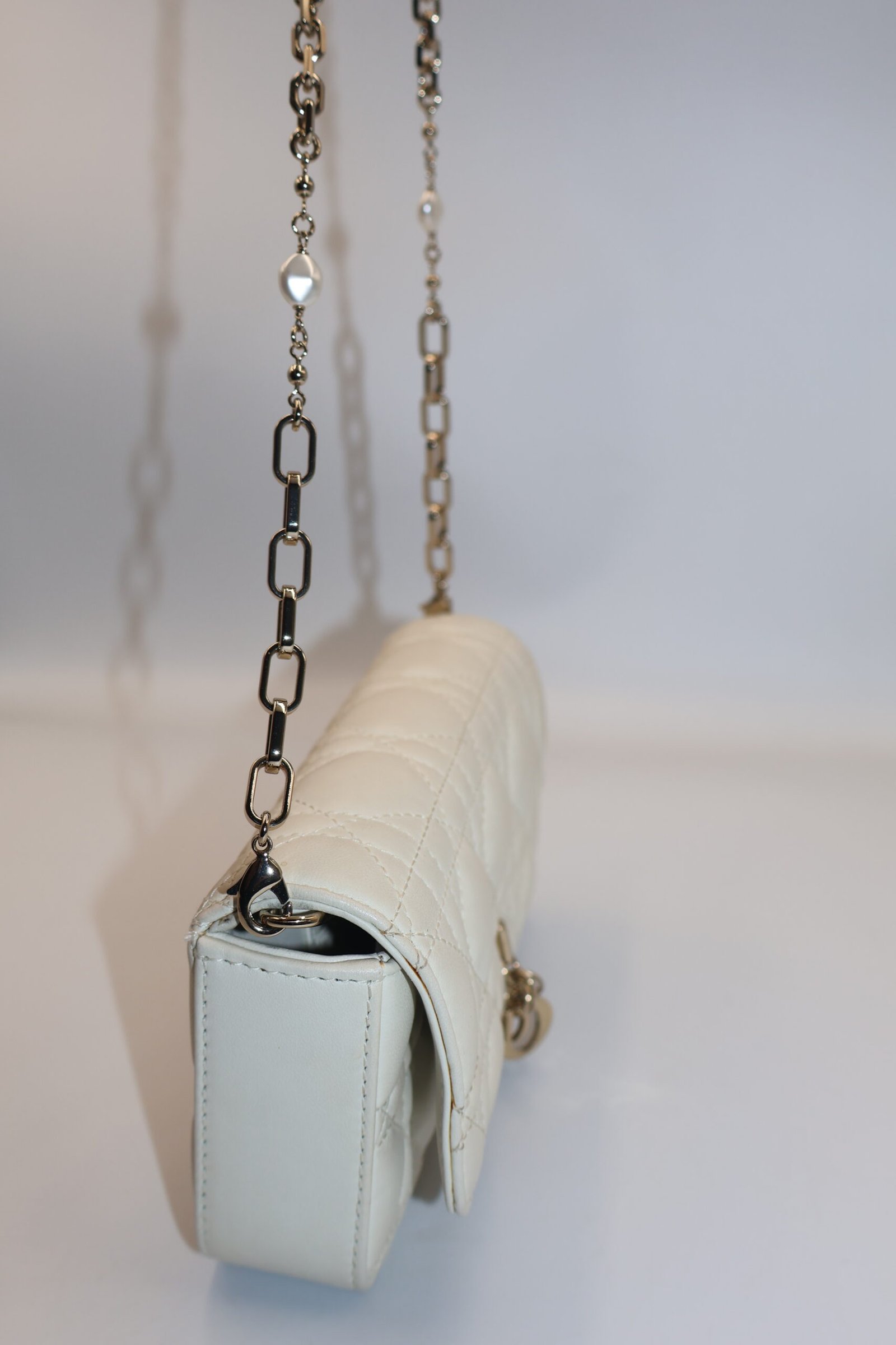 Este ponchette para telefono My Dior – Dior Talk es un accesorio refinado y practico, su diseño es de piel de cordero cannage latte incluye charms D.I.O.R. de metal dorado pálido , el modelo se completa con una elegante cadena extraible con abalorios de resina que permite llevarlo cruzado, colgado del hombro o en la mano, Fullset.