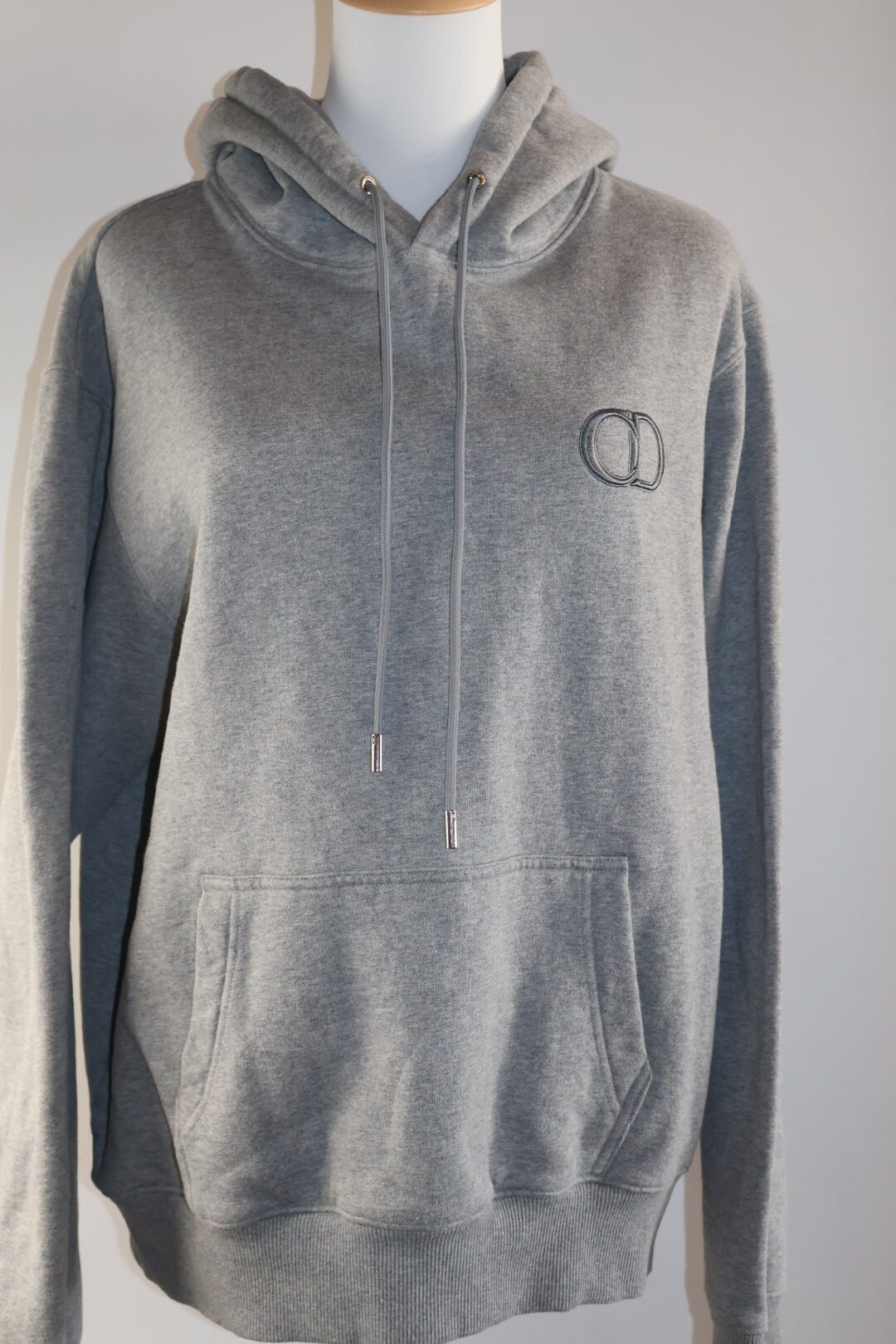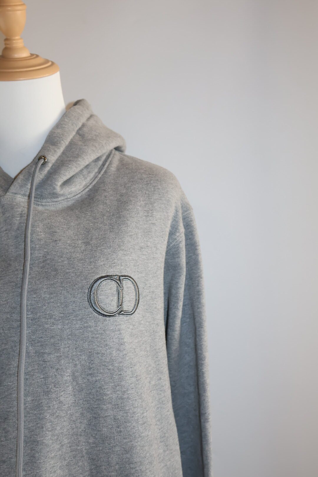 Esta sudadera con capucha esta confeccionada en felpa de algodón gris, suave y cómoda, esta adornada con un bordado CD con tono sobre tono en el pecho, esta prenda de corte regular, completada con puños y dobladillo acanalados , combina bien con cualquier conjunto casual, Preloved, size mediana.