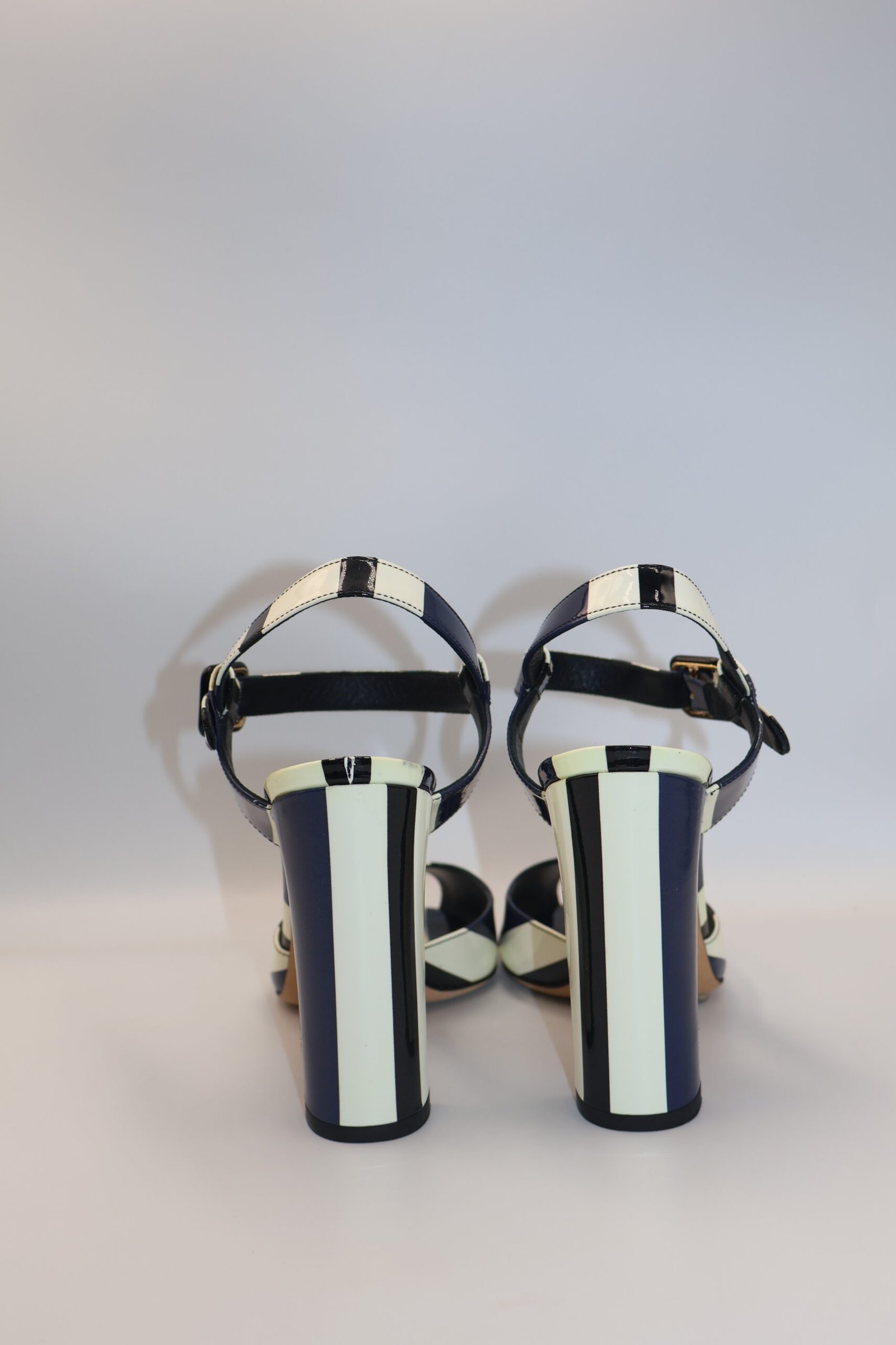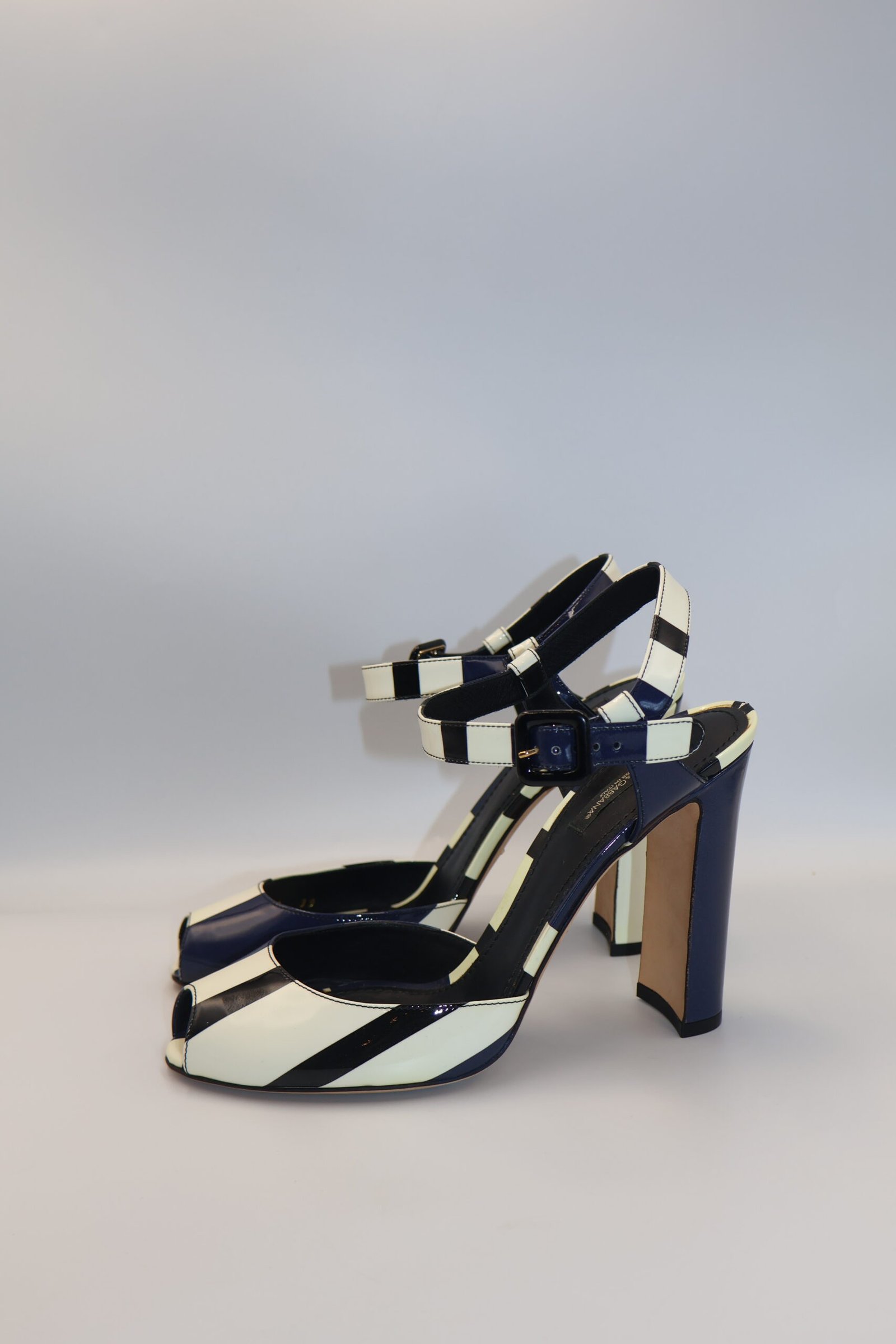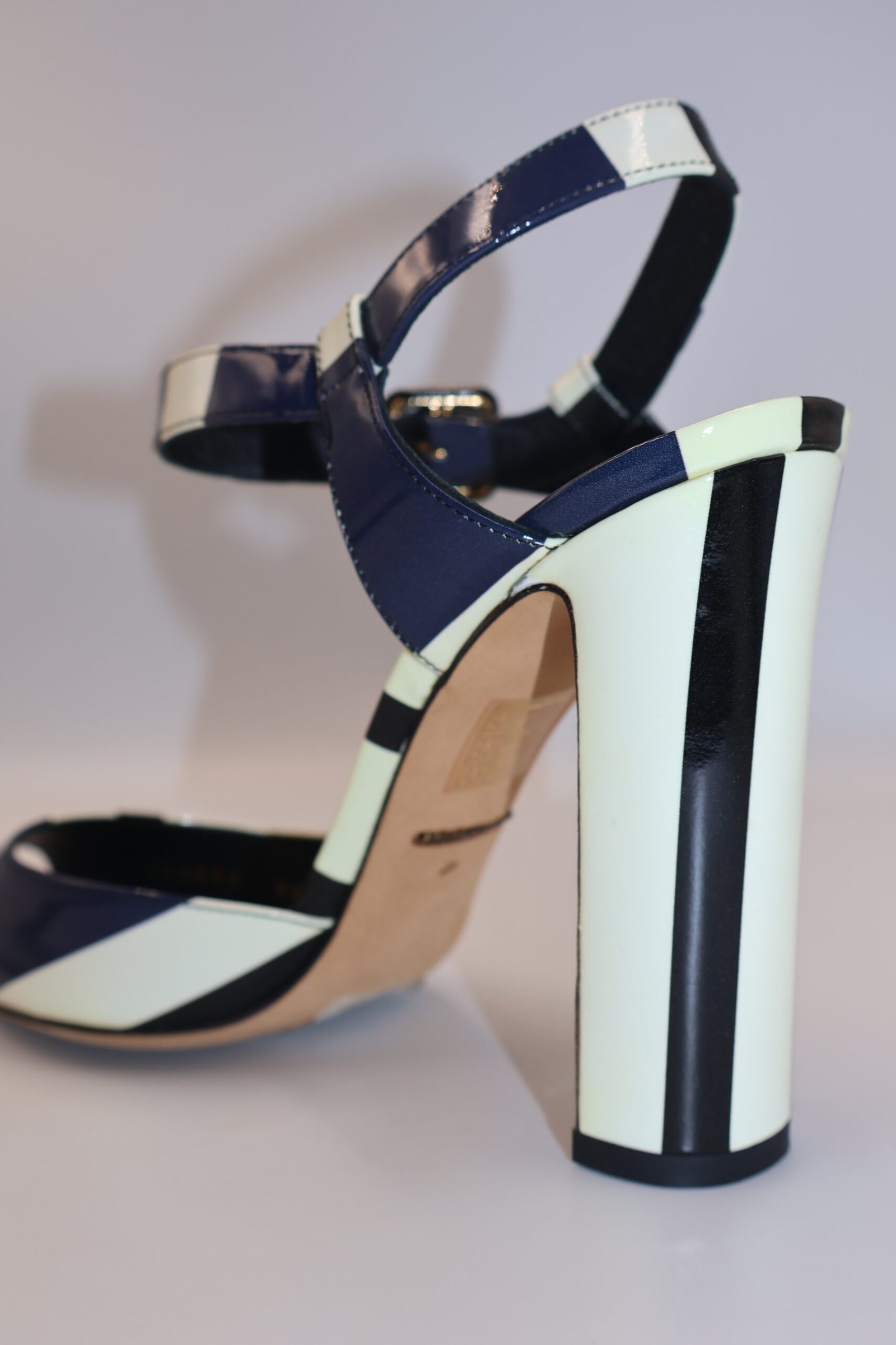 Tacones de Dolce & Gabbana, confeccionadas en charol , presentan un diseño de rayas verticales en colores blanco, negro y azul obscuro , son tacones con punta abierta  y tiras finas con cierre de hebilla en el tobillo, hechas en Italia, size 39, Fullset.