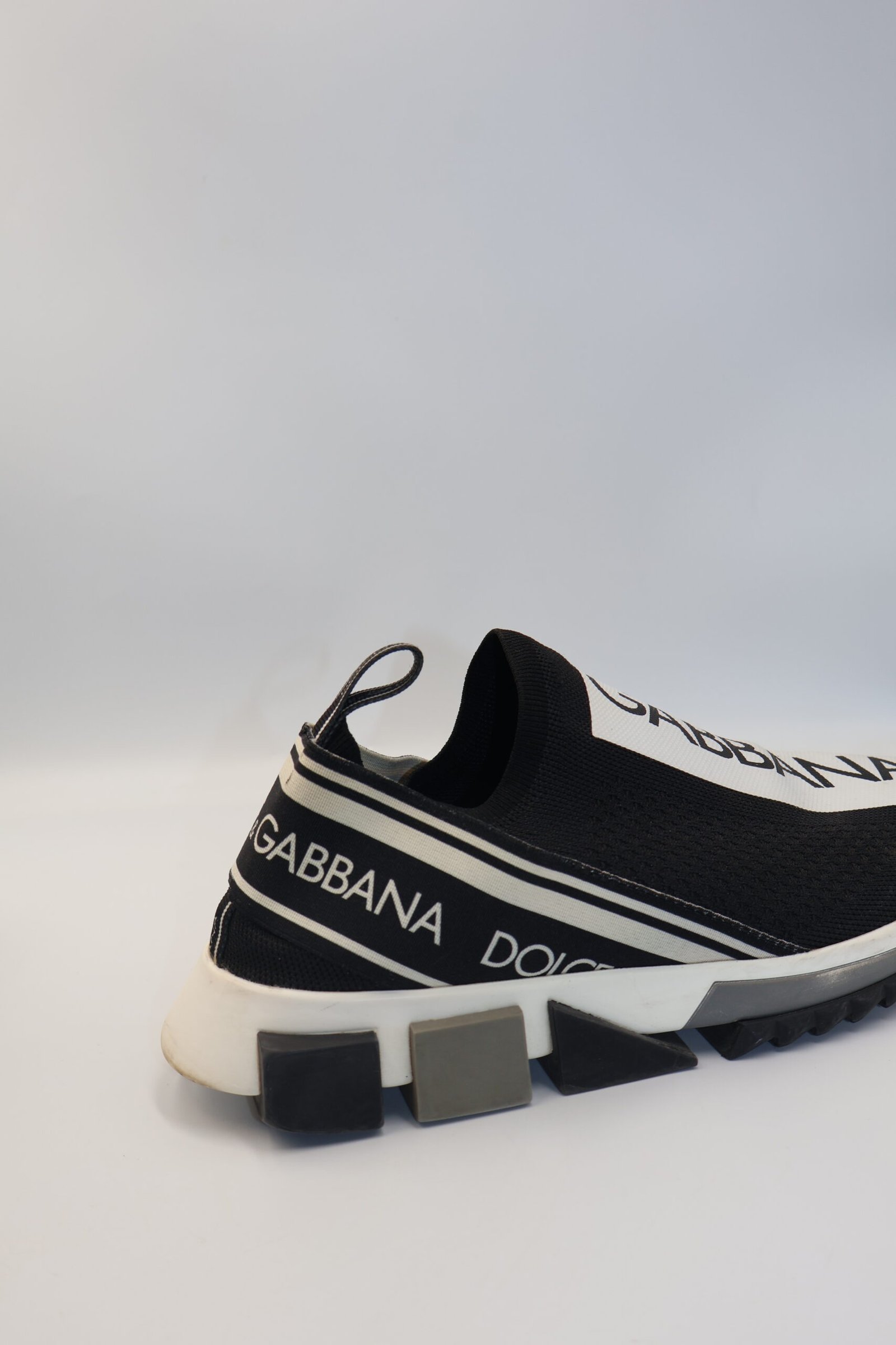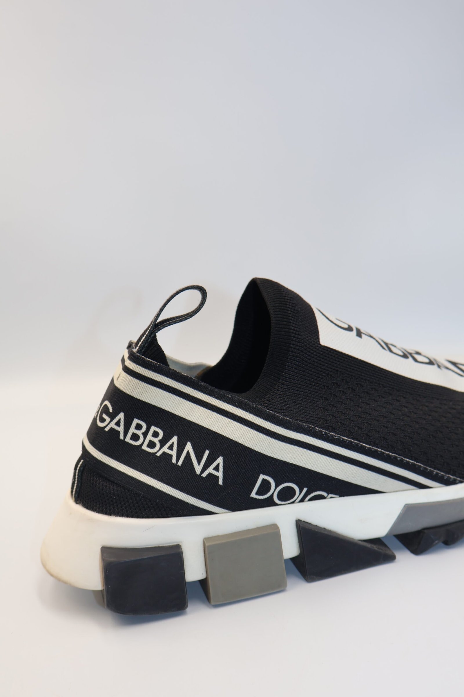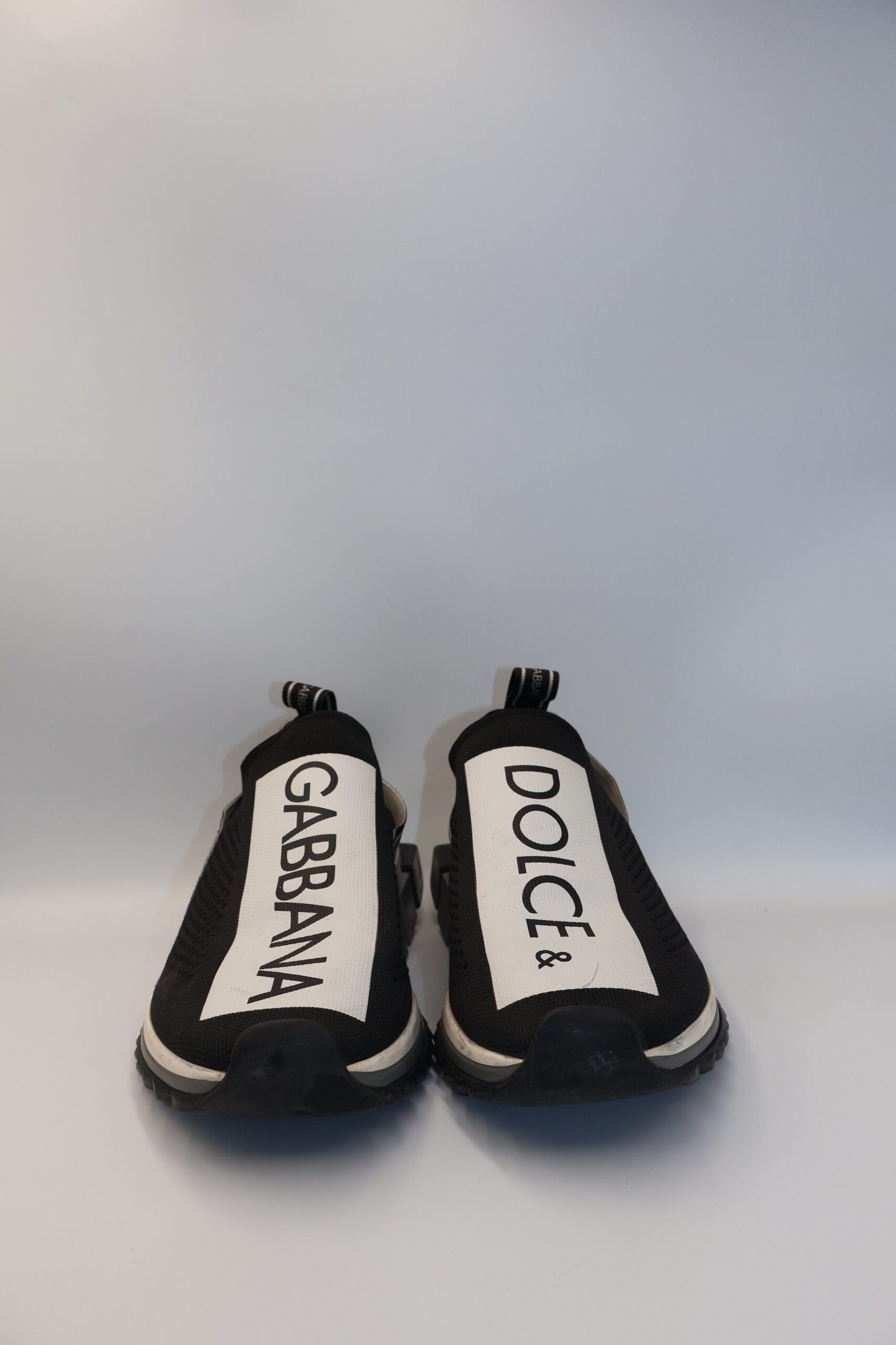 Los tenis Dolce & Gabbana Sorrento, son unas zapatillas slip-on de estilo urbano y moderno que destacan por su diseño llamativo y ajuste tipo calcetín, están confeccionadas en malla elástica de mezcla de materiales como elastano, nailon, poliéster, y rayos en el exterior, y forro en el interior que incluye algodón, incorporan un estampado integral del logotipo en blanco y negro , con detalles de marca en la parte frontal , lateral y trasera , cuentan con un tirador posterior para facilitar el calce y una suela geométrica dentada de goma que aporta comodidad y soporte, size 5, Preloved, incluye caja y cubrepolvo.