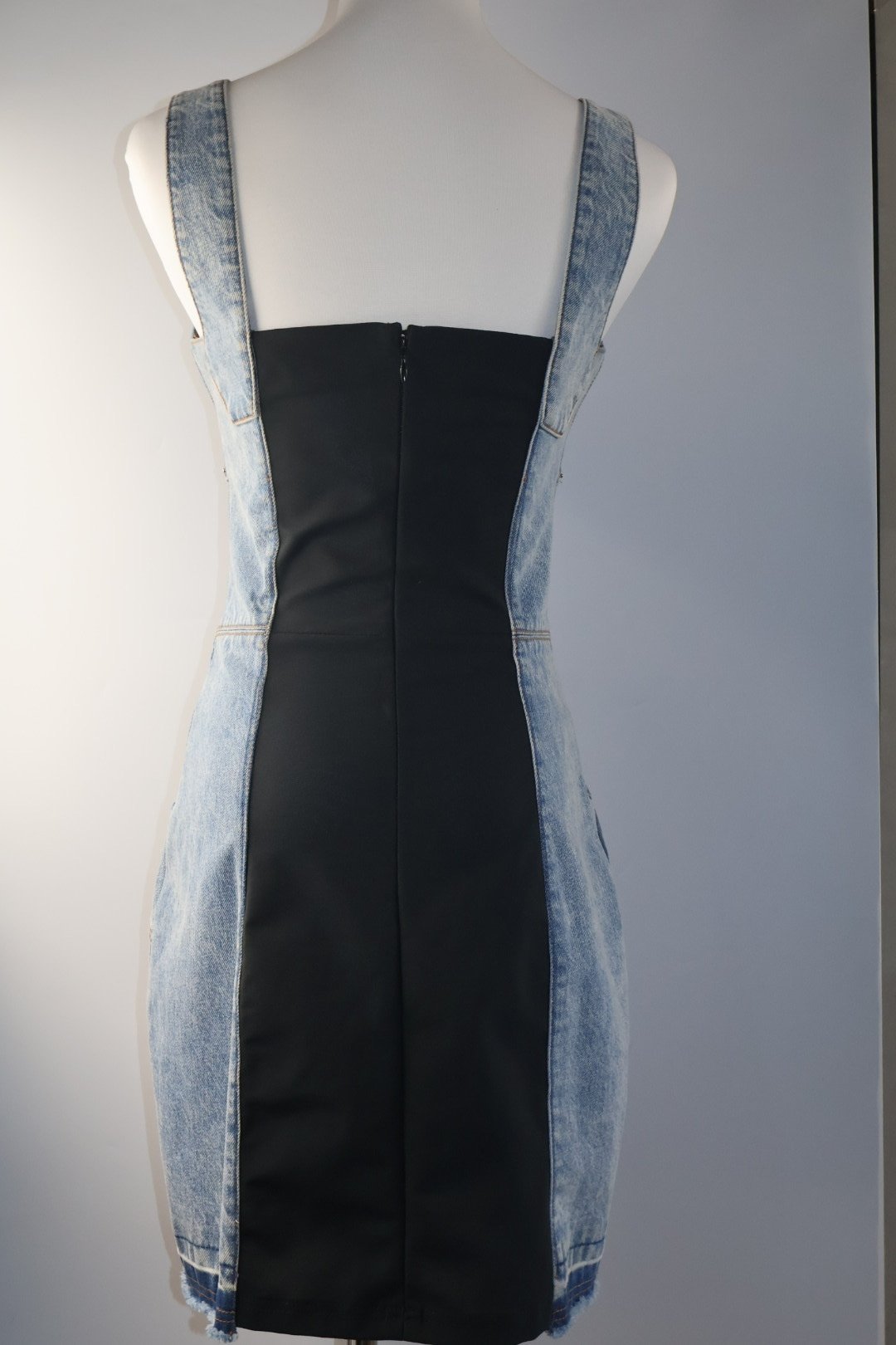 Este es un vestido en color azul de mezcla de algodón de mezclilla, con un efecto envejecido , cuello en V, diseño sin mangas , borde sin rematar y diseño por el muslo, viene con doble vista con un estampado de animal print muy sofisticado, en la talla 40, es nuevo.