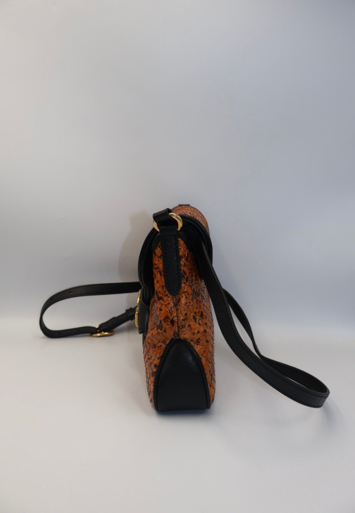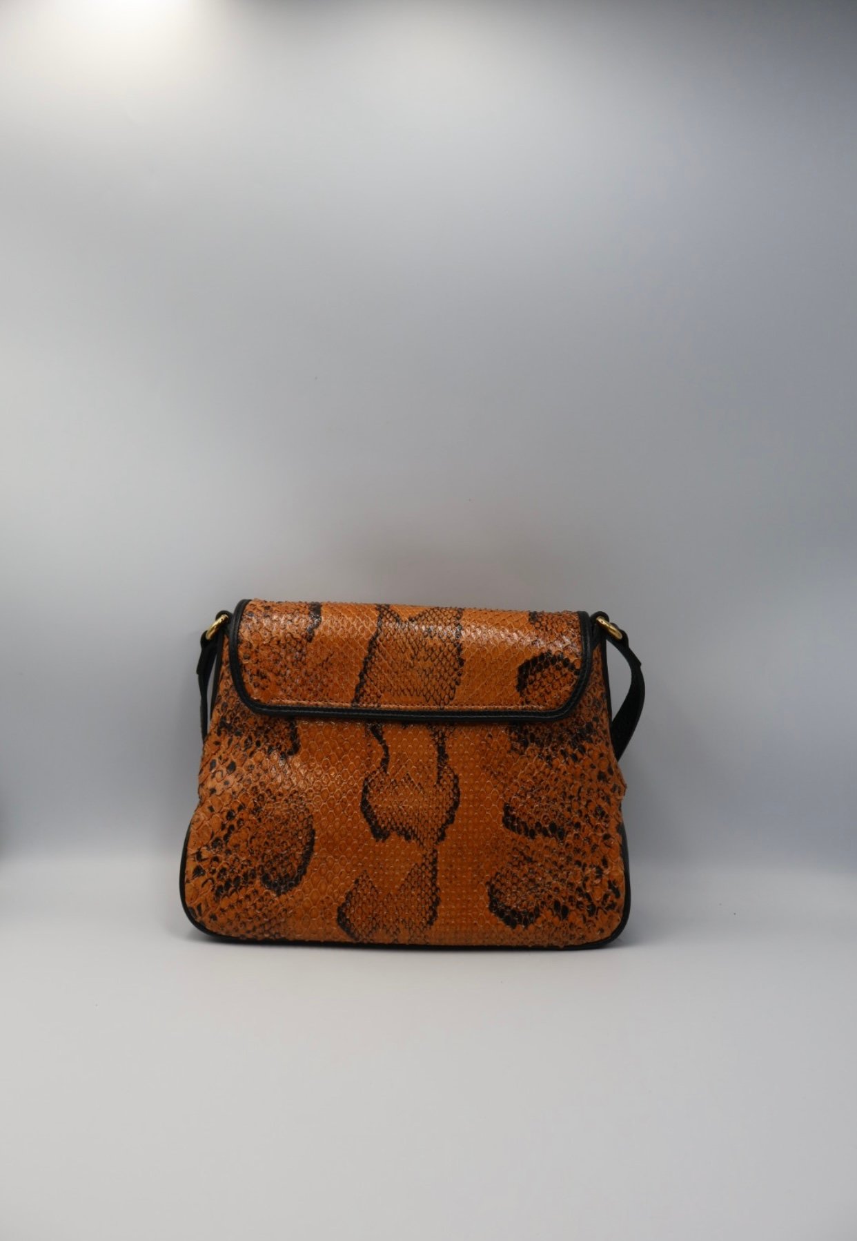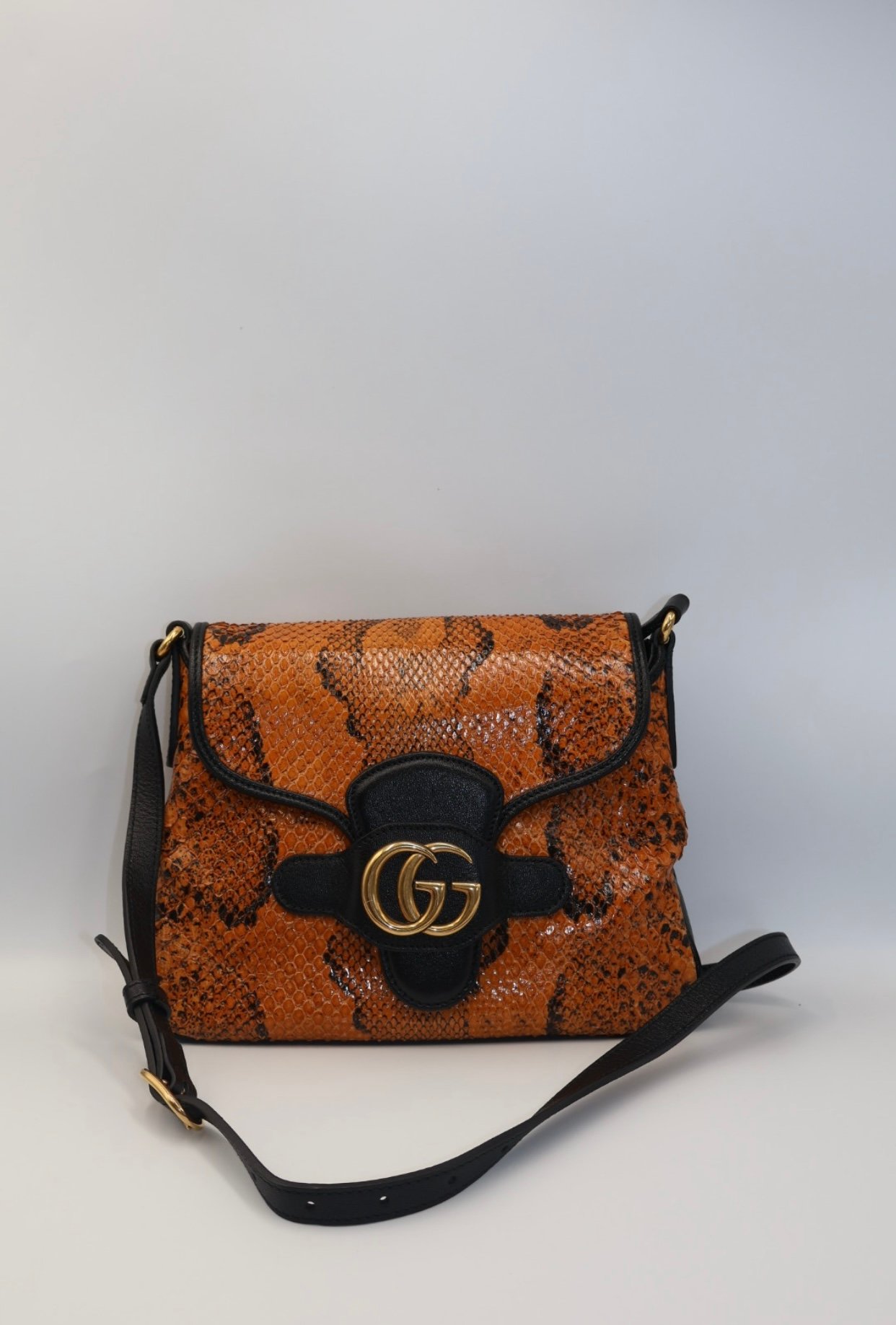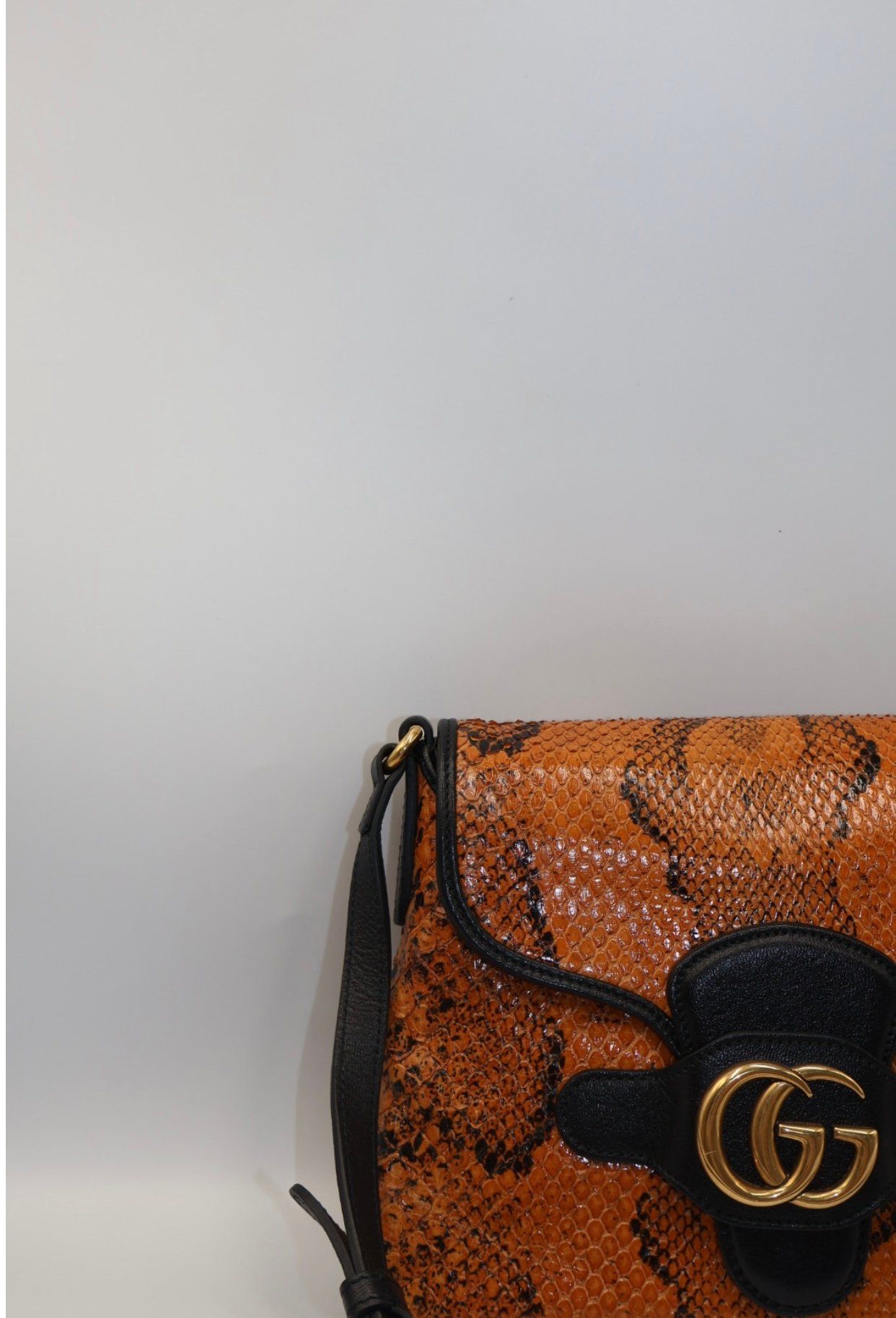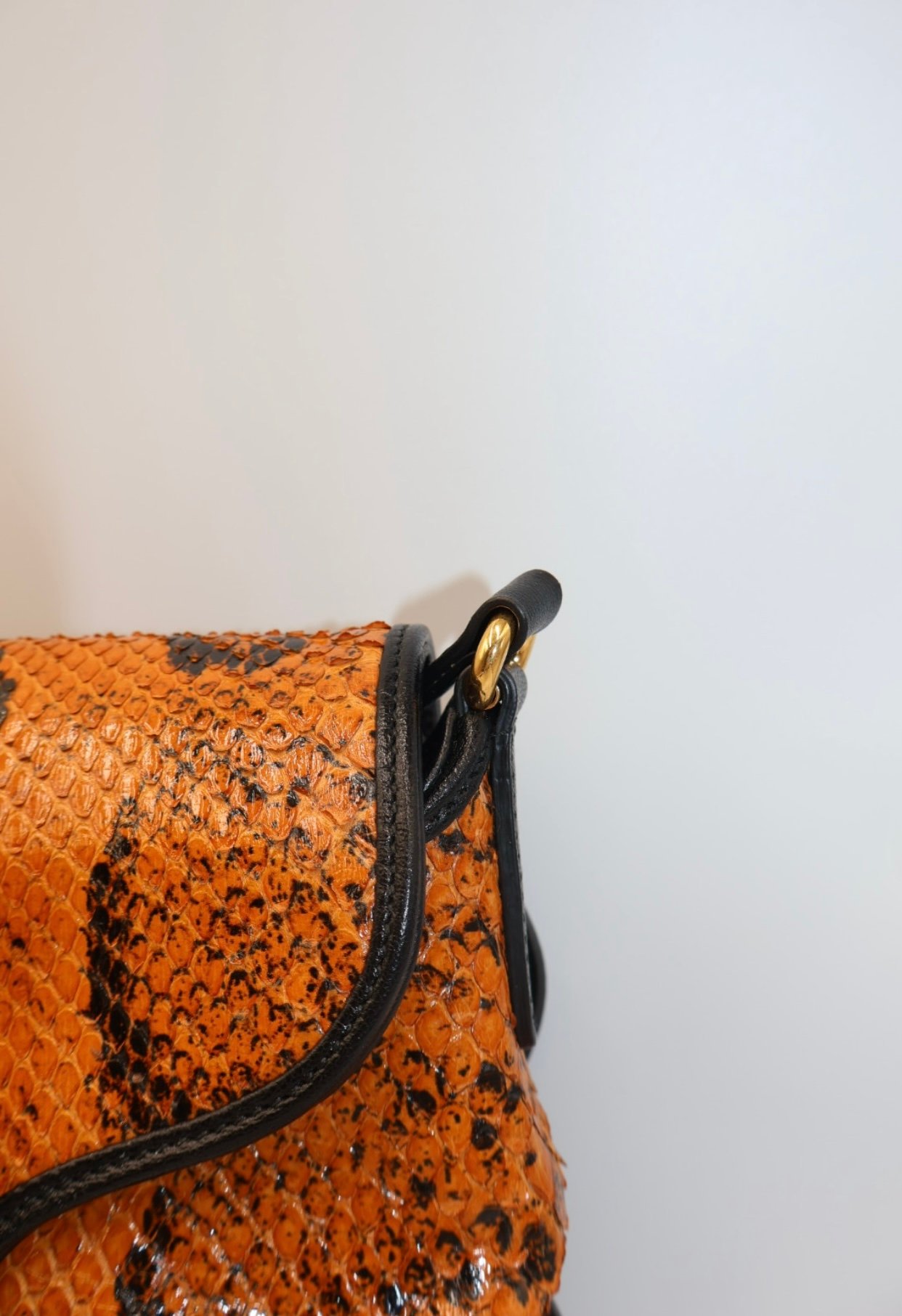 Bolso Gucci Marmont Piton confeccionado en piel de piton con acabados en cuero negro y detalles en tono dorado y naranja , presenta un diseño metelasse en Chevron característico de la linea y el icónico logotipo doble G en metal envejecido en la solapa, cuenta con correa de cadena y cuero ajustable para el hombro, Preloved, incluye caja y cubrepolvo.