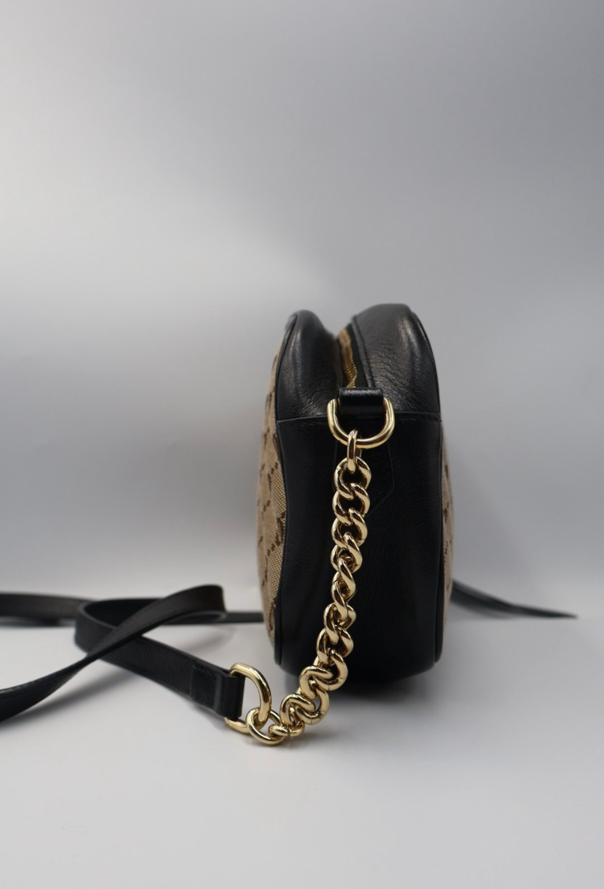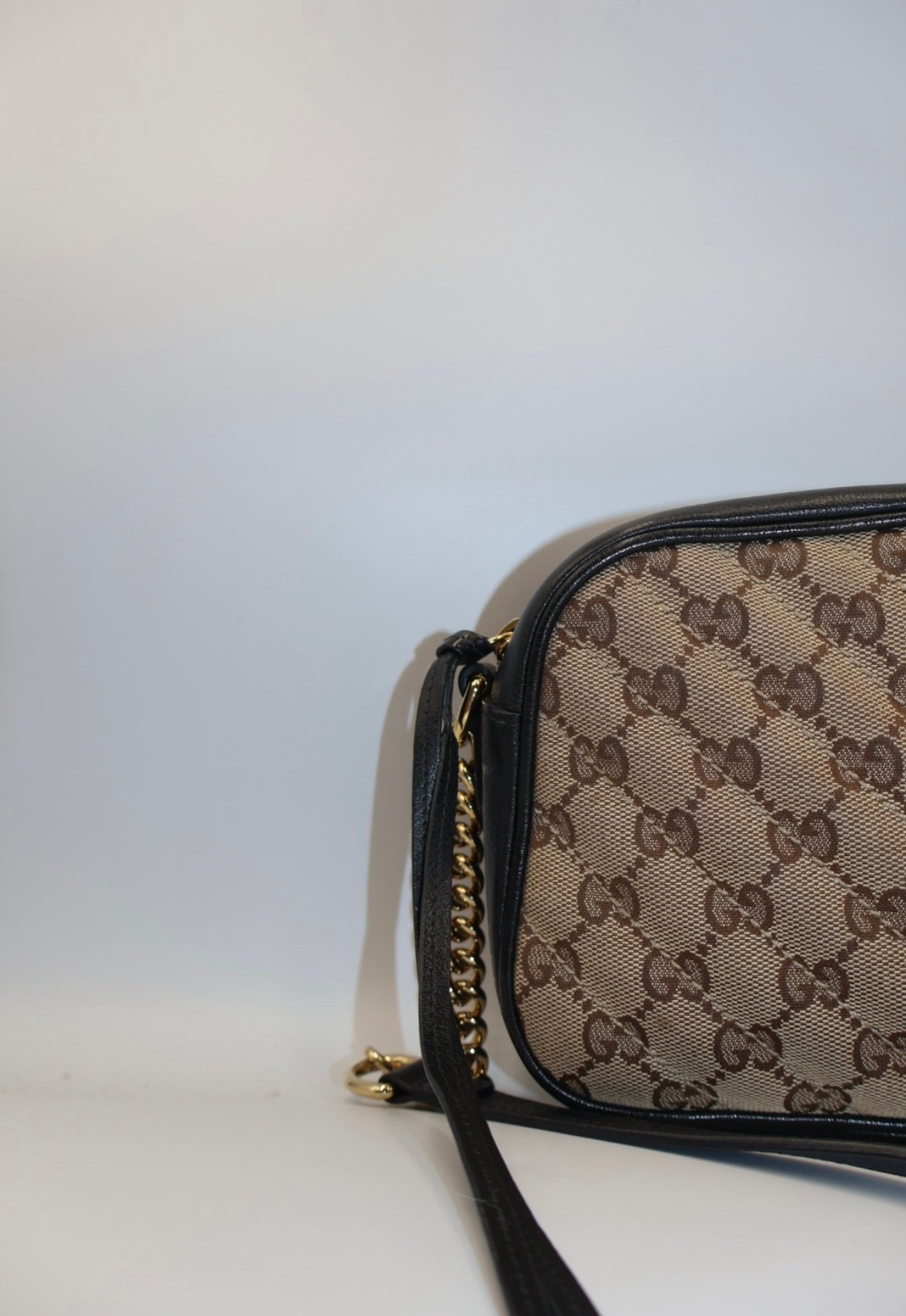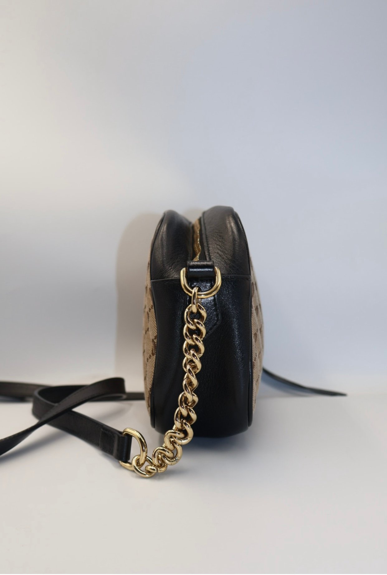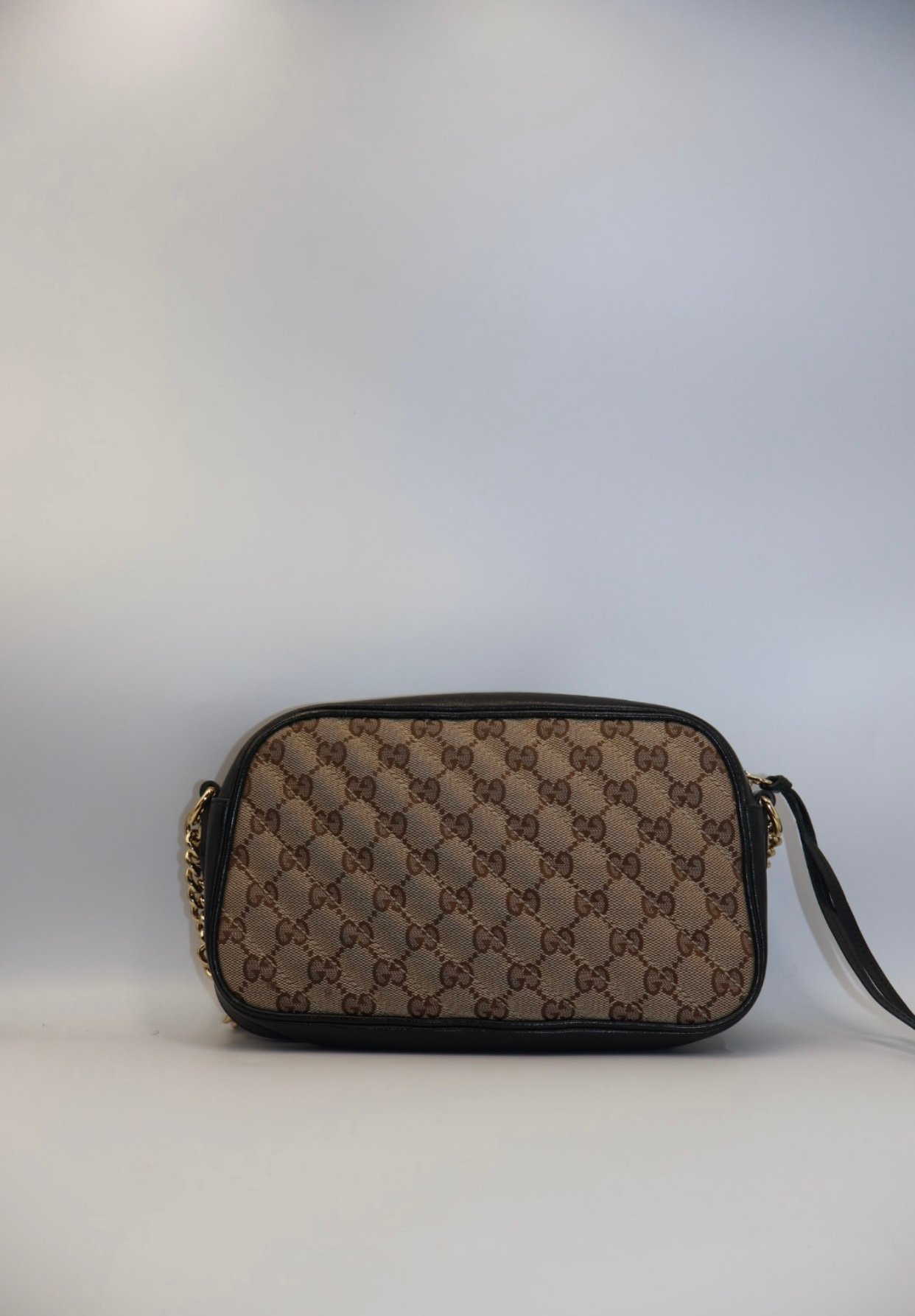 Bolso elaborado en lona GG negra y beige con detalles de cuero de alta calidad, presenta un diseño acolchonado con motivo de Chevron y el logotipo doble GG en herrajes dorados, incluye solapa con cierre, bolsillo interno y según el tamaño, bolsillo posterior, su correa de cadena deslizante permite llevarlo al hombro o como asa superior, combinado un estilo clásico y elegante , Preloved, incluye cubrepolvo.