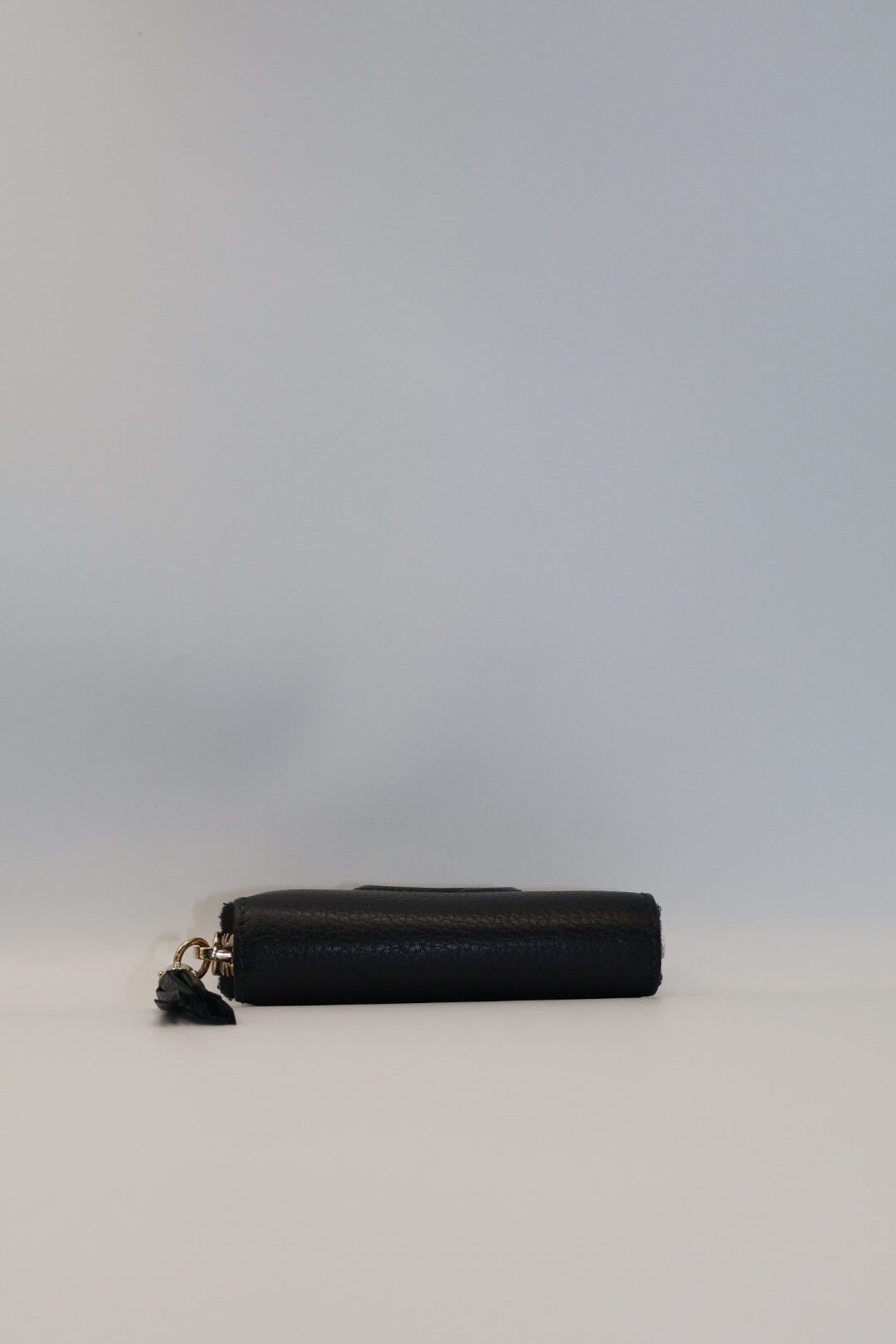 Esta cartera esta confeccionada en cuero, en color negro, con el icónico logotipo de la GG entrelazada en relieve en la parte delantera, , cuenta con un cierre de cremallera alrededor y un tirador de cremallera con borla, incluye un bolsillo para monedas y ranuras para tarjetas, viene Preloved y solo con cubrepolvo.