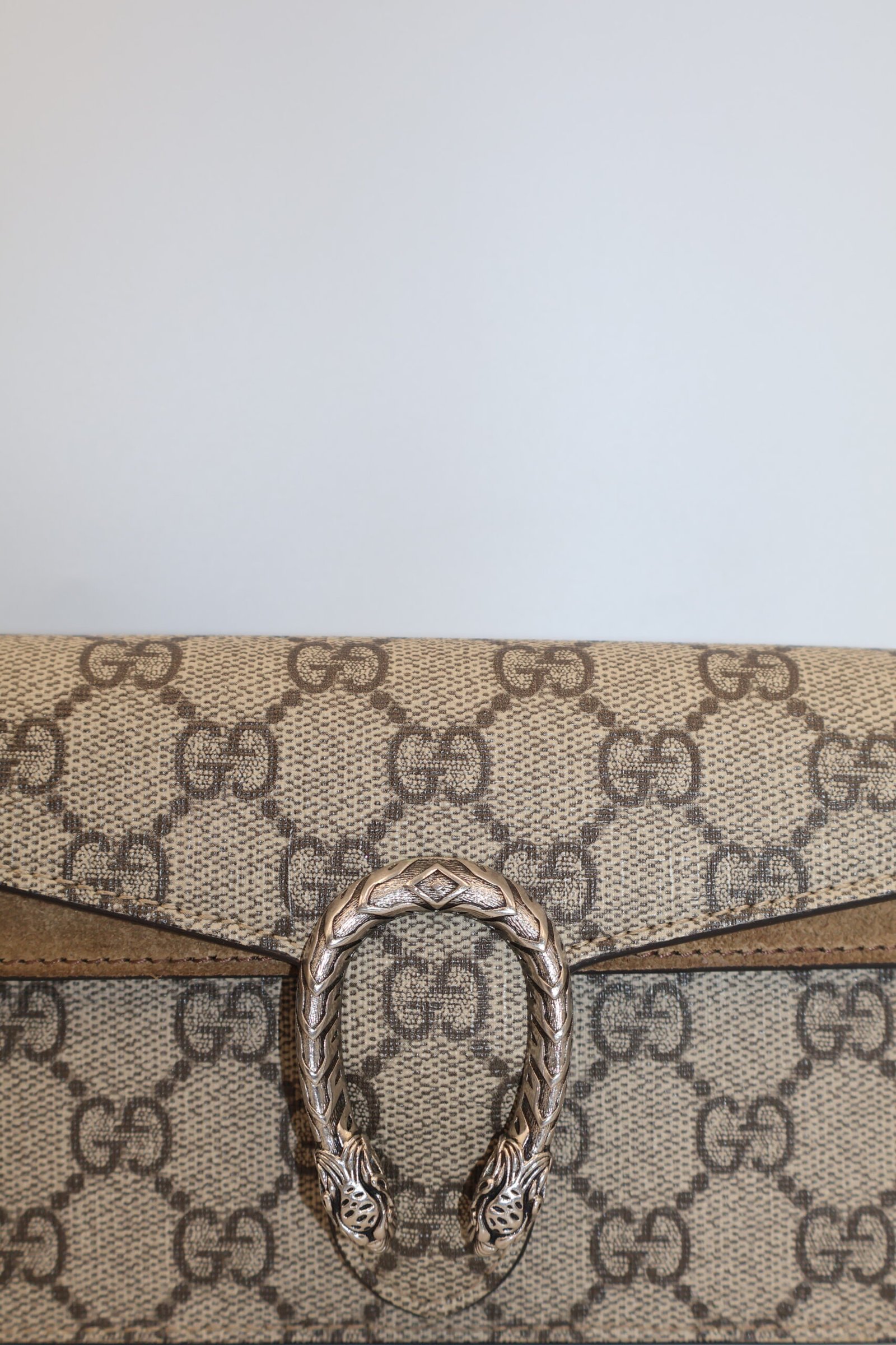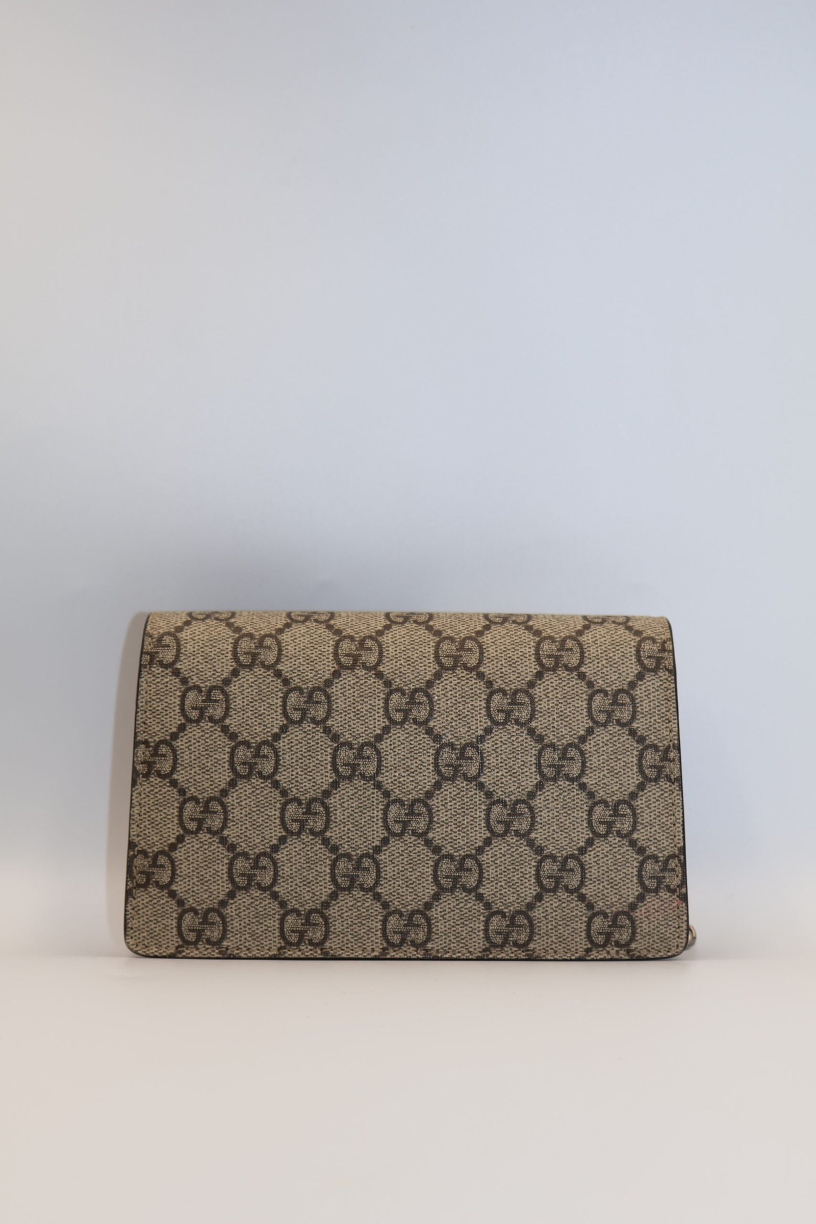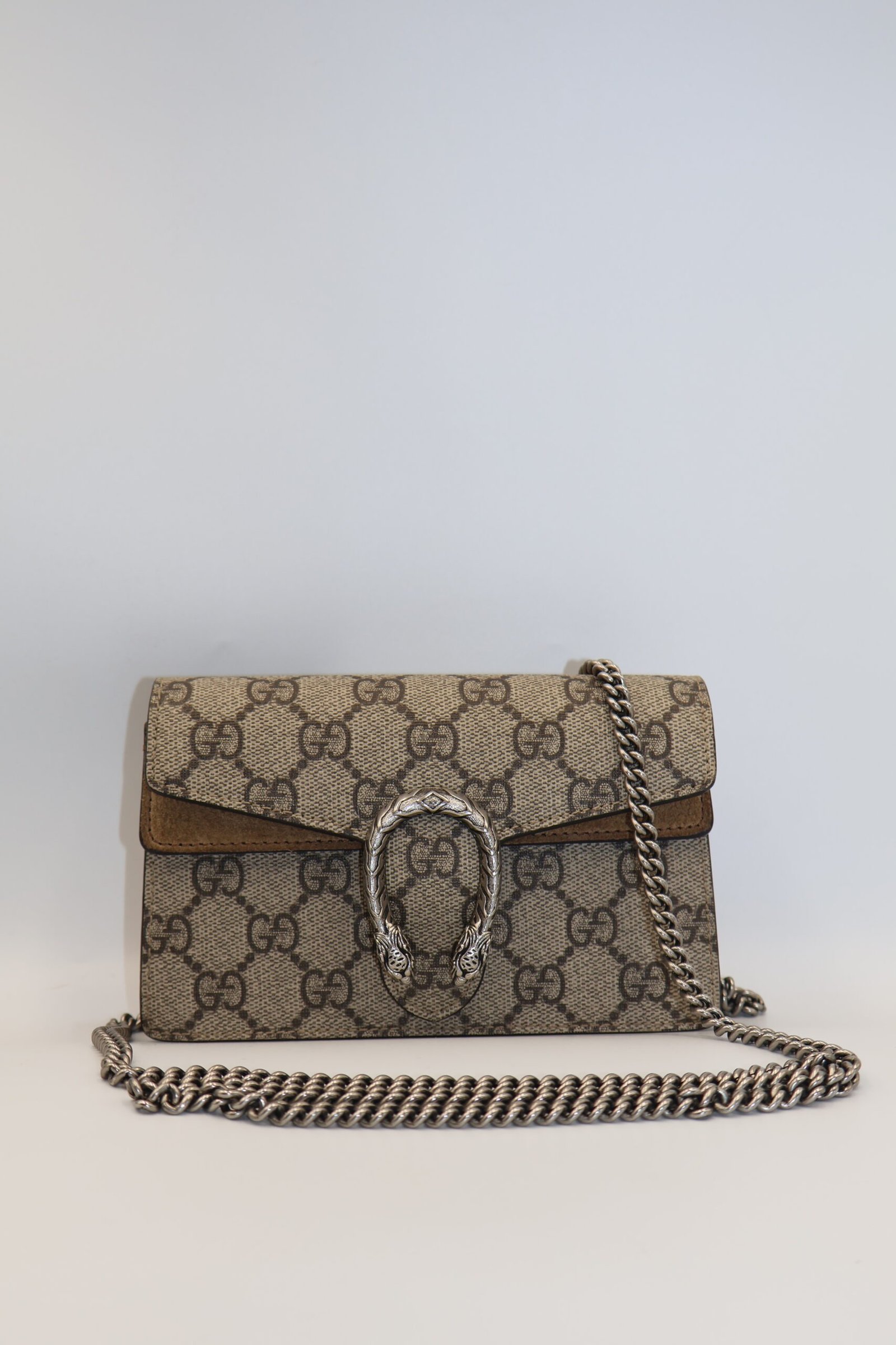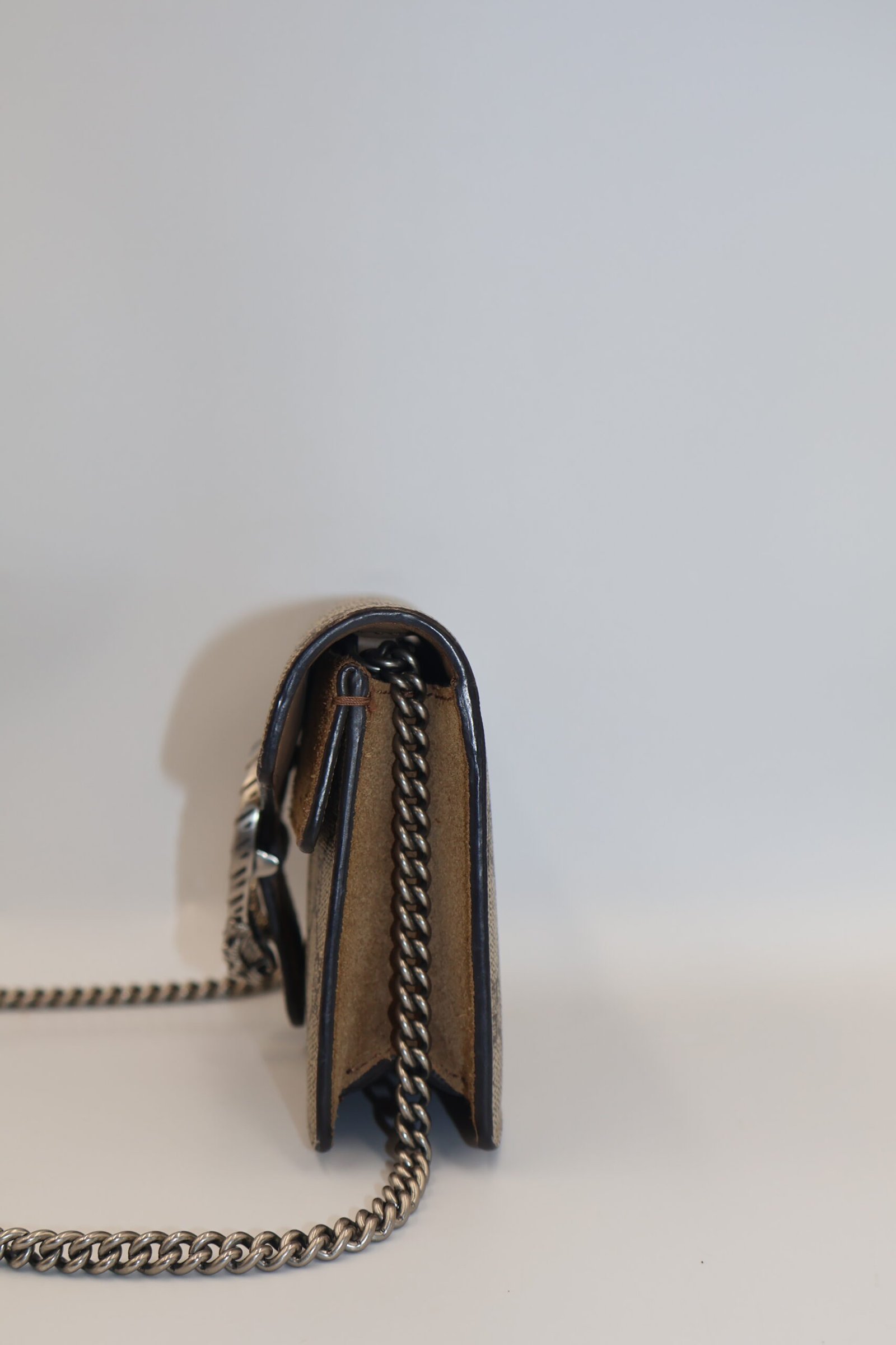 Minibolso de hombro GG Supreme de lona estructurada con cadena y llavero que permite unirlo a un bolso mas grande, el cierre tiene un diseño texturizado con forma de cabeza de tigre, un detalle único que hace referencia al dios griego Dionisio, el accesorio también se puede llevar como bandolera, Preloved, incluye cubrepolvo.