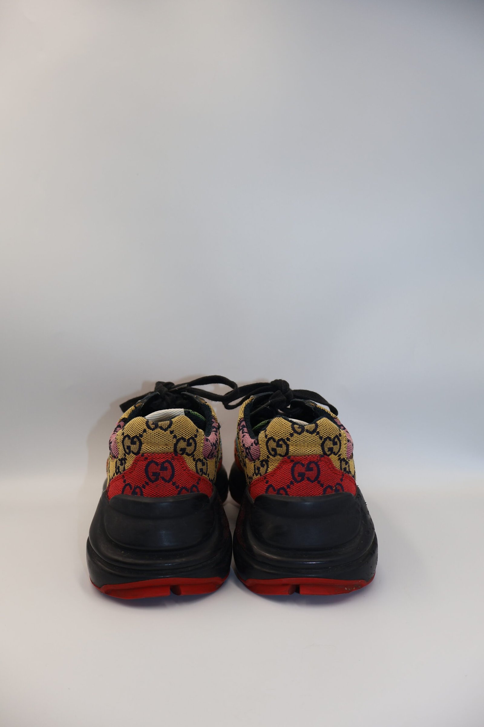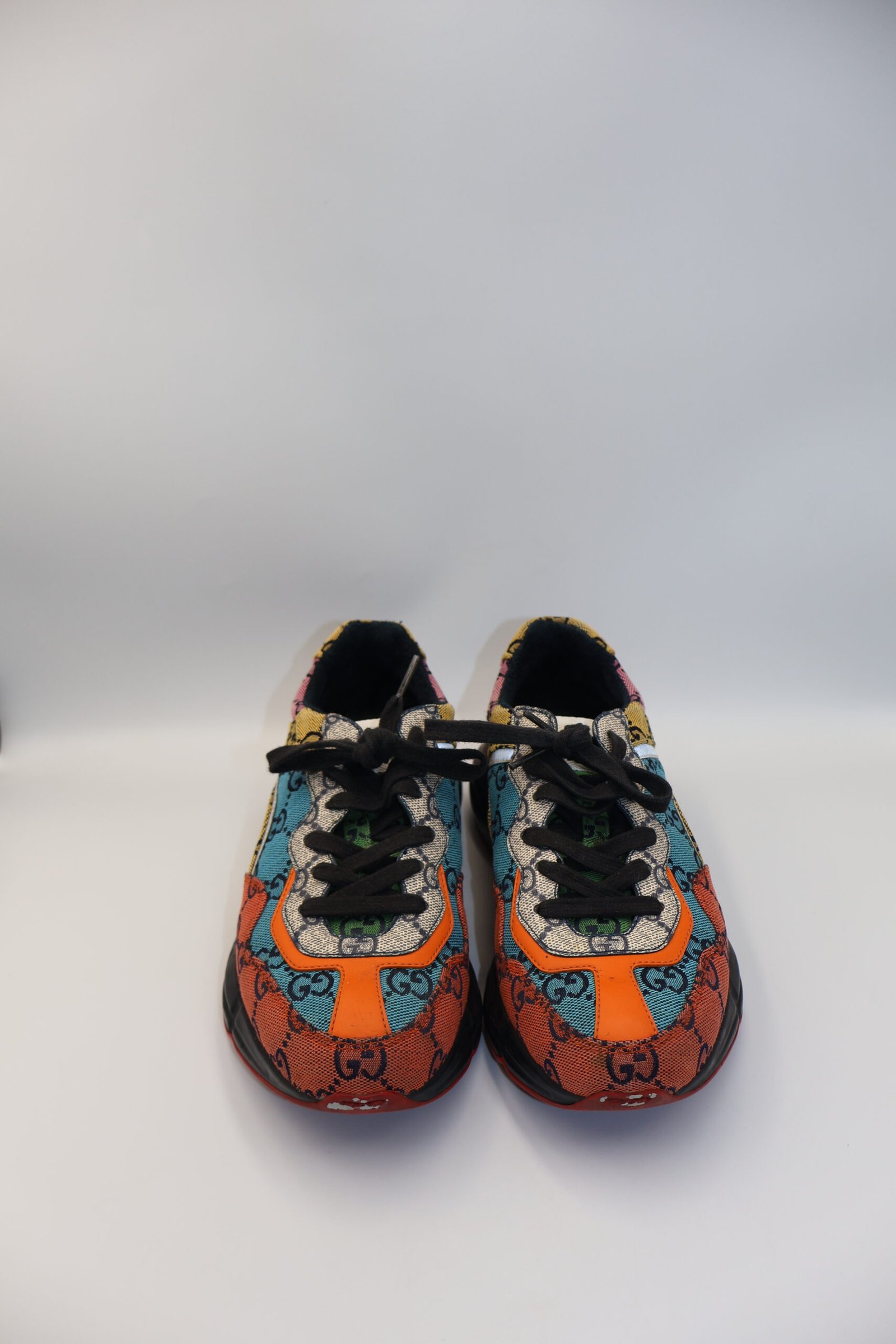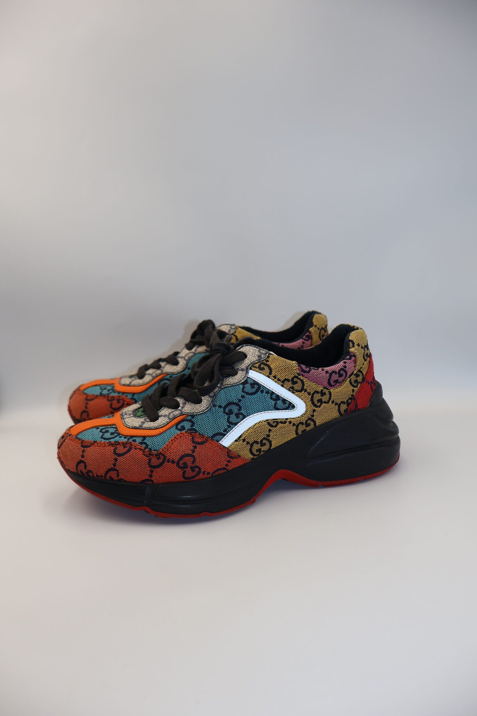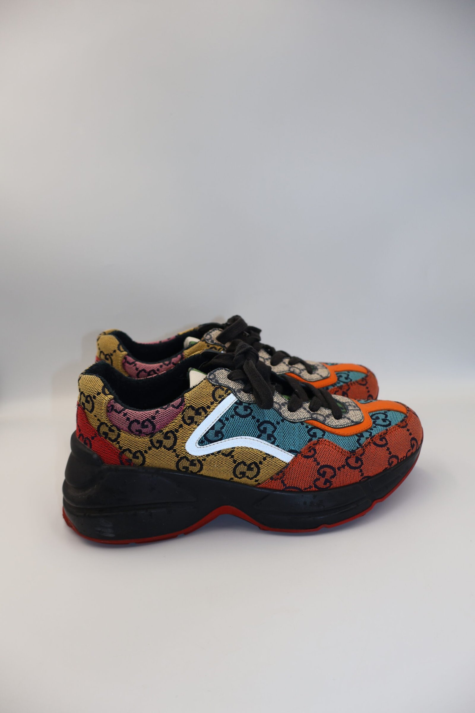 Tenis Rhyton GG Multicolor de estilo retro con suela gruesa y diseño voluminoso , fabricados en piel presentan cierres con agujetas, logotipo lateral y plantilla acolchonada con el sello de la marca , destacan por su estética vibrante inspirada en los años 80, que combina lujo, comodidad y un marcado toque vintage, size 36, Preloved, incluyen cubrepolvo.