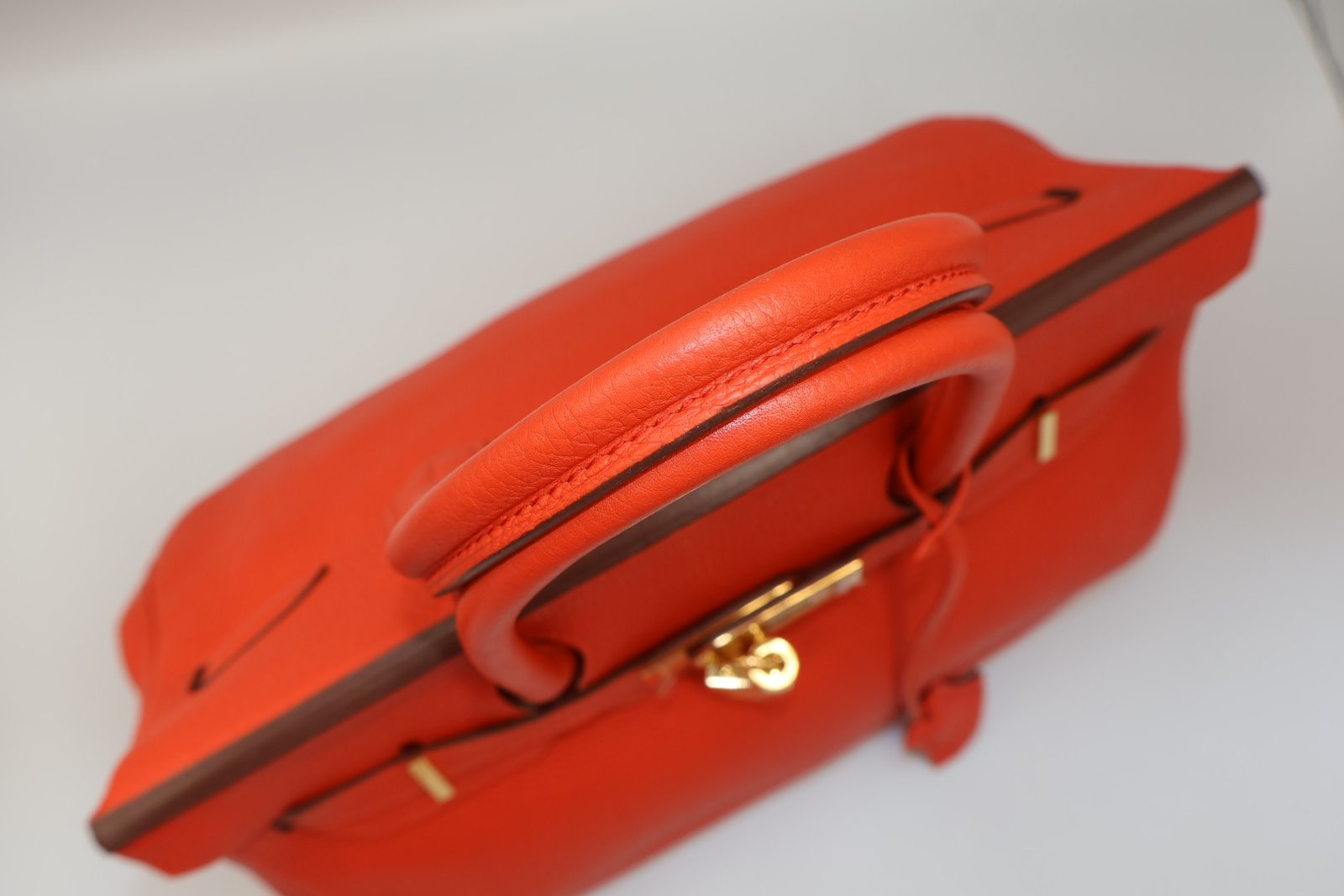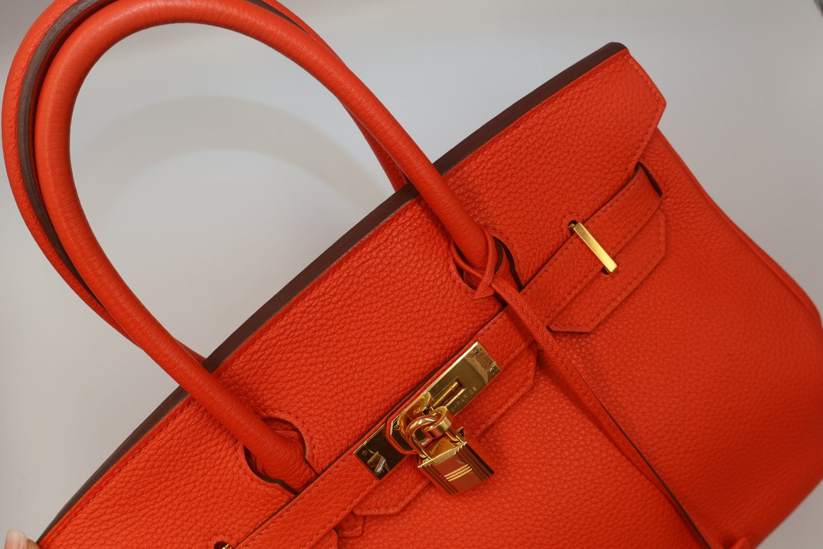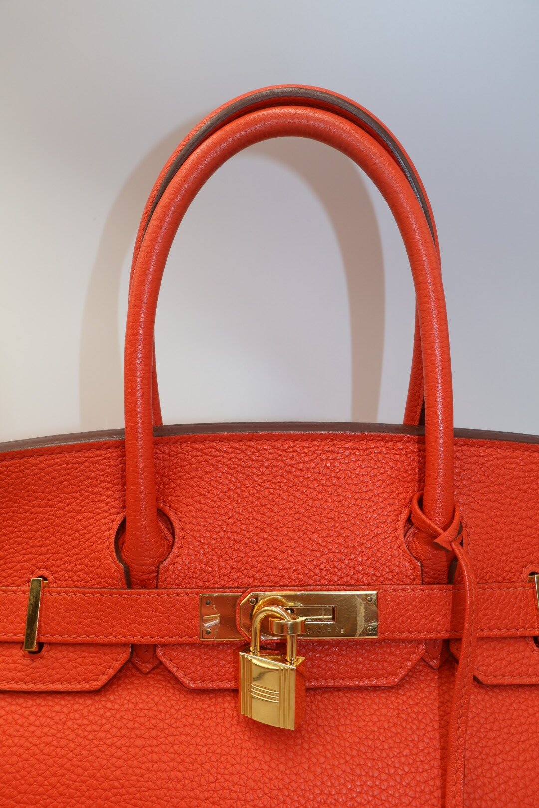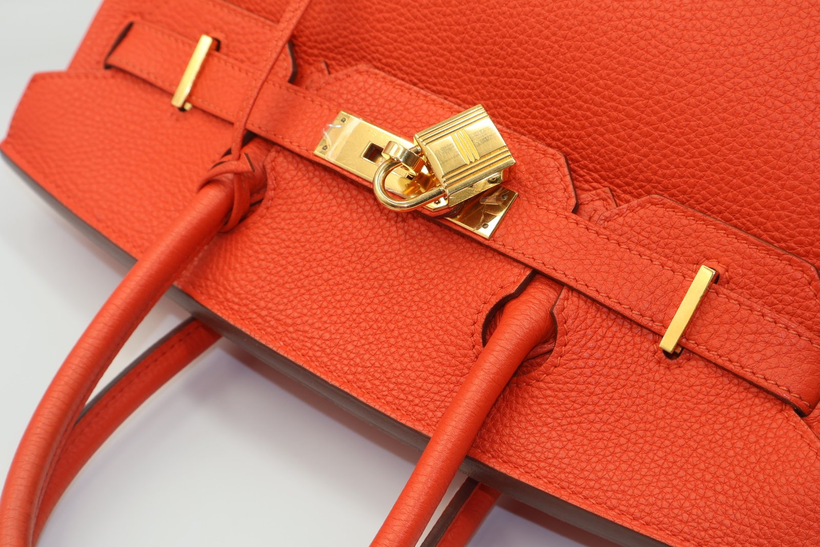 Hermés Birkin 35 Togo Leather preloved  en color naranja  con herrajes dorados , un icono perdurable en el mundo de los bolsos de alta gama. Esta en un estado como nuevo sin detalles incluye candado de dos llaves  y cubrepolvo de la firma, este bolso es del 2012 ,este Birkin no es un bolso si no un símbolo de estatus y una joya de la corona en cualquier colección de lujo.