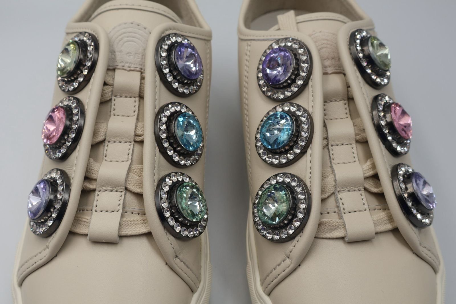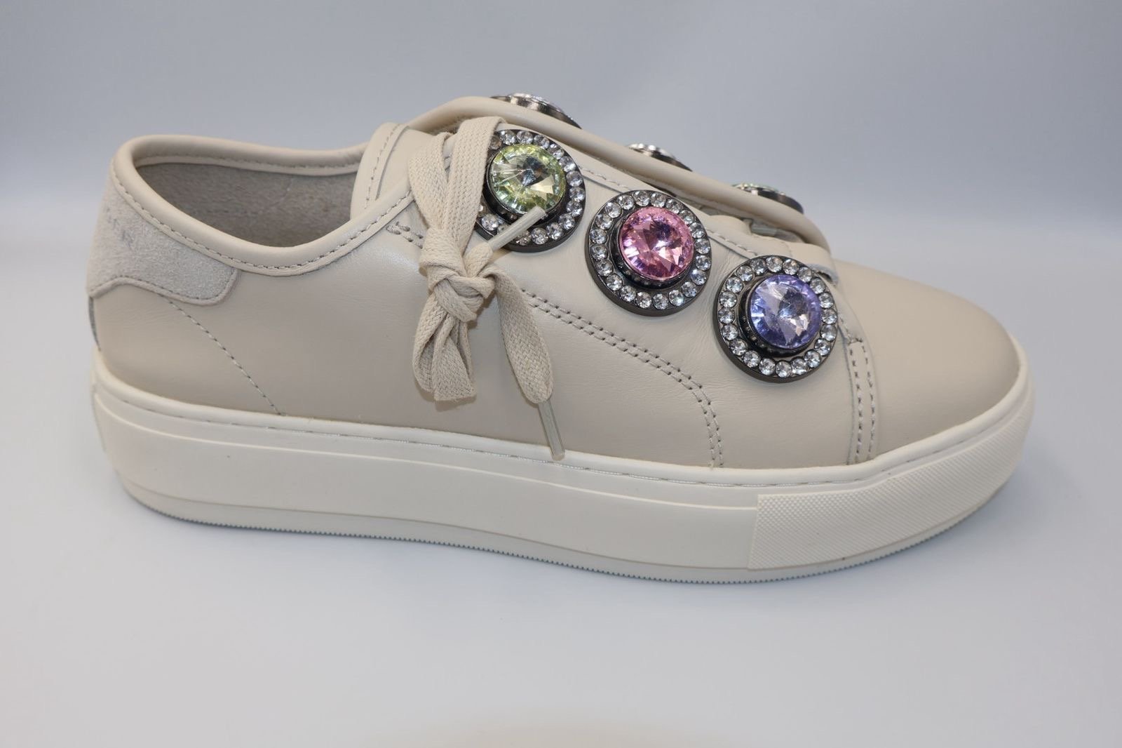 Tenis casuales de plataforma para mujer, hechos de corte y forro de piel, presenta una estética deportiva para un toque glamuroso , están adornados con grandes aplicaciones de joyas de varios colores en la parte lateral y sobre los cordones , cuentan con agujetas en el empeine, su suela es sintética vienen en Size 40 son nuevos y te incluye caja.