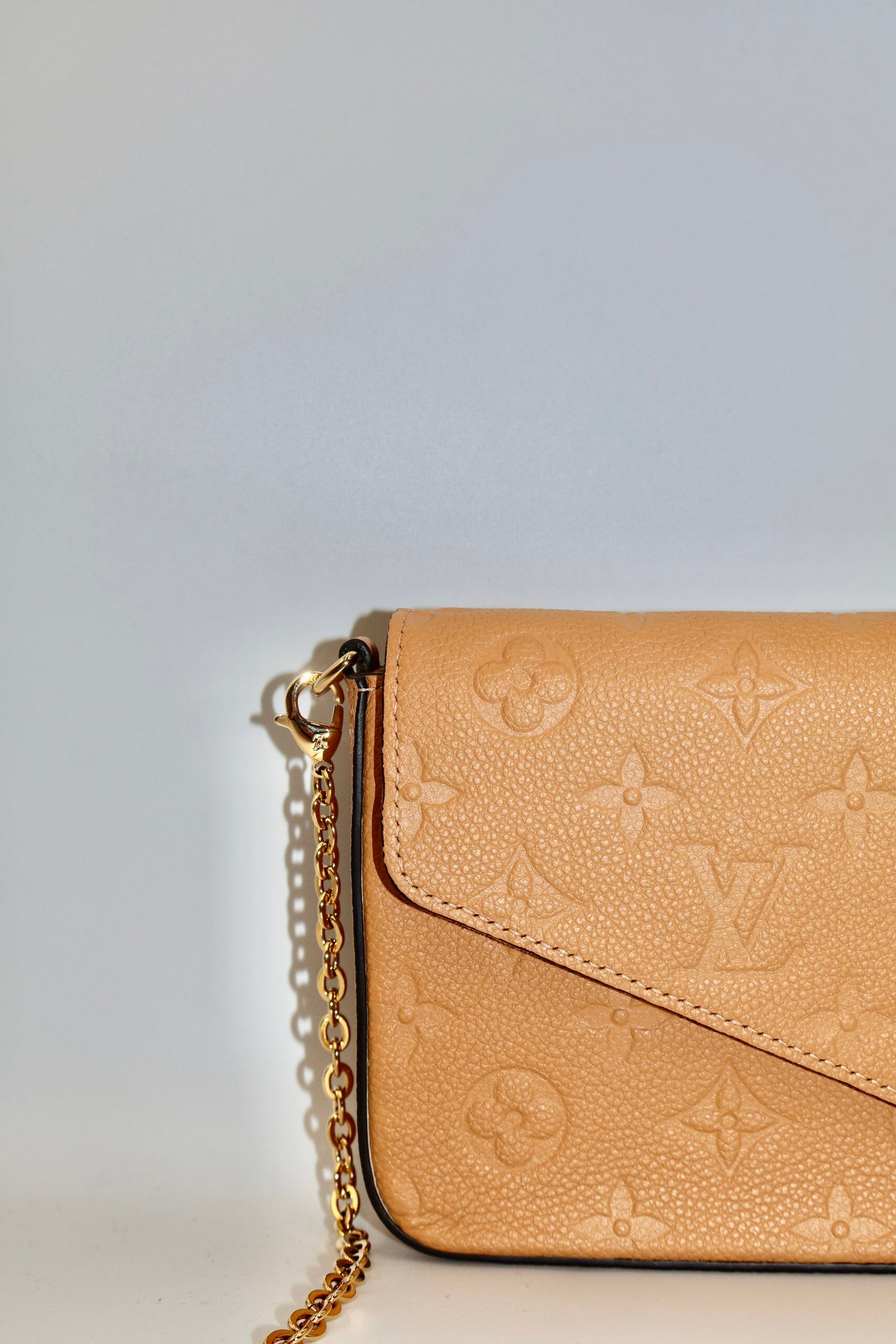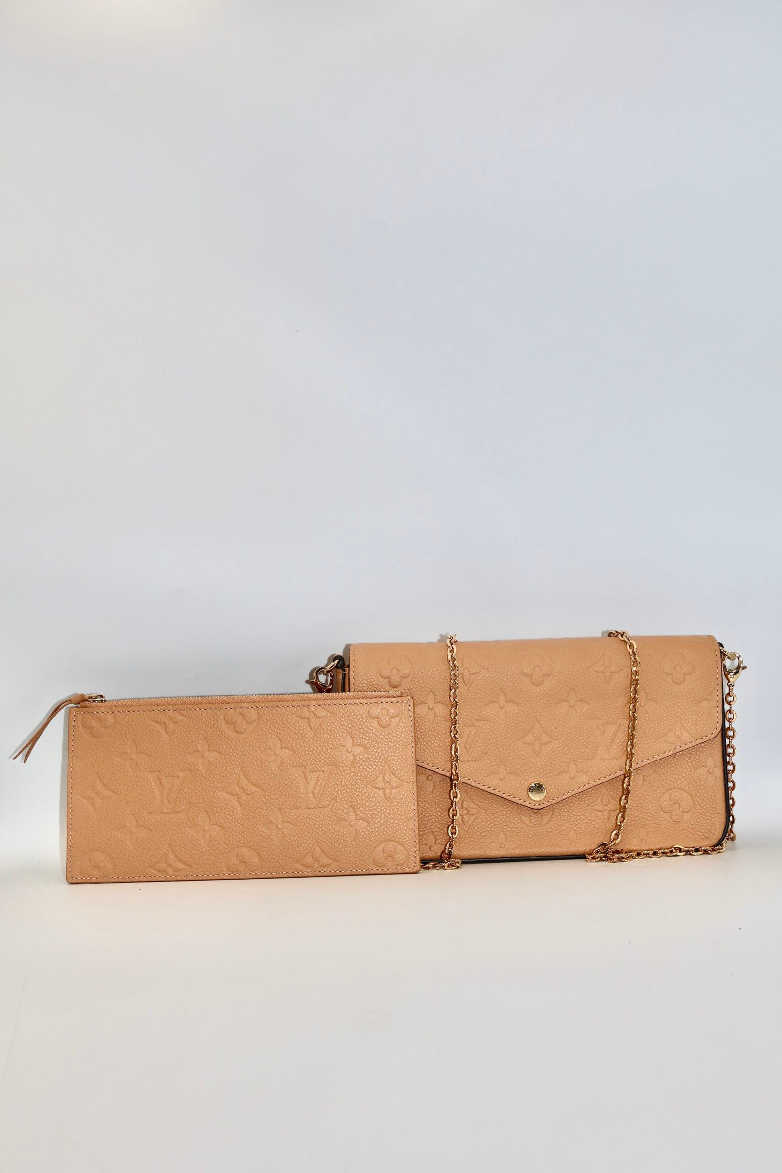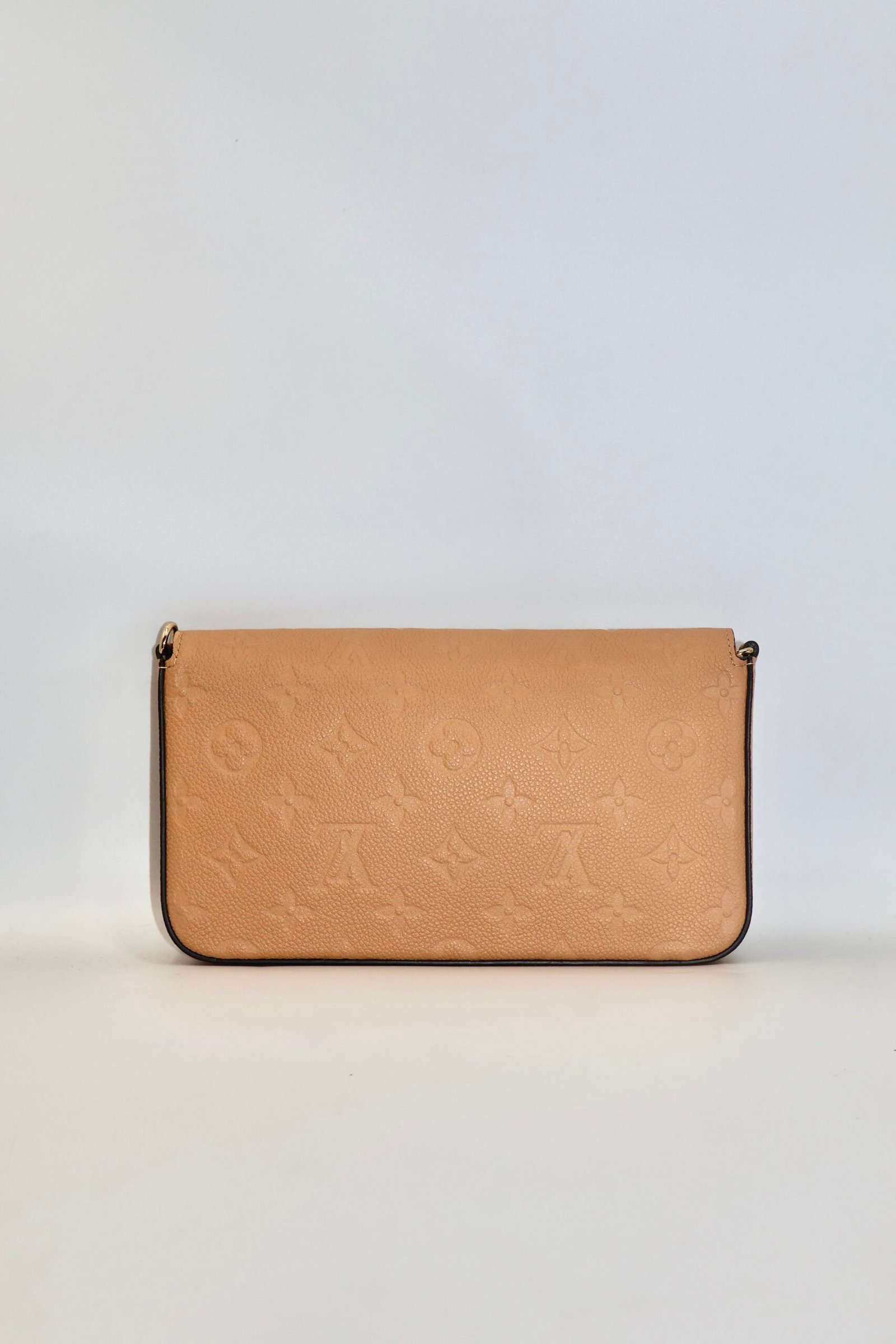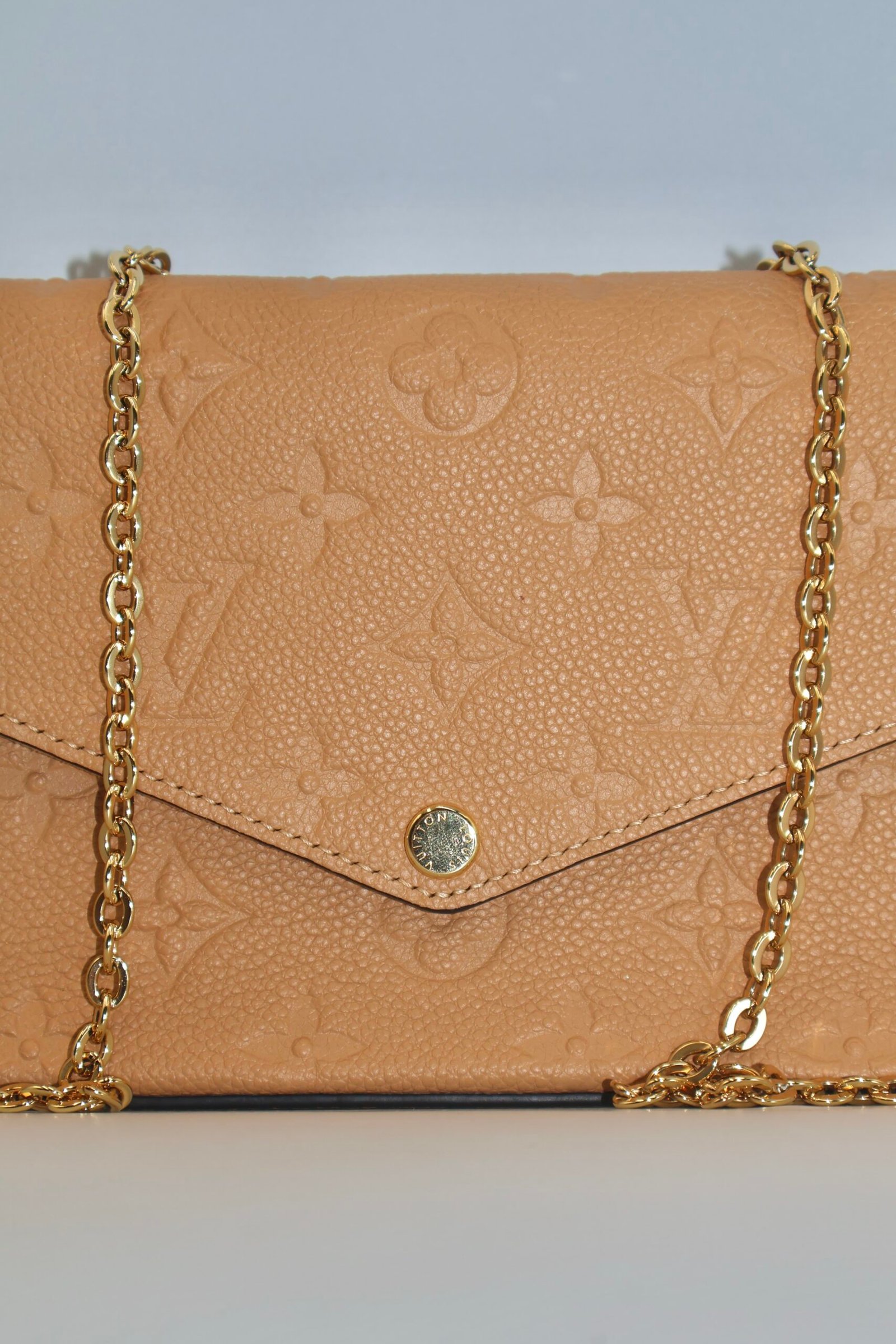 Bolso Louis Vuitton Felice con Pochette, esta confeccionado en piel de becerro granulada con el característico grabado Monograma Empreinte , en el tono Arizona ( un marrón claro con matices dorados) y detalles metálicos en color dorado, incluye dos accesorios un Pochette con cierre y un tarjetero plano con ocho ranuras , ademas cuenta con una cadena metálica desmontable , lo que permite llevarla como bolso cruzado , de hombro o como clutch de mano, Fullset.