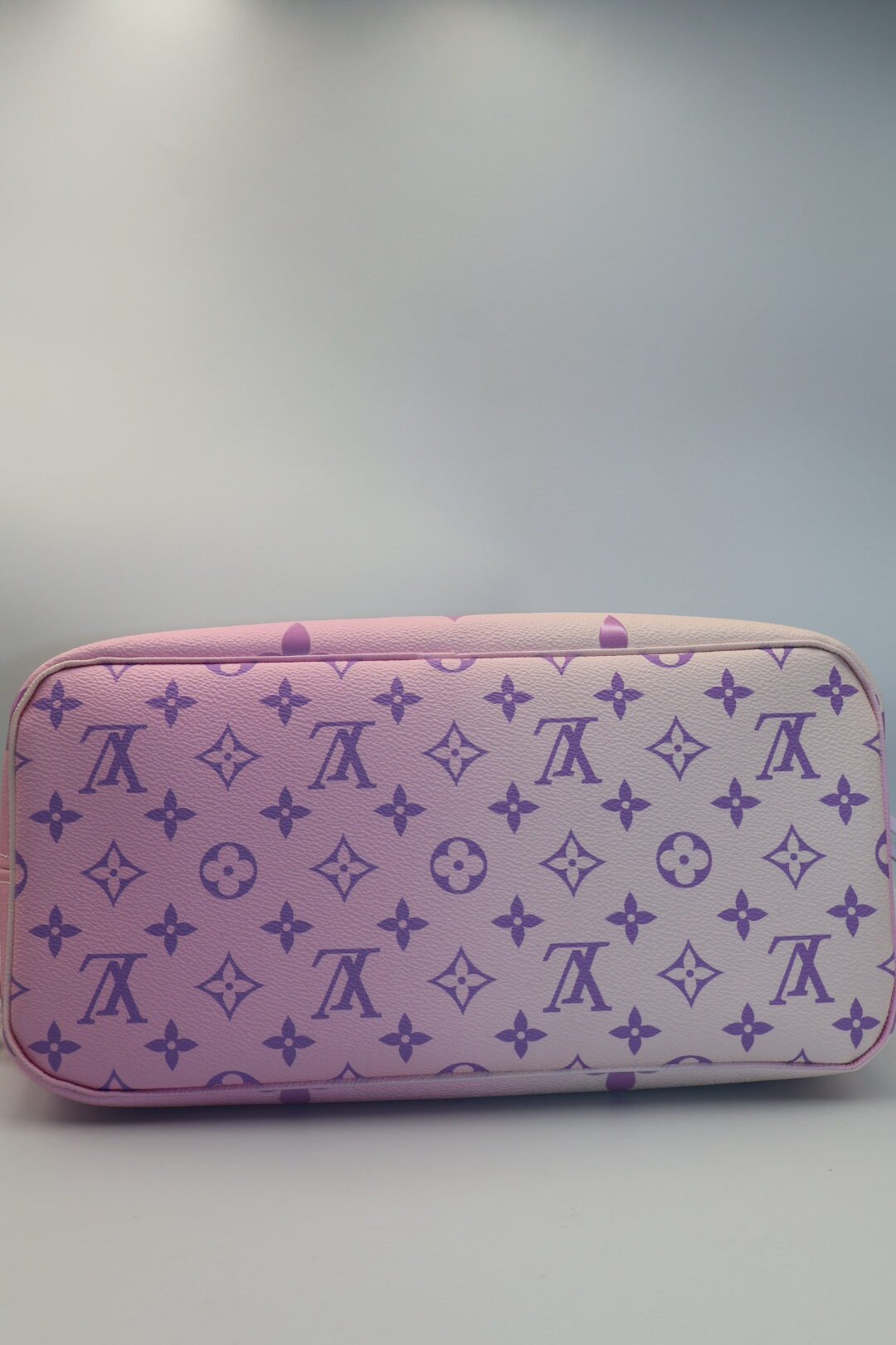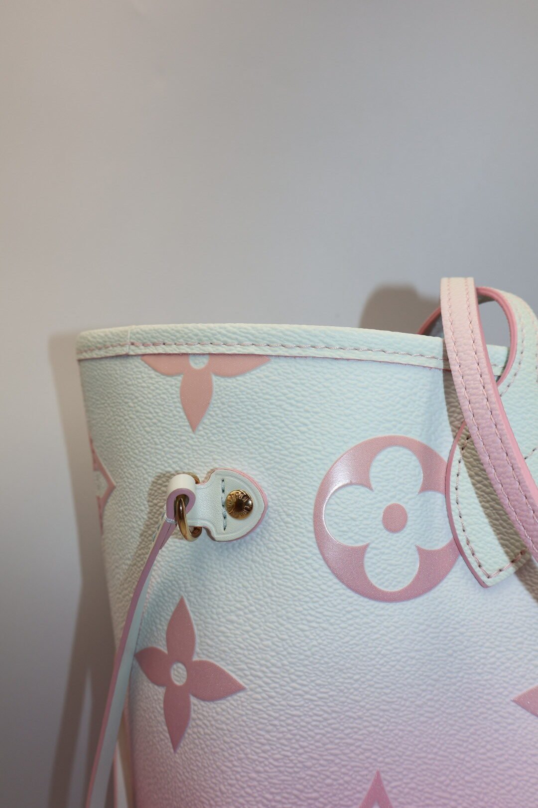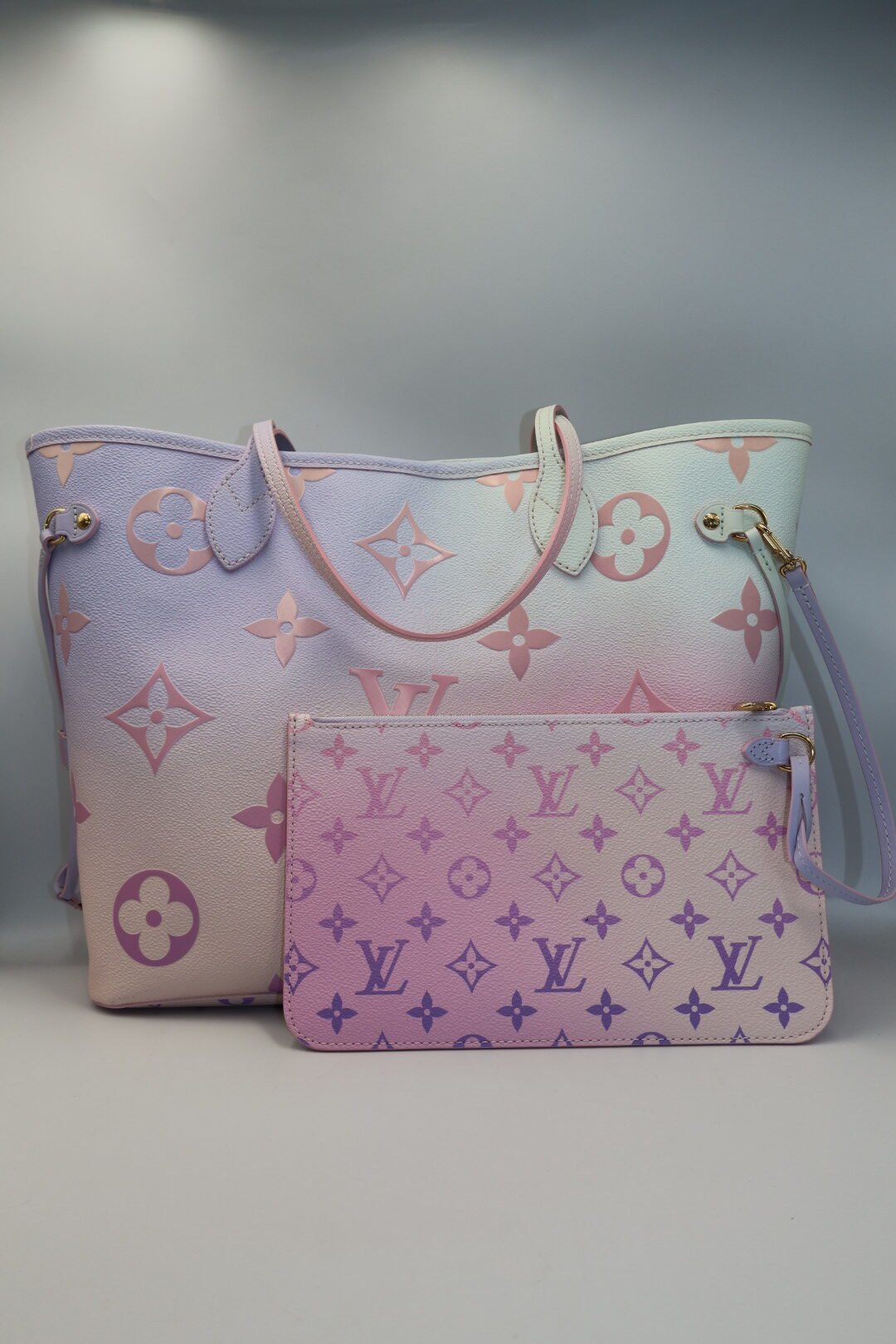 Bolso LV neverfull edición ilimitada pastel amanecer, confeccionada en lona recubierta con monograma , cordones laterales de piel de vacuno y forro de sari estampado, presenta herrajes en color dorado , gancho de seguridad para asegurar pertenencias, amplio bolsillo interior con cremallera , bolso extraible con cremallera impresa y anillo en forma D, Preloved, solo incluye cubrepolvo.