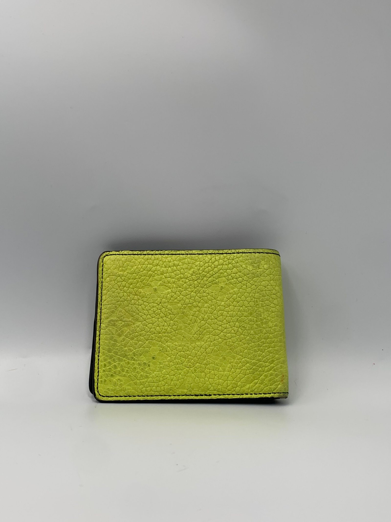 Cartera plegable de diseño moderno, fabricada en cuero con textura granulada , presenta un exterior compacto y rectangular con un llamativo bloque amarillo lima y un patrón geométrico en blanco y azul grisáceo , los bloques están unidos por costuras dentadas decorativas y costuras exteriores negras , Preloved.