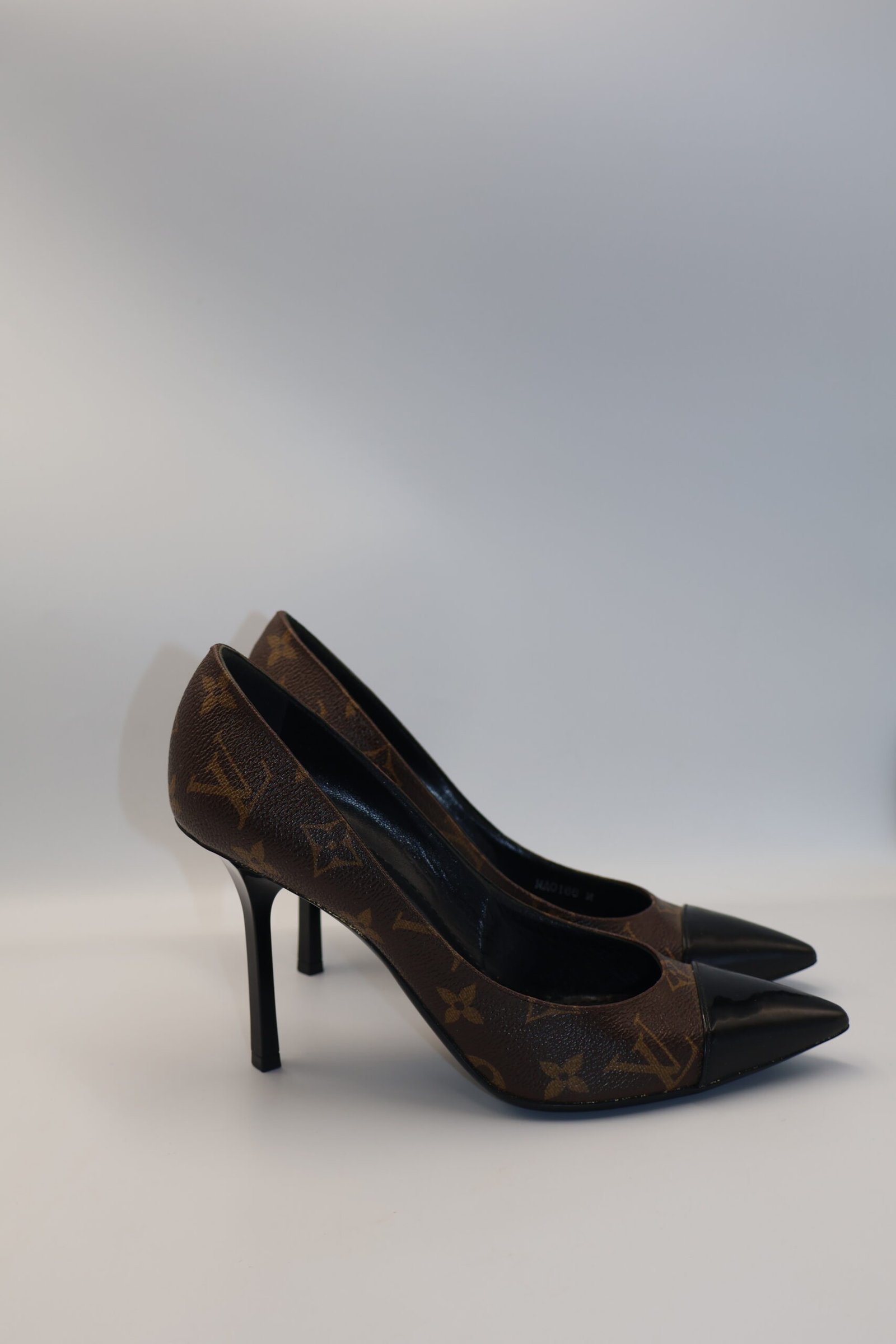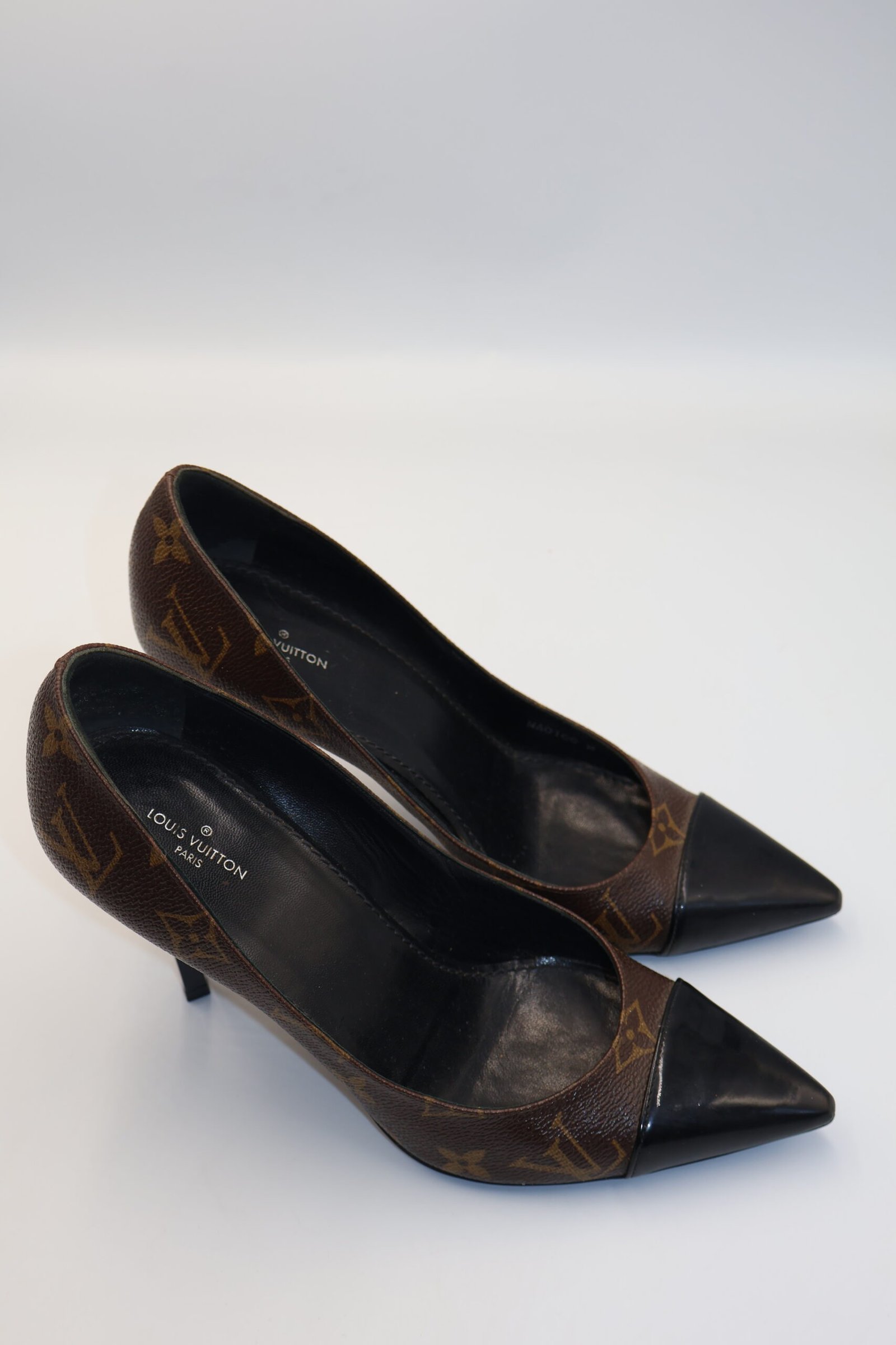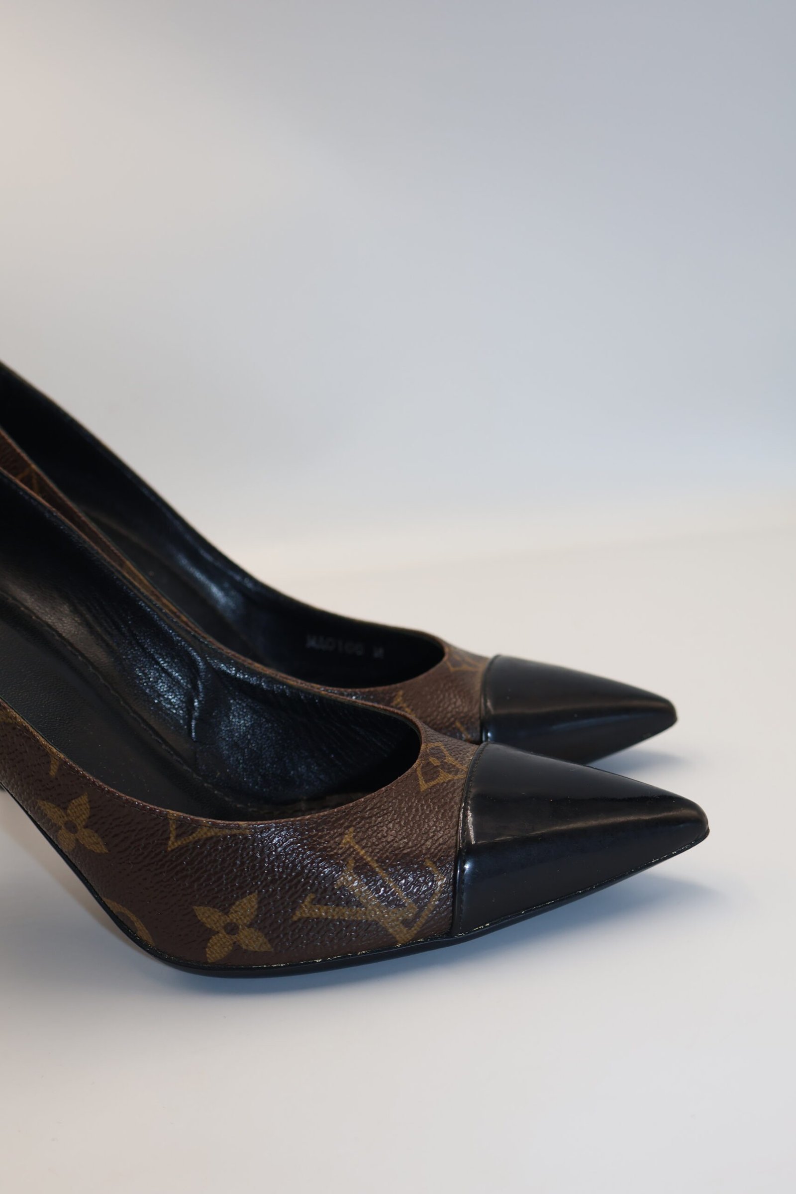 Tacones Louis Vuitton, en color marrón elaboradas en piel y lona con monograma , con puntera en punta y detalle de costura , ademas de tacón alto , hechas en Italia, presentan exterior de lona y charol, forro de cuero y suela de cuero, Size 37 1/2, Preloved.
