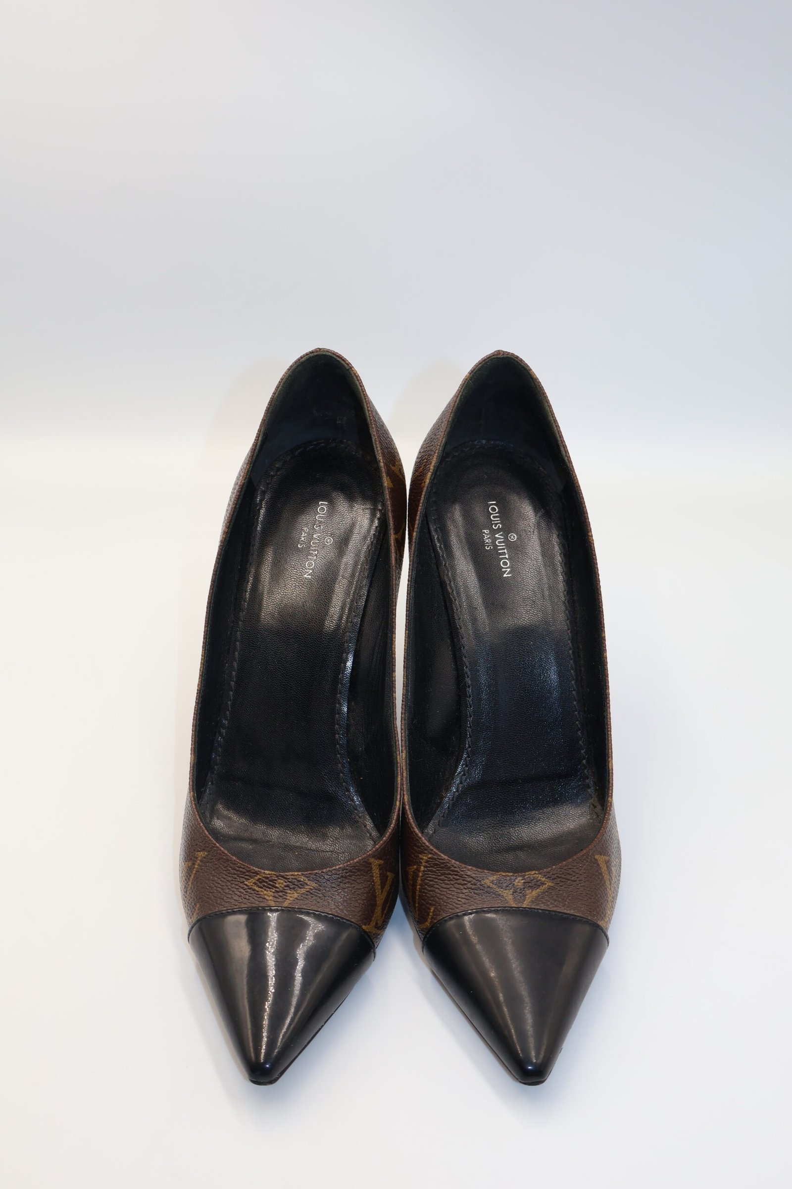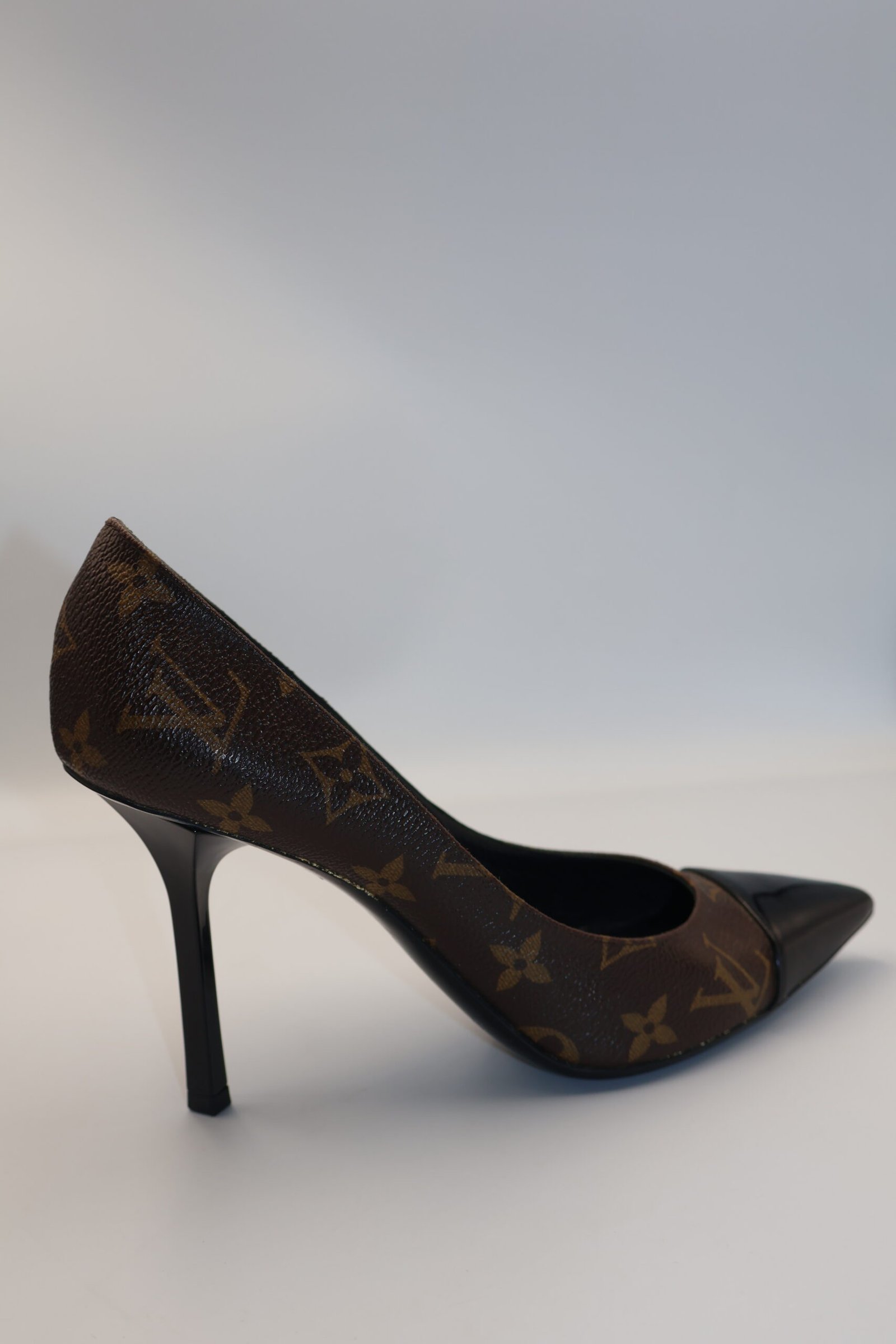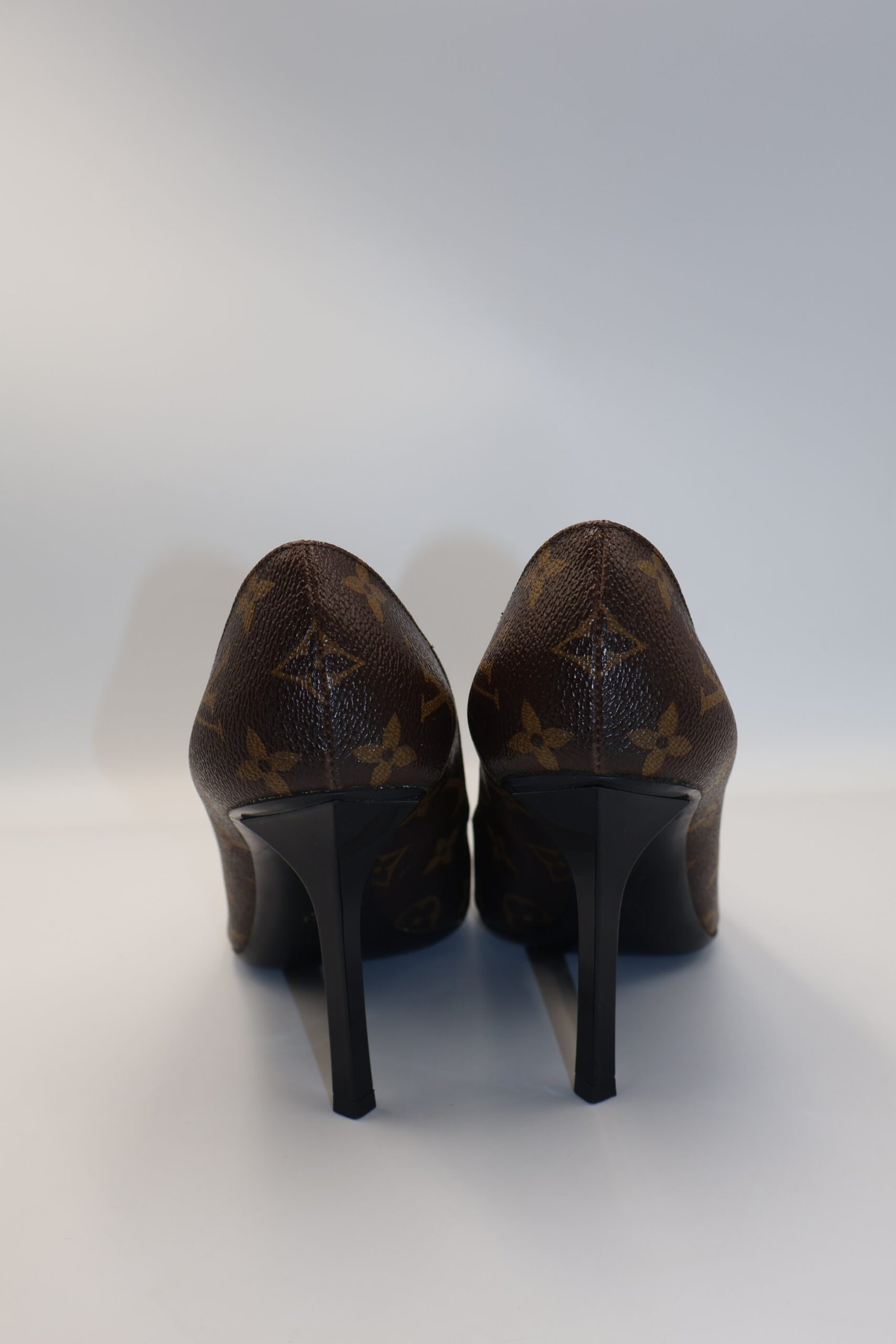 Tacones Louis Vuitton, en color marrón elaboradas en piel y lona con monograma , con puntera en punta y detalle de costura , ademas de tacón alto , hechas en Italia, presentan exterior de lona y charol, forro de cuero y suela de cuero, Size 37 1/2, Preloved.