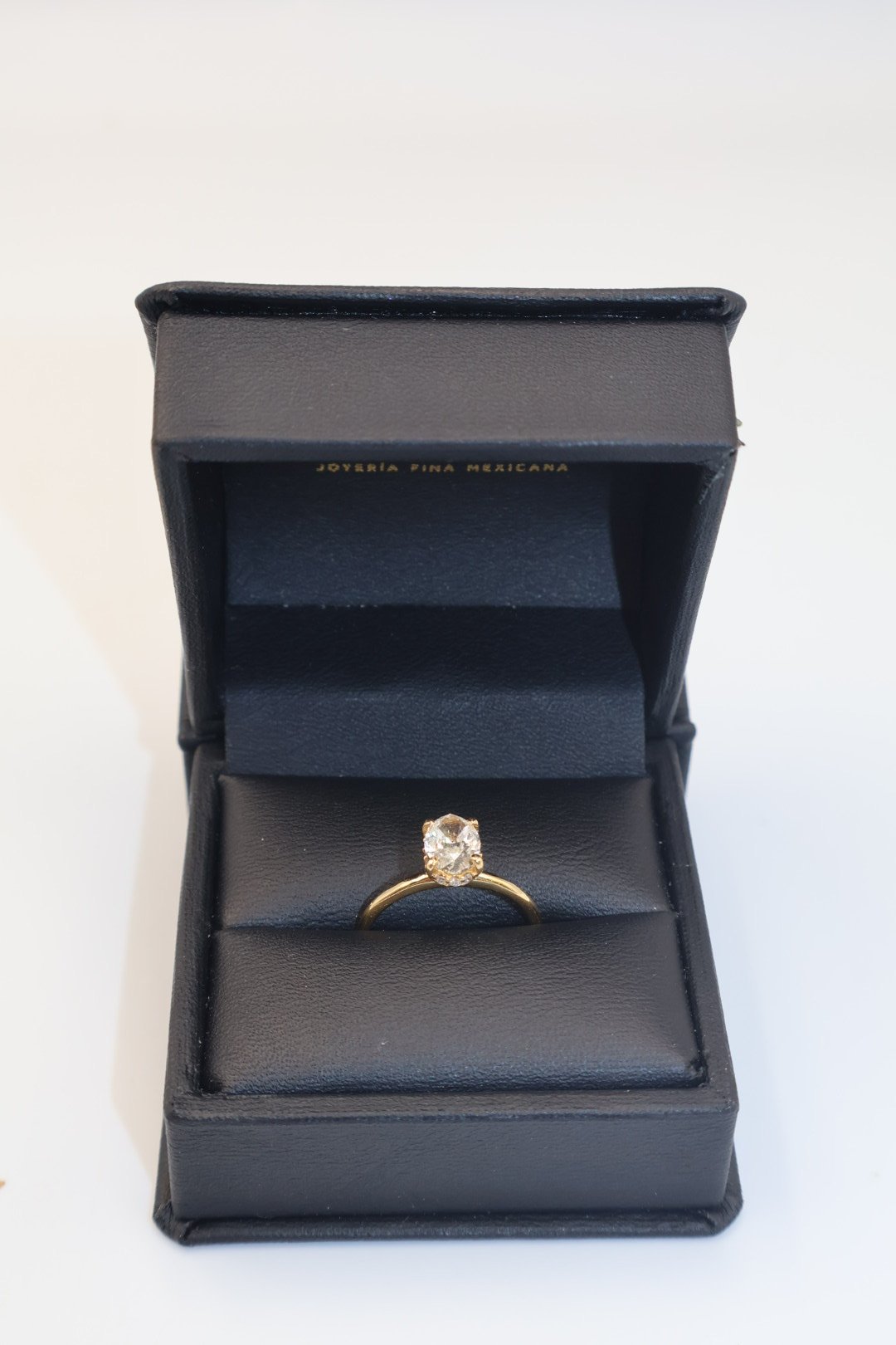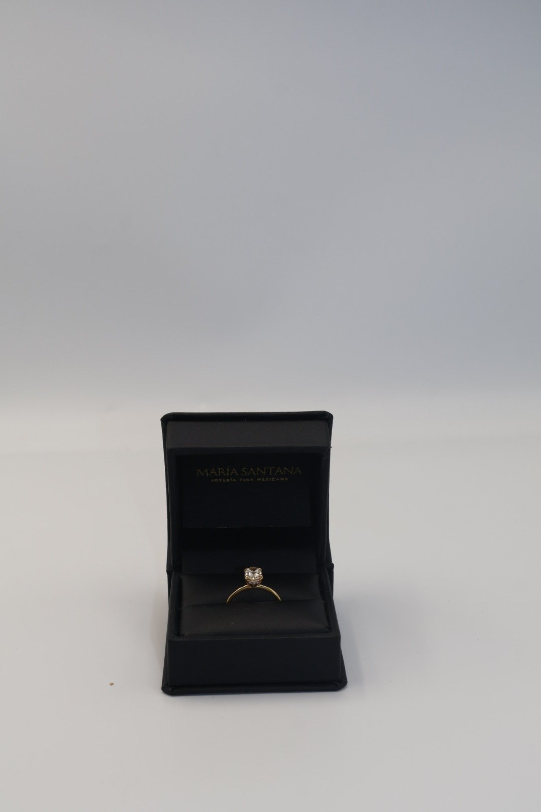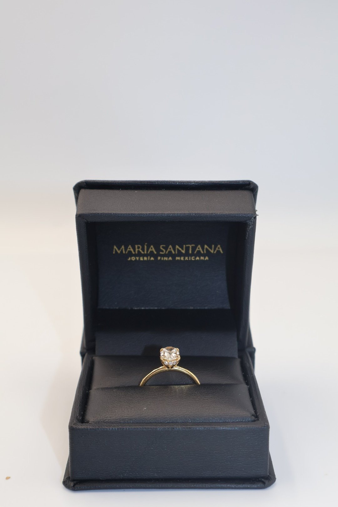 Este es un anillo solitario con un corte radiante de moissanita, se describe como un anillo elegante con un engaste de cuatro puntas y una banda de ancho consistente , una característica única es un halo oculto de pequeñas piedras de acento abajo de la piedra central, que le da un brillo sutil y fascinante, es la medida 6 ,viene fullcet , con certificado y caja.