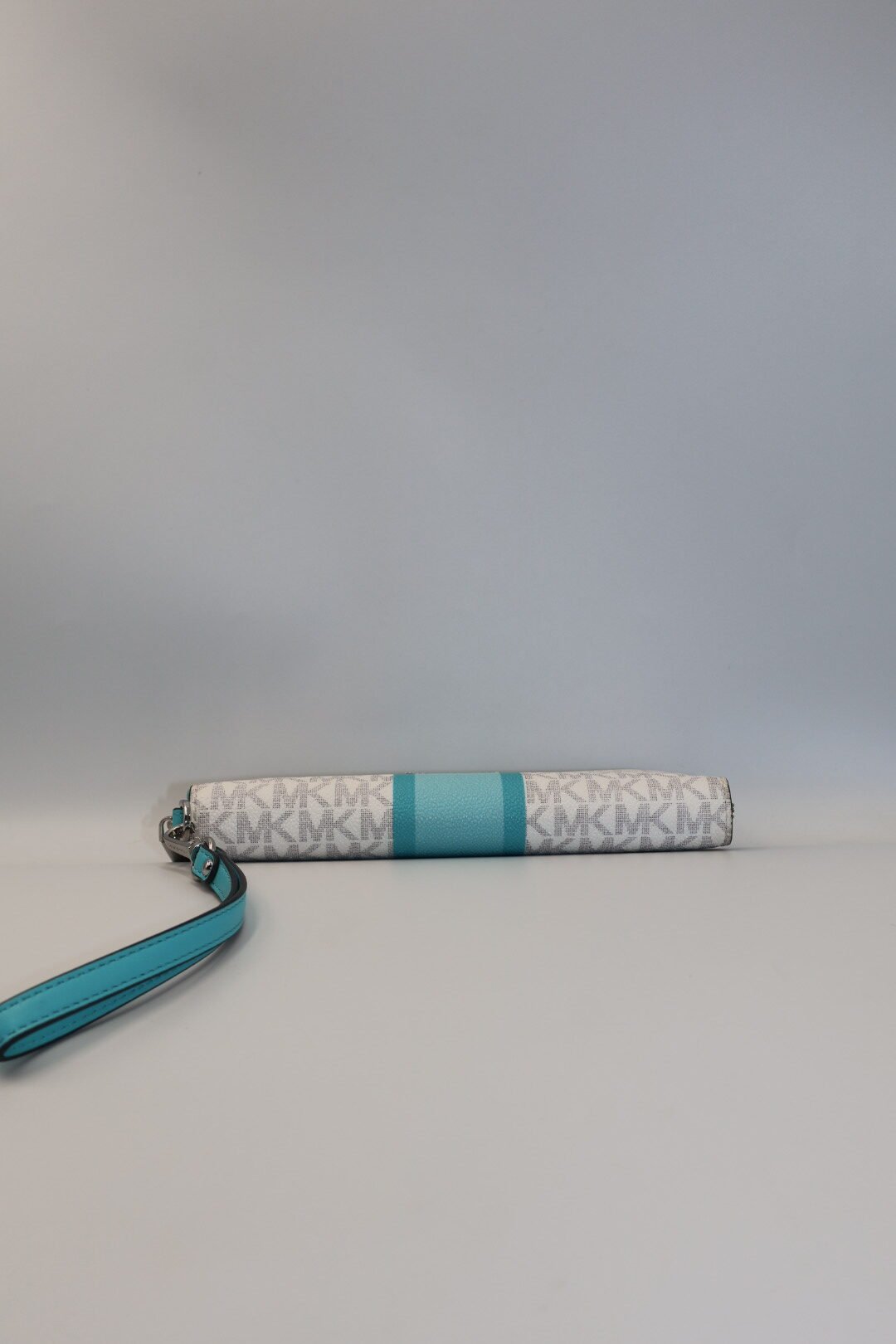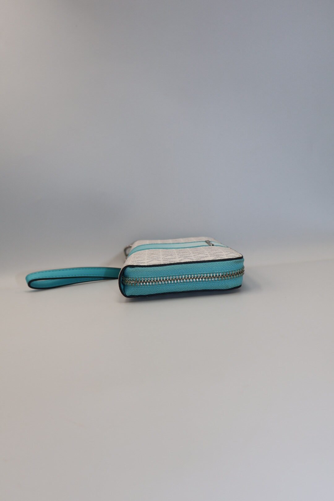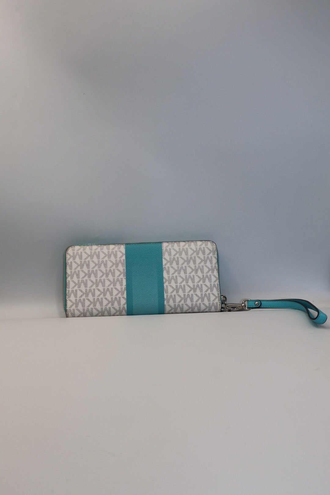 Esta cartera, esta fabricada en lona con estampado signature y llamativas rayas centrales ombre, es de lona revestida y poliéster, cuenta con un bolsillo exclusivo para el teléfono y numerosas ranuras para tarjetas para una fácil organización , imprescindible para viajar o ir al trabajo, se puede guardar fácilmente en el bolso, con errajes plateados con un cierre con cremallera, en color vainilla con detalles turquesa, viene Preloved.