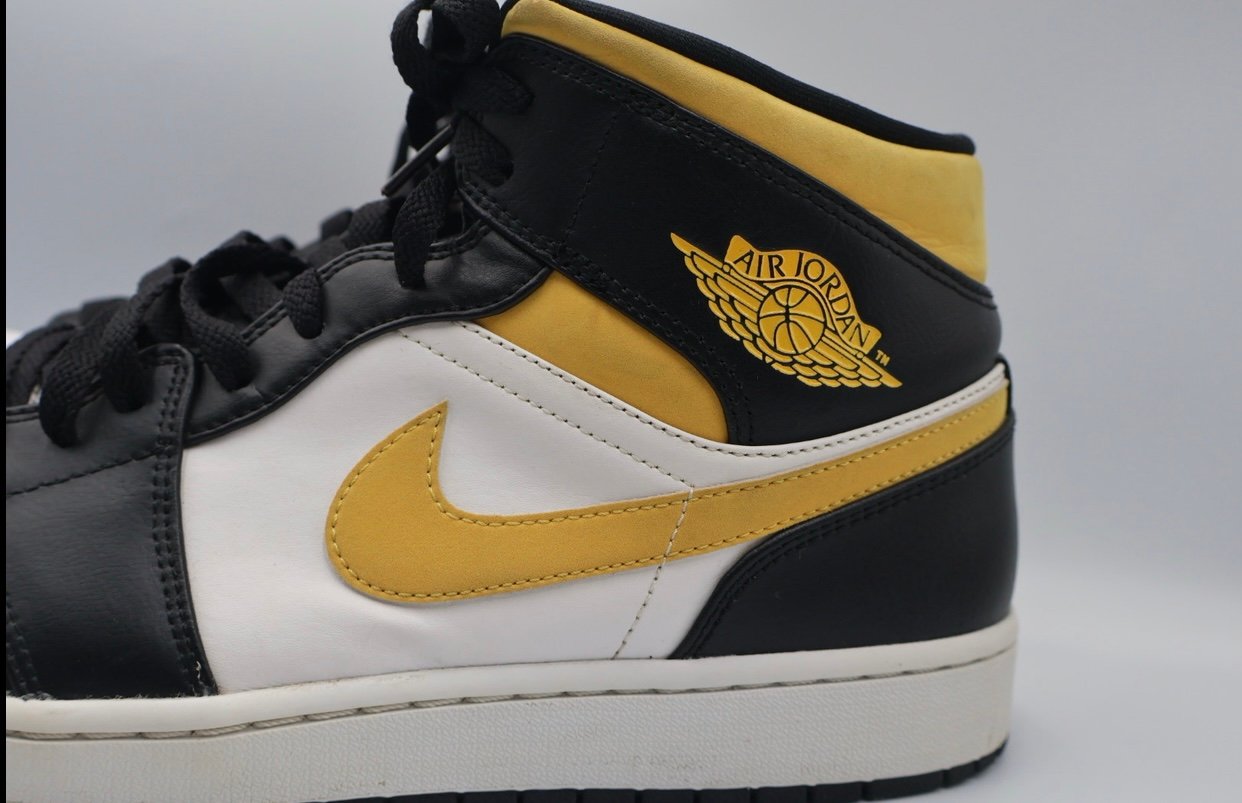 Tenis Air Jordan 1 Mid confeccionados en cuero, en una combinación de colores negro, blanco y amarillo , presentan detalle del logo característico de la marca , parche del logo en la lengüeta , cierre con agujetas en la parte delantera , putera redonda y suela plana de goma , ofreciendo un diseño icónico con comodidad y estilo urbano, size 10MXN , Preloved.