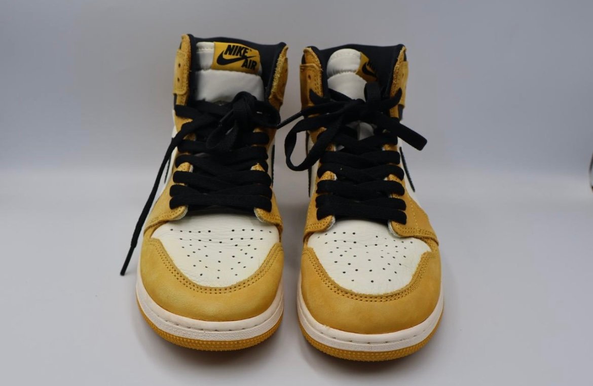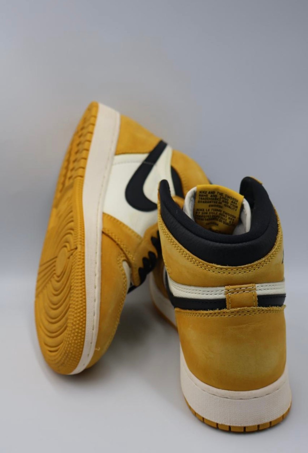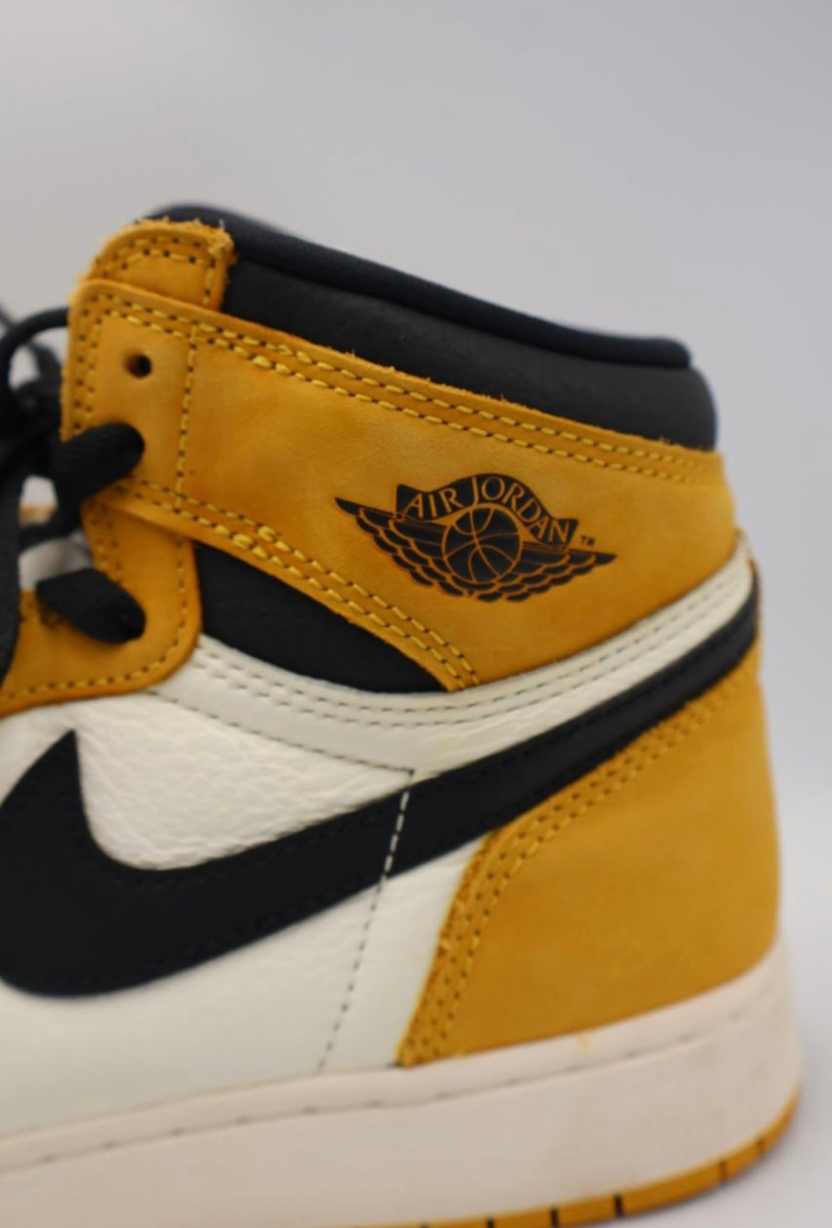 Los tenis presentan un diseño colour block en amarillo ocre, negro y blanco, sobre una base de cuero color vela, está confeccionada ene piel de becerro e incluyen detalles icónicos como el swoosh negro, el logotipo air jordán Wings en el cuello alto acolchonado y la puntera perforada, completa el look una suela de goma en tono crema, logrando un estilo retro y sofisticado que conecta el legado clásico con un toque moderno, size 6MXN, Preloved.