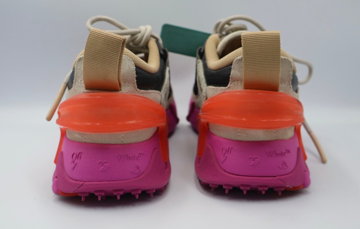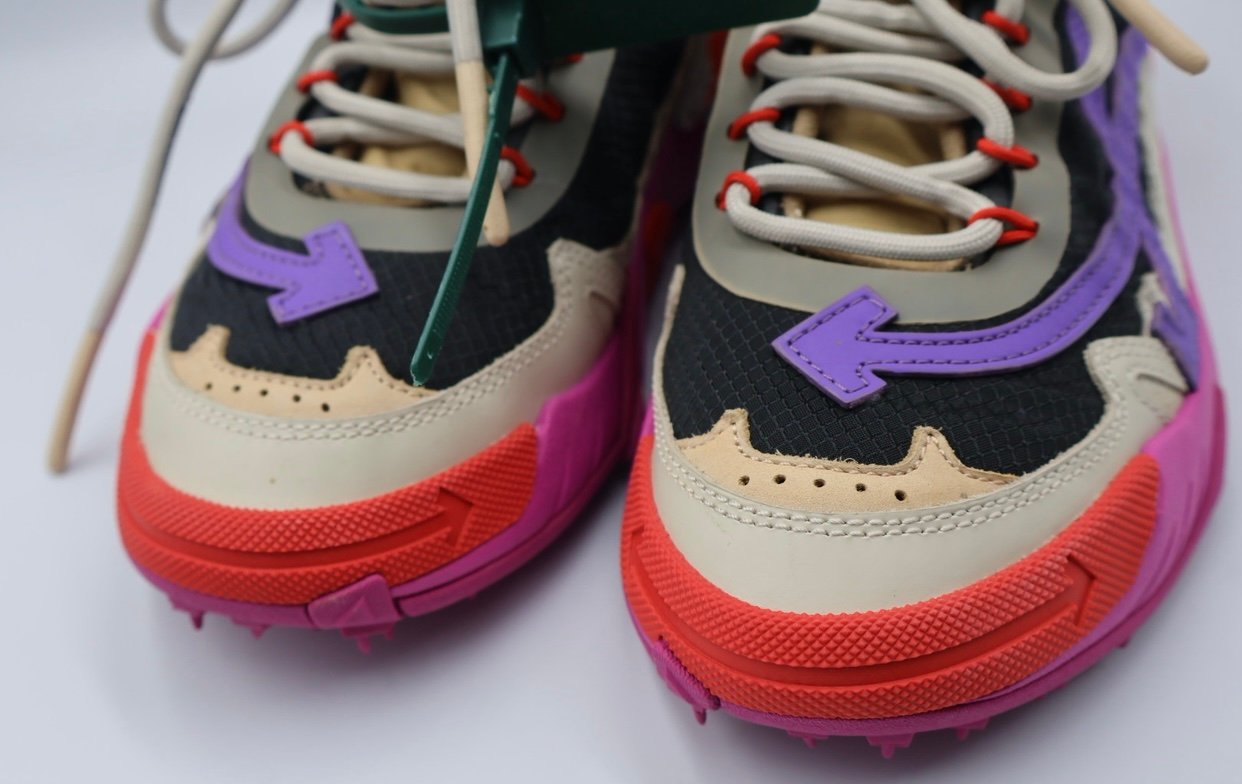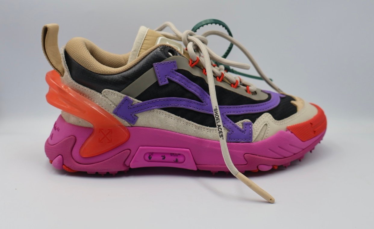 Tenis Off White , su material es de cuero, tela y gramuza multicolor , su suela de goma multicolor, cordones para su forma de cerrar, accesorios dust Bag, en size 4, nuevos.