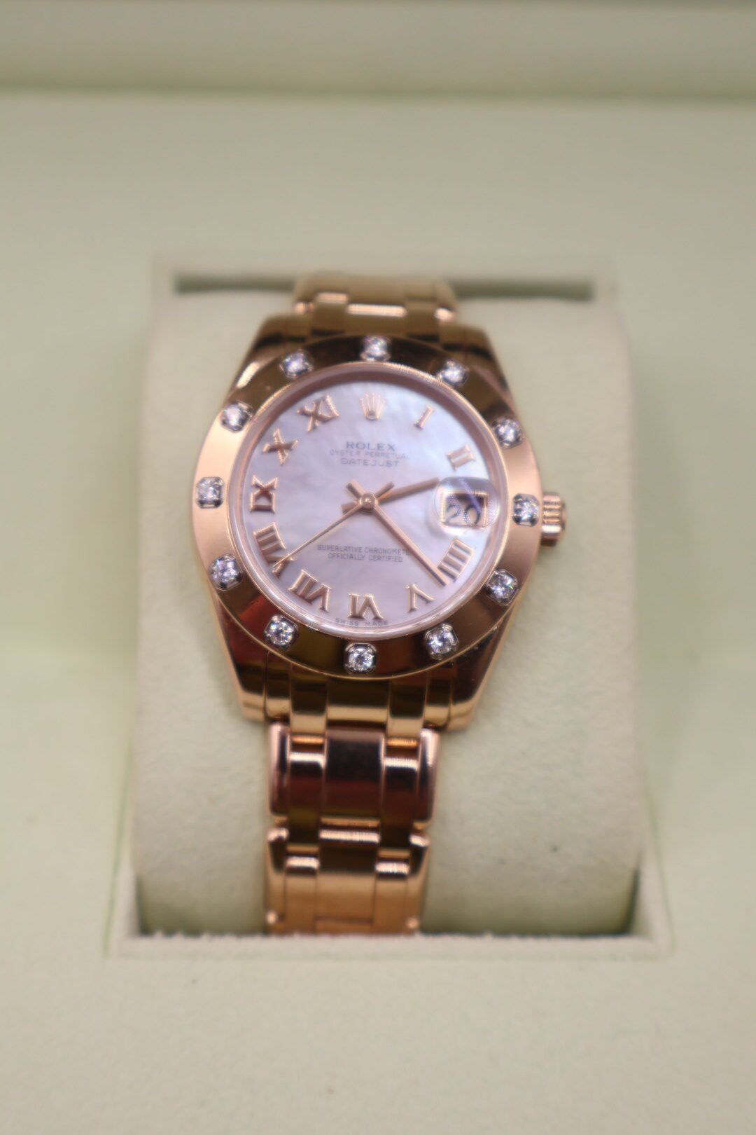 Rolex de dama Datejust en 0r0 de 18 quilates  Referencia 81315 ,caja y brazalete fabricados en everose y bisel engastado con 12 diamantes brillantes con una esfera dial madre perla blanca, tamaño de la caja 34 mm, movimiento automático con certificación oficial  de cronómetro cristal zafiro resistente a las gayaduras con lente  Cyclops sobre fecha ,resistente al agua hasta 100 metros fullset (caja y tarjeta). Preloved