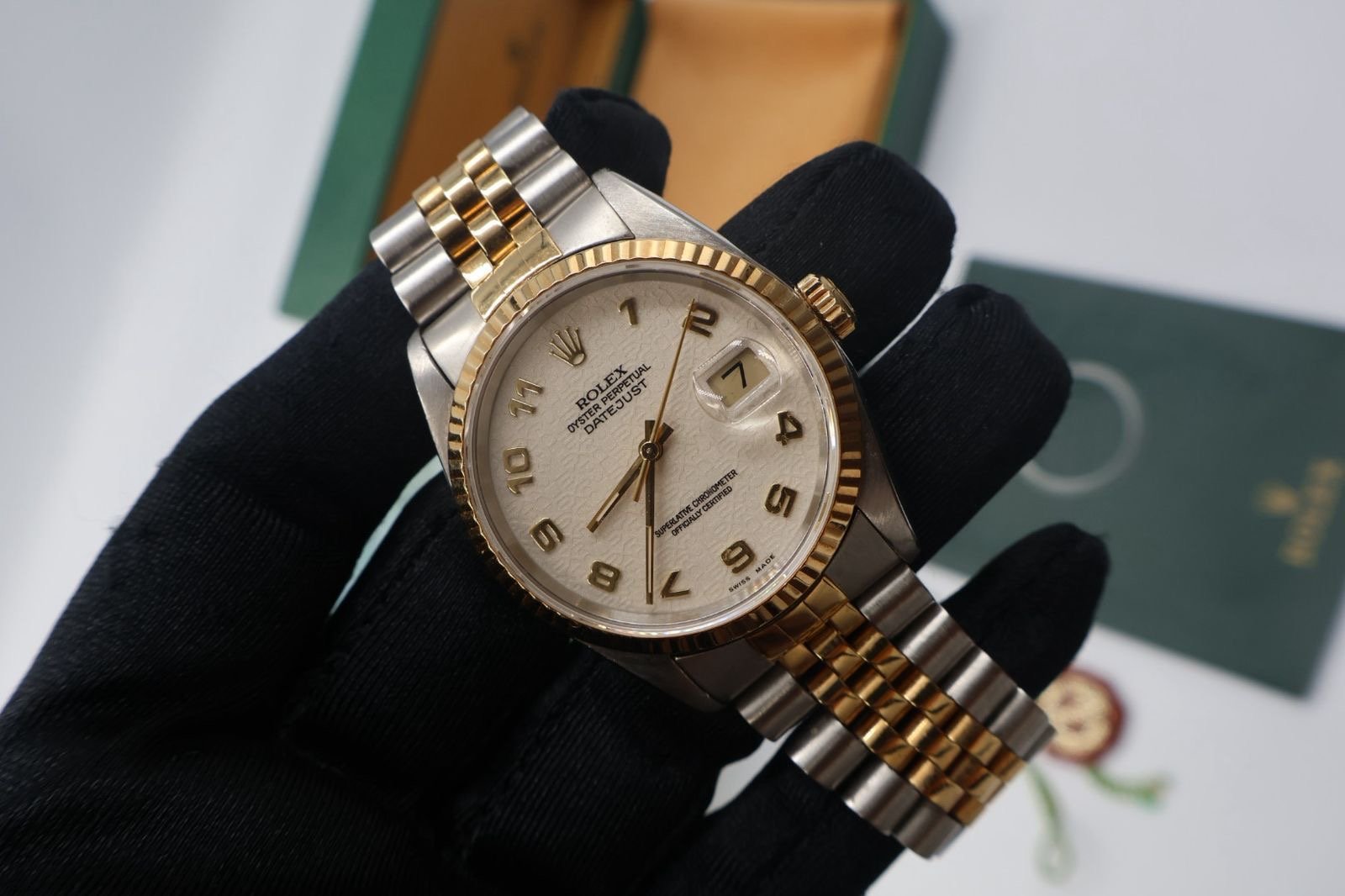 Reloj Date just en excelente estado de conservación , caratula aniversario, elegante y clásica , que realza el diseño atemporal del modelo, brazalete jubilee original en acero y oro amarillo, incluye caja original, manuales, protector de bisel, ya que es un conjunto muy completo y atractivo para el uso personal como para colección.