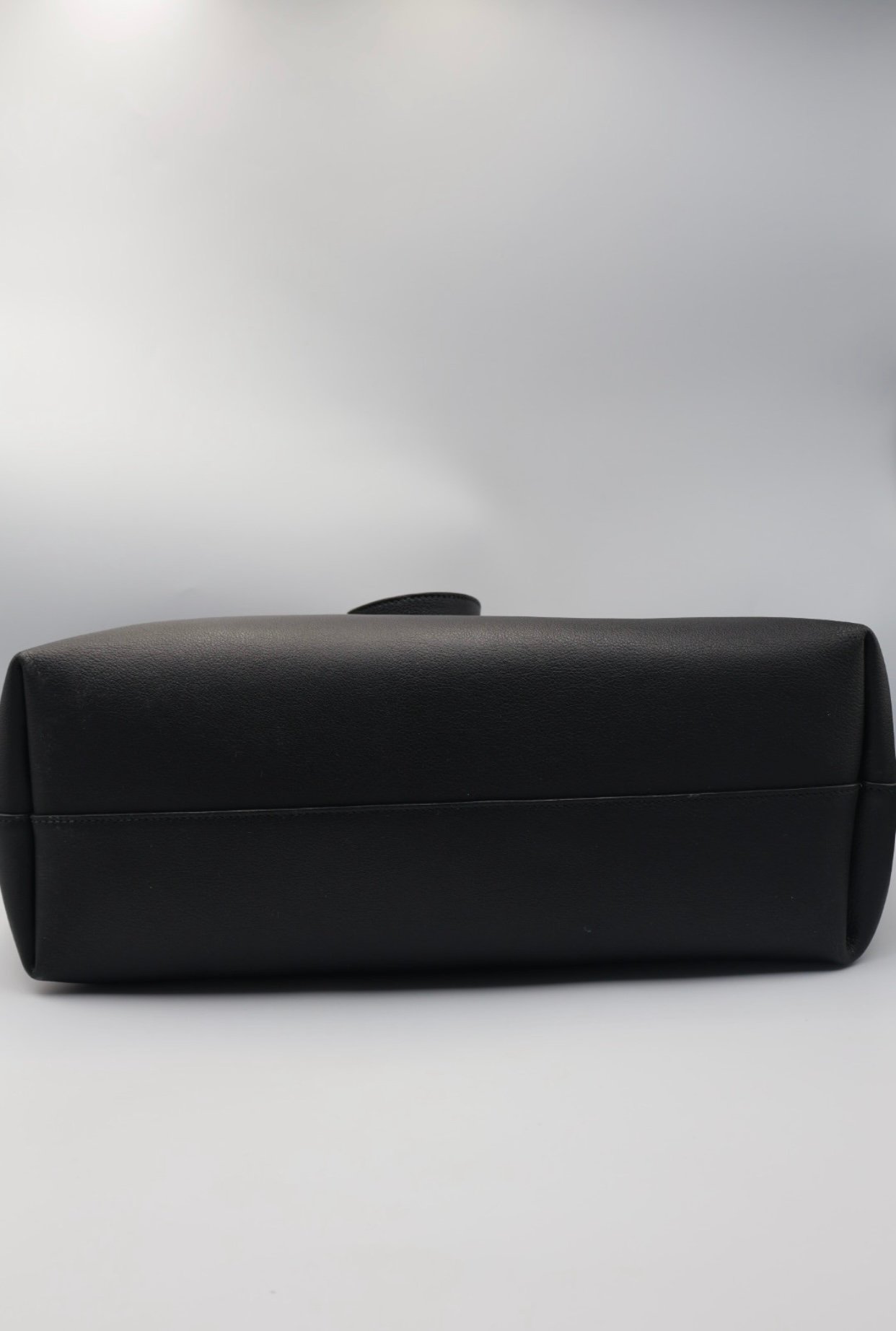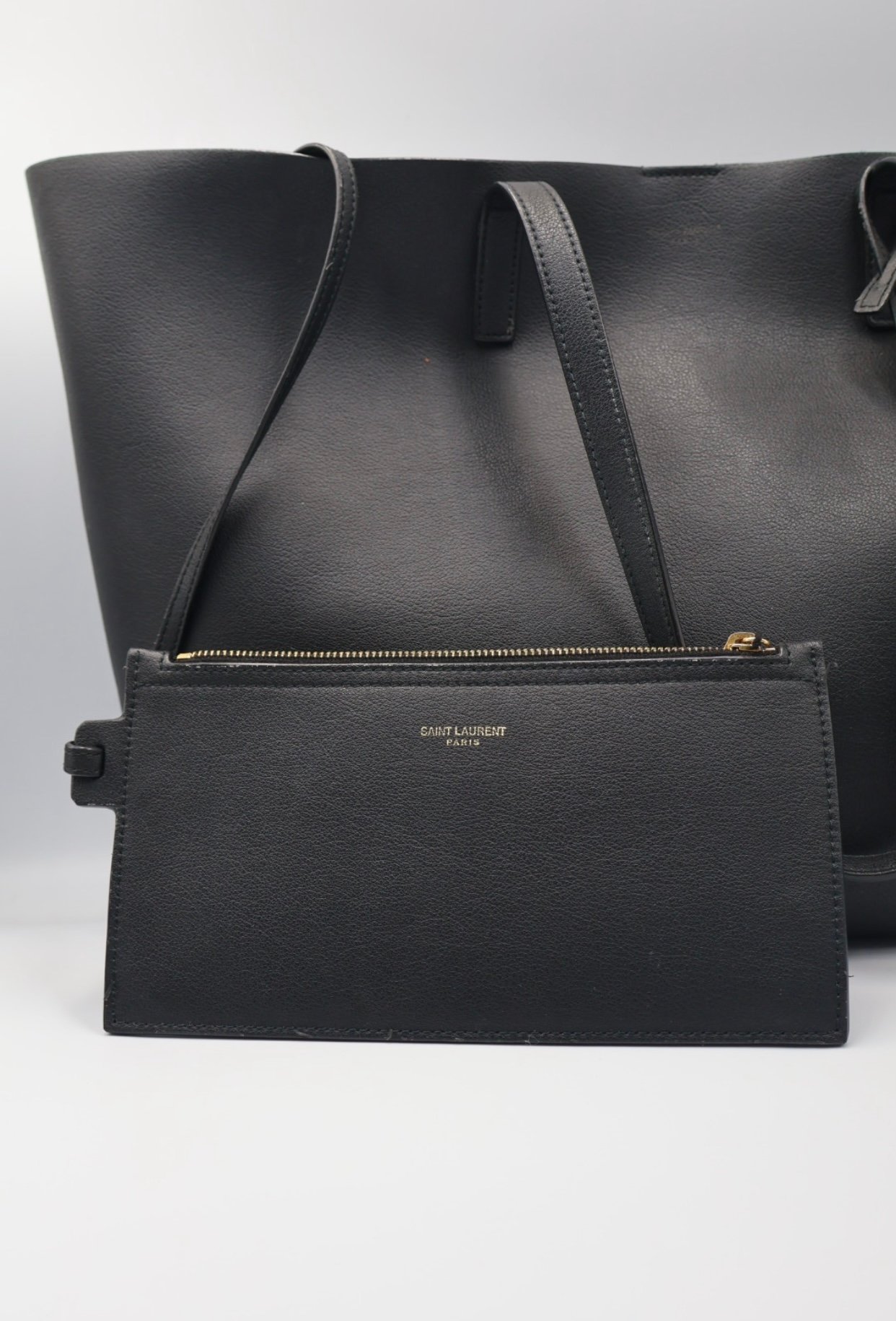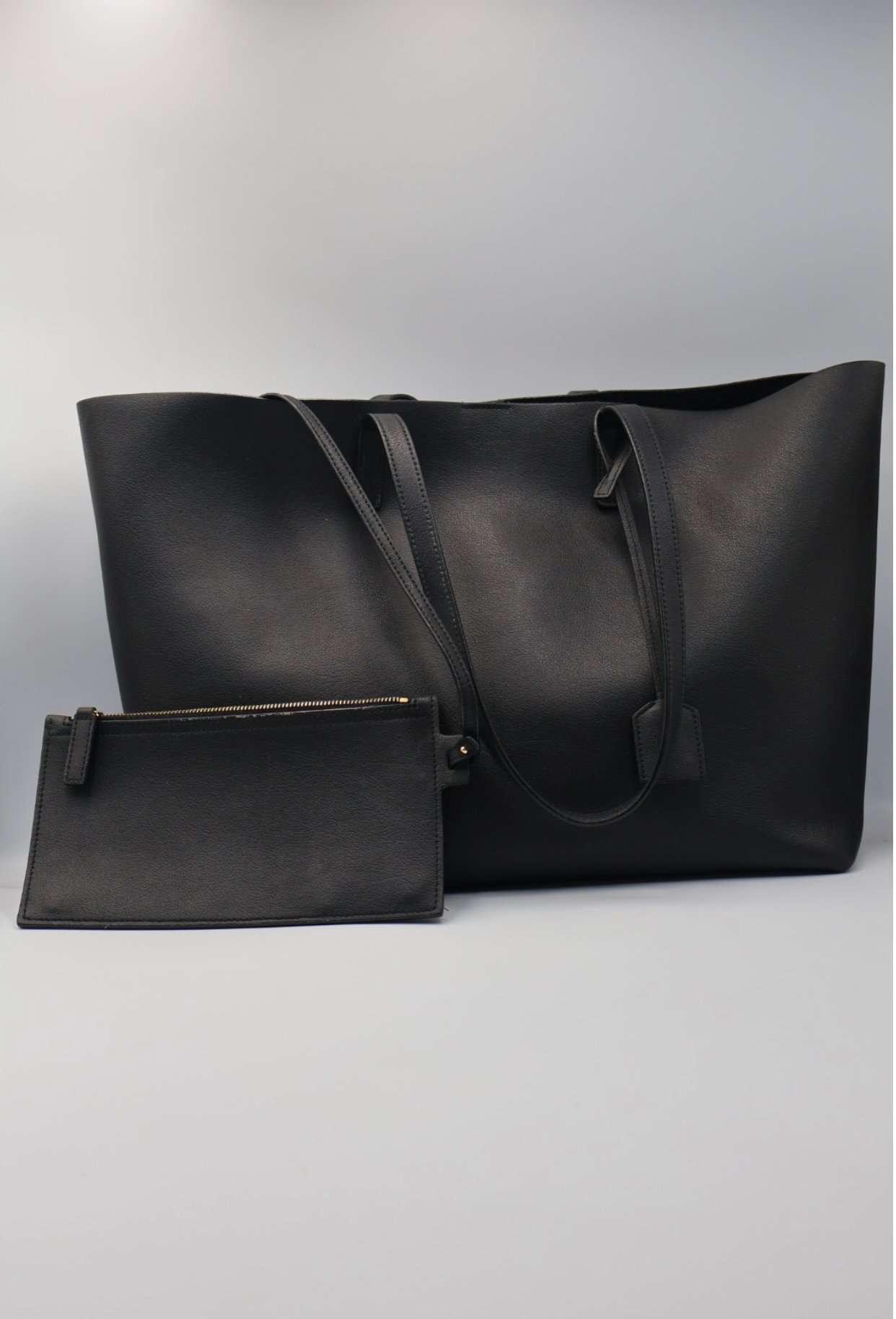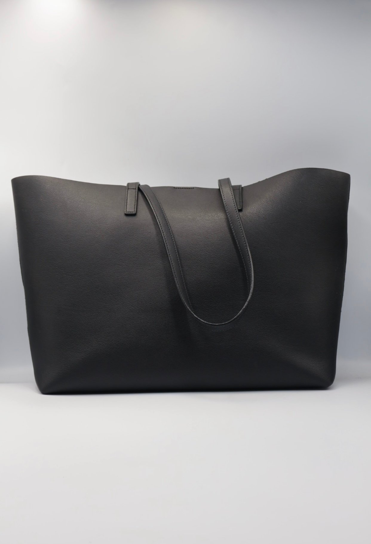 Bolso tote west de YSL un modelo grande, flexible y ligero, confeccionado en piel de becerro y cuero negro liso, con una estructura que aporta un estilo elegante y funcional, cuenta con asas superiores planas de cuero para llevar cómodamente al hombro, una parte superior abierta con cierre de botones magnético a presión y incluye ponchette, Preloved, incluye cubrepolvo.
