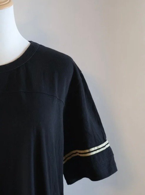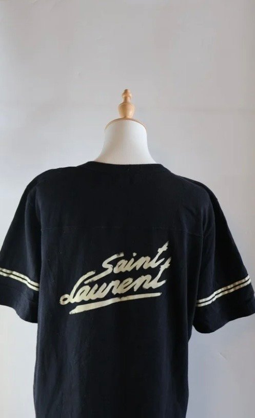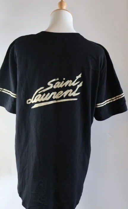 Camiseta Saint Laurent camiseta en color negro, confeccionada en algodón que destaca por su estilo cómodo y de lujo, en la parte trasera presenta el logotipo de la marca en una tipografía de estilo caligráfico en color crema , aportando un toque distintivo y elegante, ademas, las mangas cortas incorporan dos franjas horizontales blancas en el borde exterior, laque añade un detalle deportivo y moderno al diseño general en la prenda, Size chica, Preloved.
