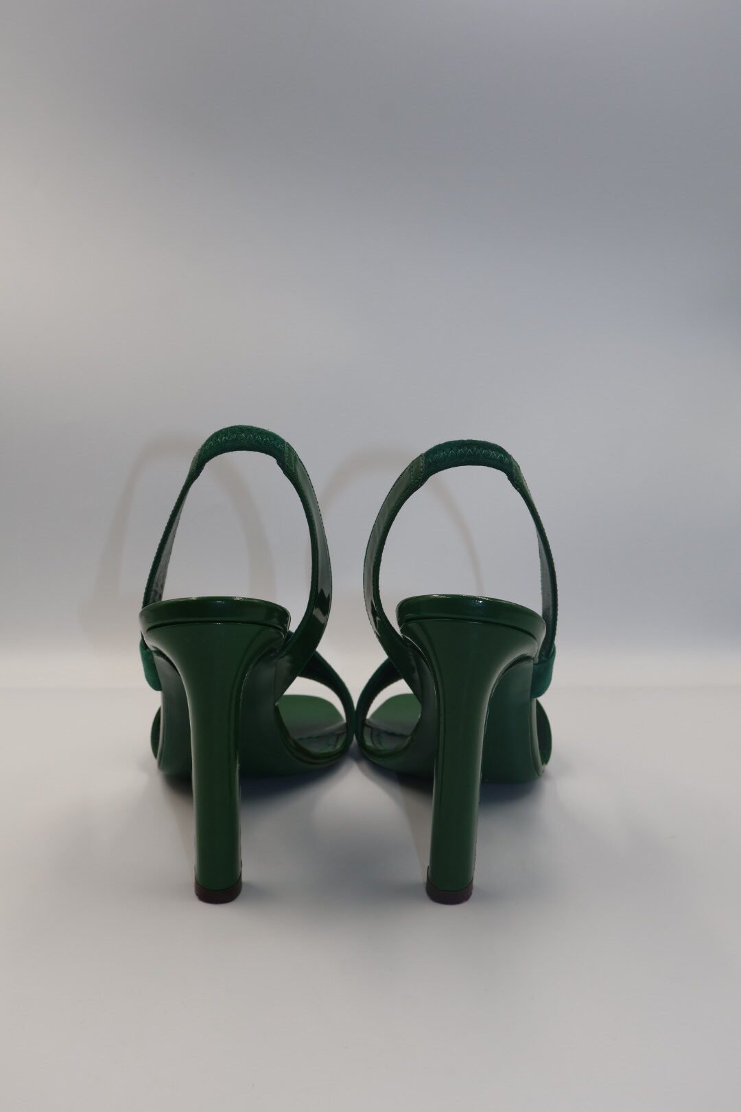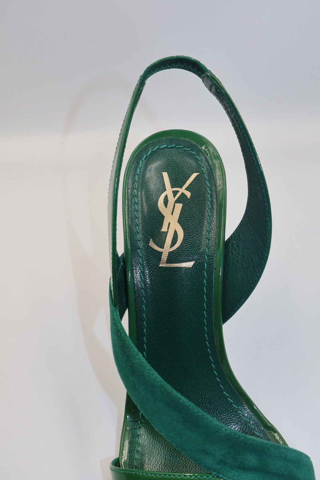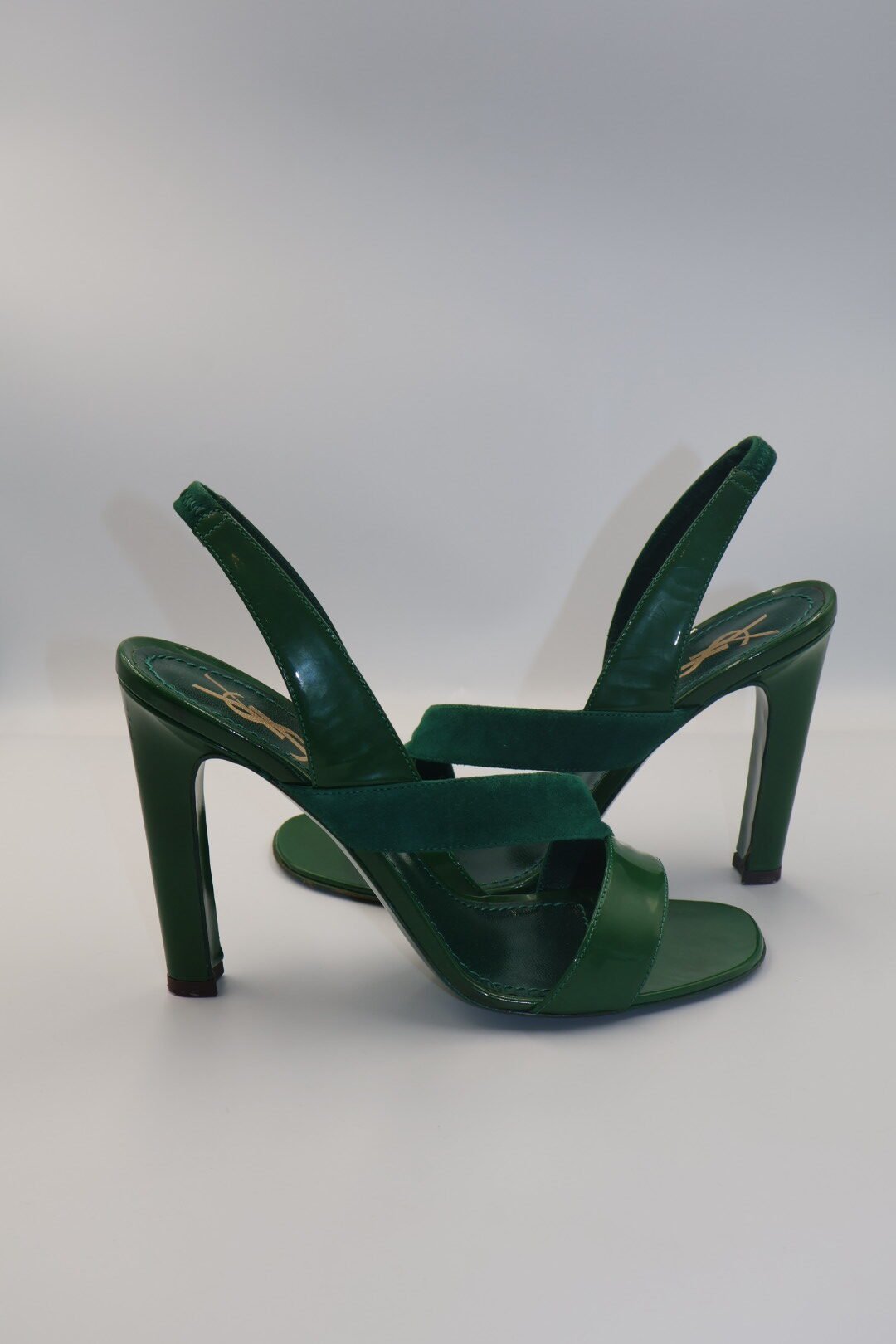 Estos son un par de tacones en color verde, con una combinación de materiales con correas cruzadas de charol brillante y gamuza, tienen punta cuadrada y abierta, y una tira fina en el tobillo con cierre de hebilla, el logotipo YLS dorado también esta presente en la plantilla interior de los tacones , son en talla 39, vienen fullcet.