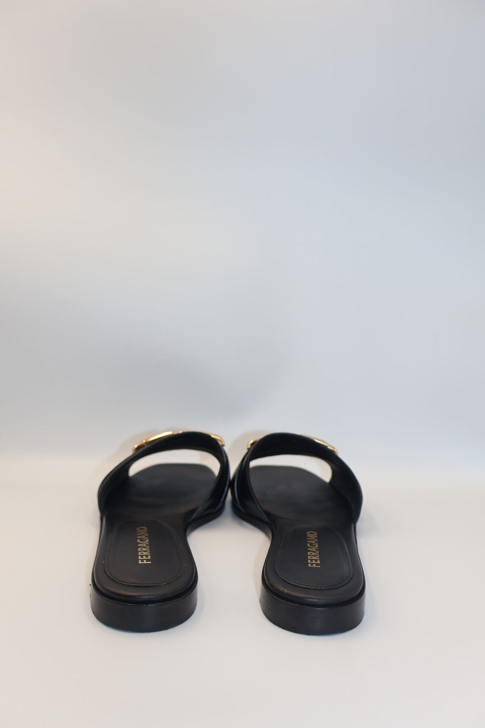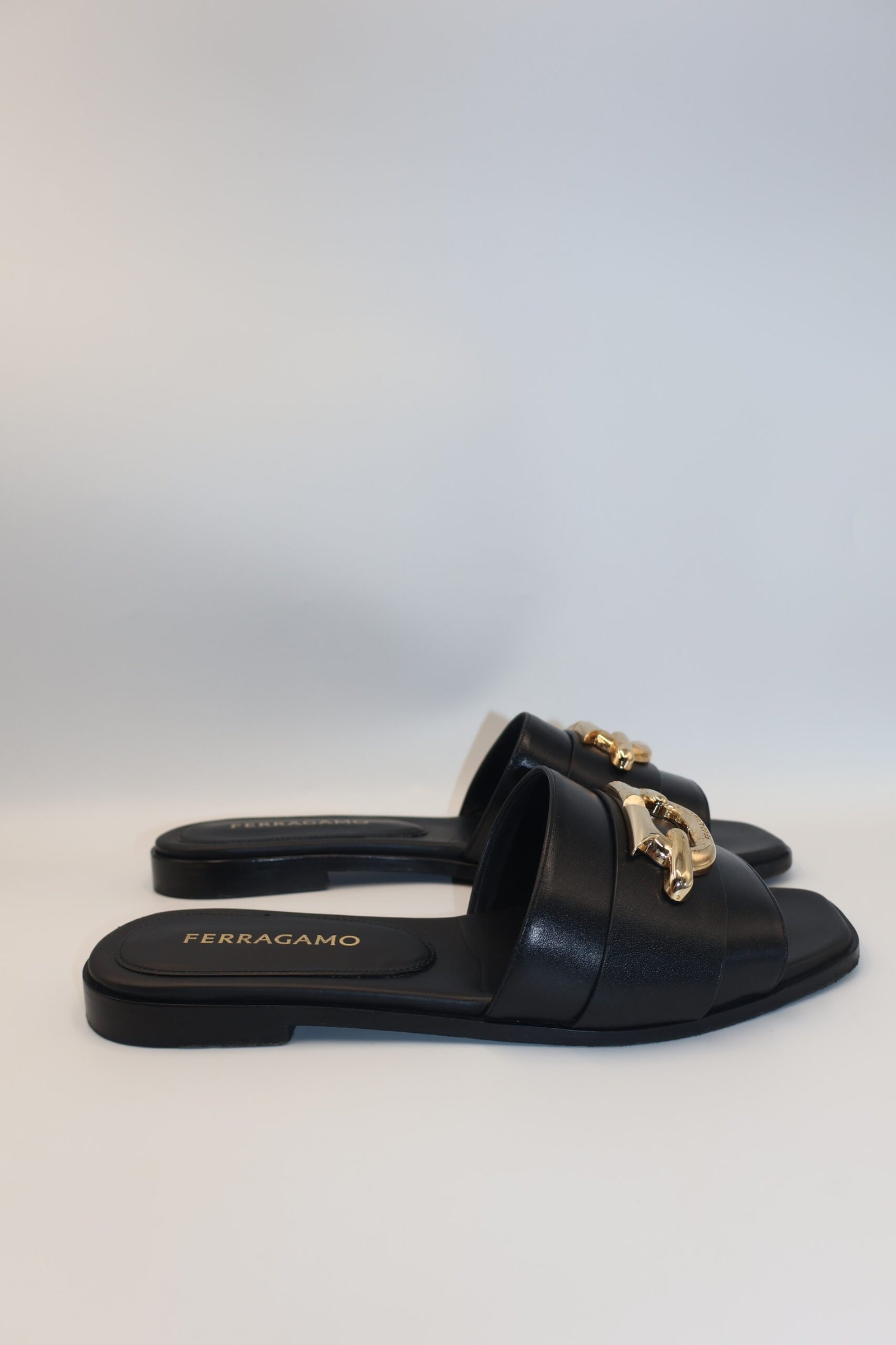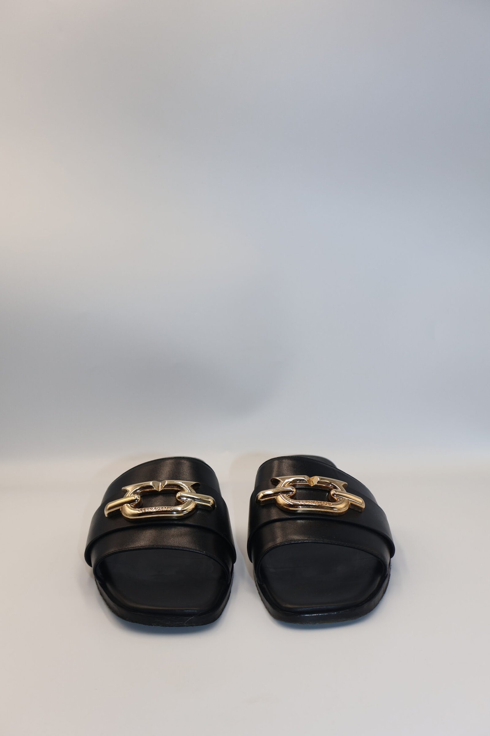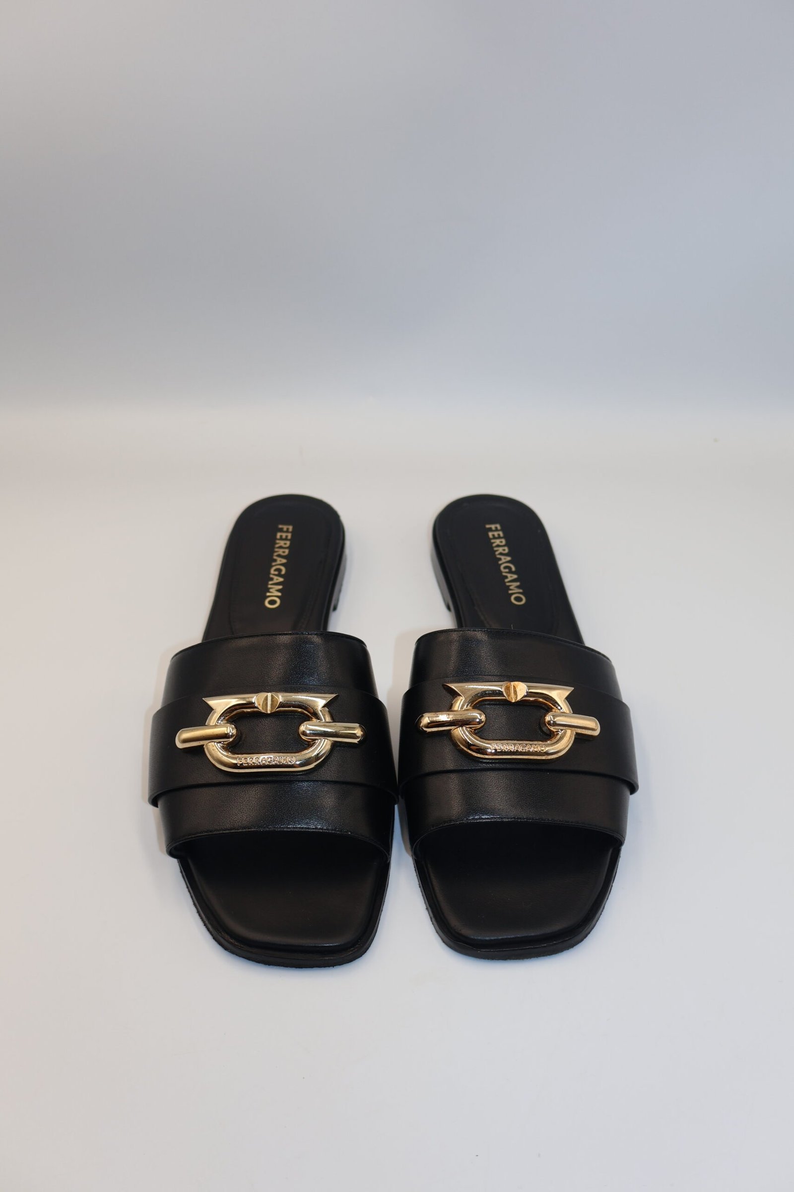 Sandalias Priscilla gancini, size 7, hechas en Italia en color negro, piel de cordero, con placas gancini en color dorado, su suela es plana, Preloved, solo incluye cubrepolvo.