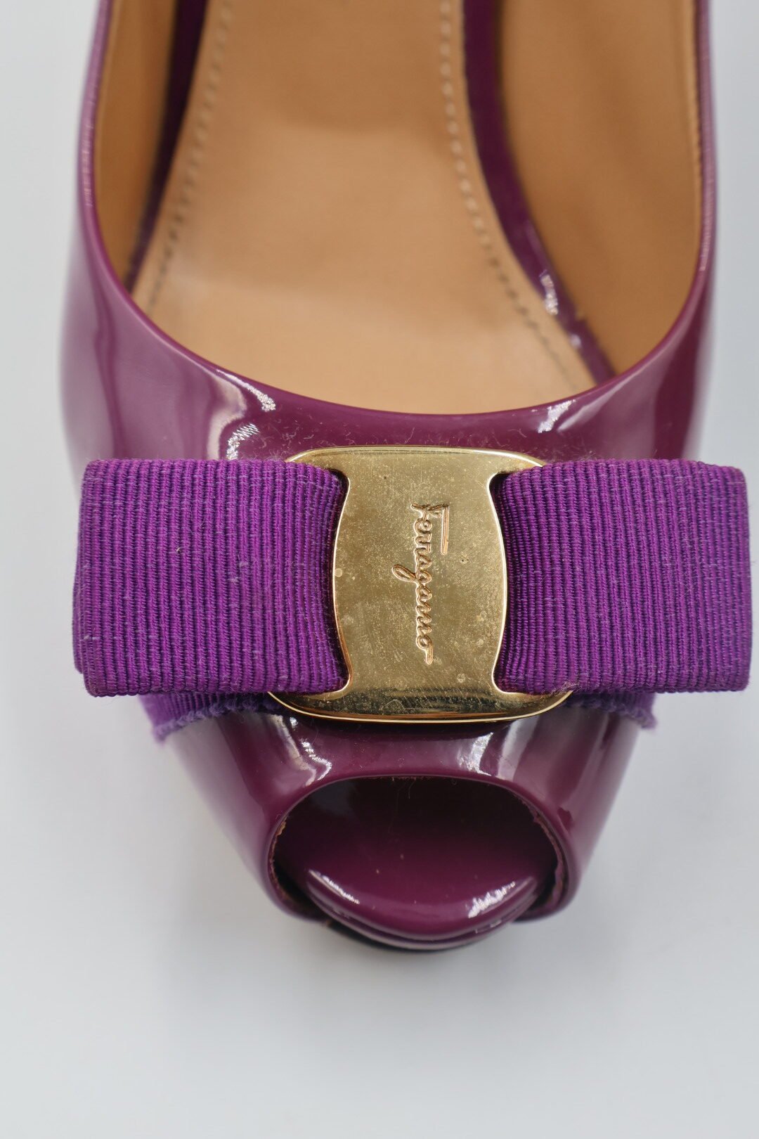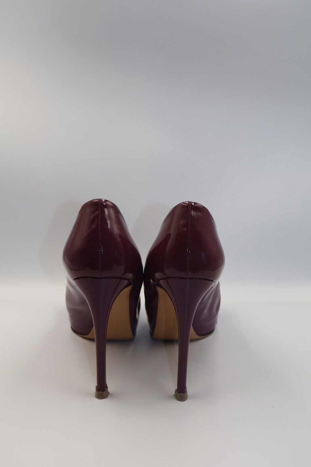Son unos tacones que están confeccionados en charol, cuentan con una puntera redonda y abierta , presentando el lazo de Vara de gosgrain en un tono morado a juego en la parte delantera, el lazo esta adornado con una placa metálica con el logotipo de la marca en color dorado, la plantilla lleva el logotipo de la marca y la suela es de cuero , vienen en talla 38, son fullset.