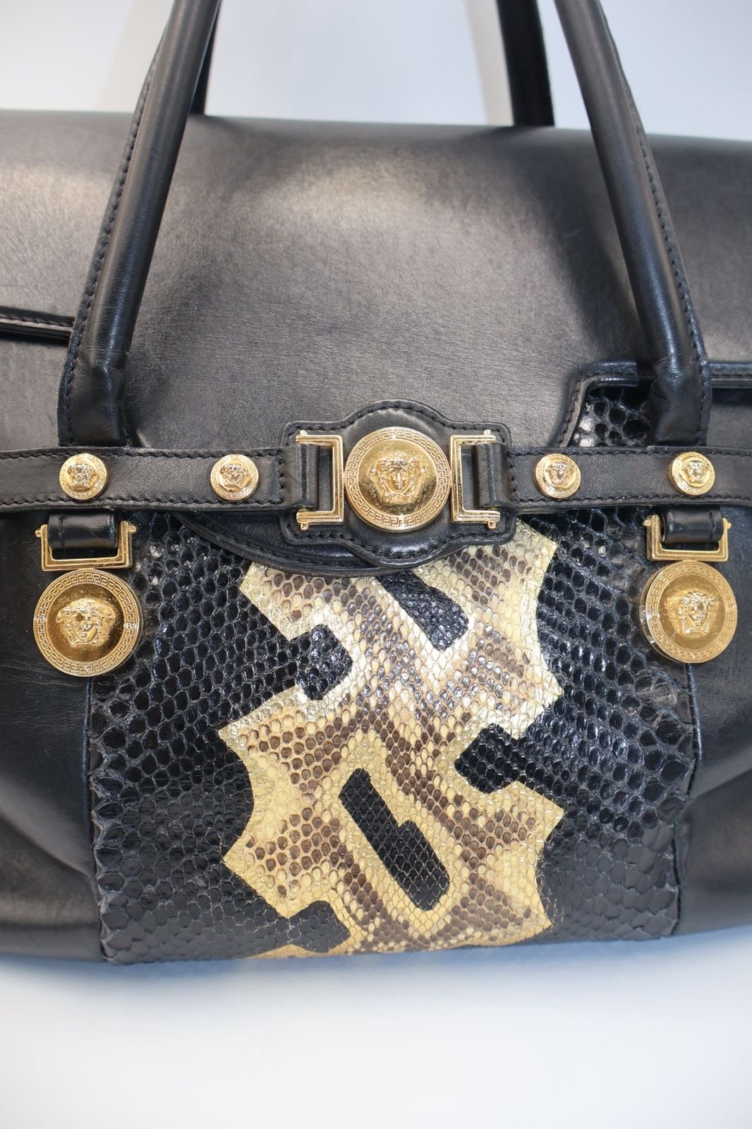 Bolso confeccionado en piel negra, con un elegante panel frontal de piel de piton, el exterior combina cuero y piel de pitón, mientras que el interior esta forrado en nailon, presenta un diseño negro predominantes negro con herrajes dorados, que incluyen tachuelas con el logotipo en relieve sobre un cinturón horizontal frontal y distintivos detalles de la cabeza de medusa, Preloved.